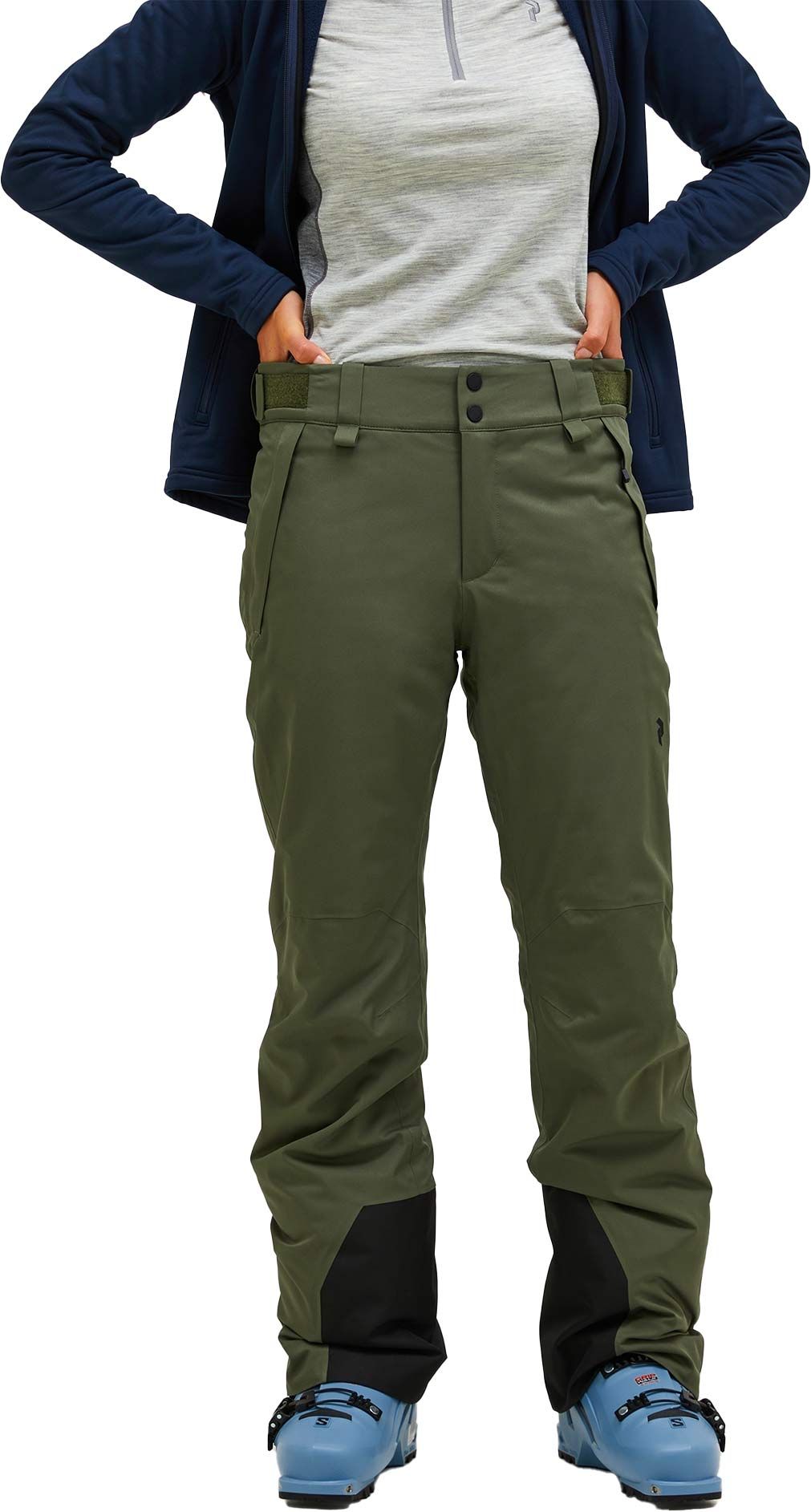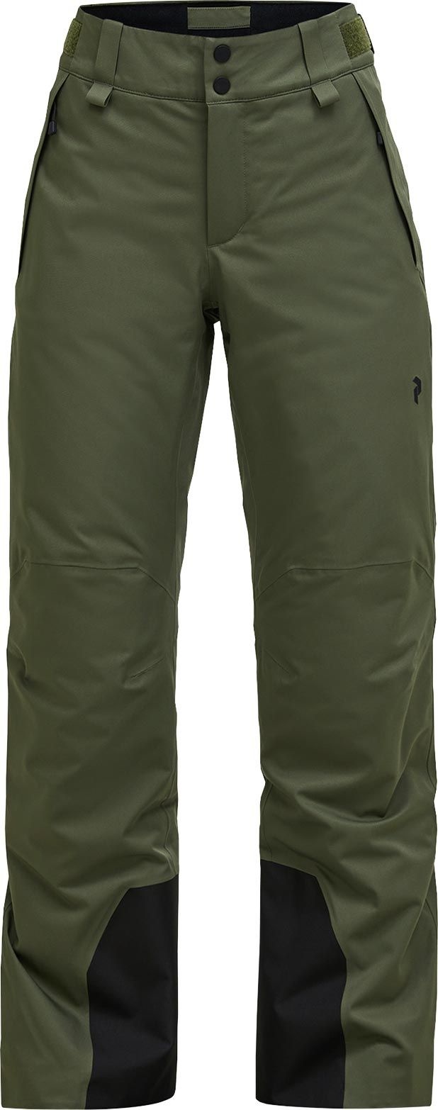 Peak Performance Anima 2L Insulated Pants Pine Needle, pantalon de ski femme coupe-vent, étanche et chaud en polyester recyclé, coutures scellées, guêtres pare-neige, taille réglable et jambes articulées pour liberté de mouvement.