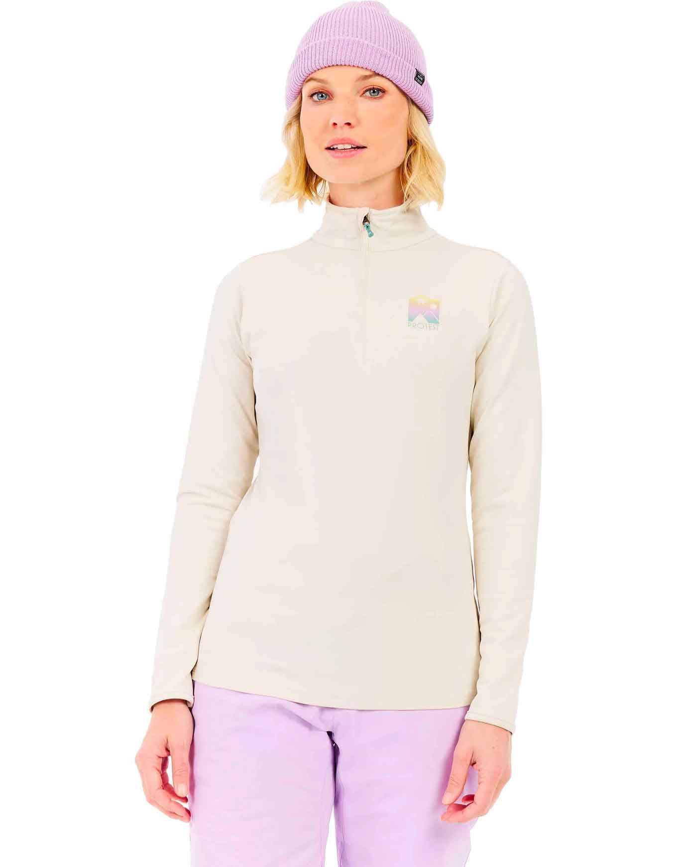 Sous-pull femme Protest Prtgentle 1/4 Zip Active Top en tissu thermo stretch recyclé PVRE Green beige, régule chaleur et humidité, col montant zippé, coupe standard.