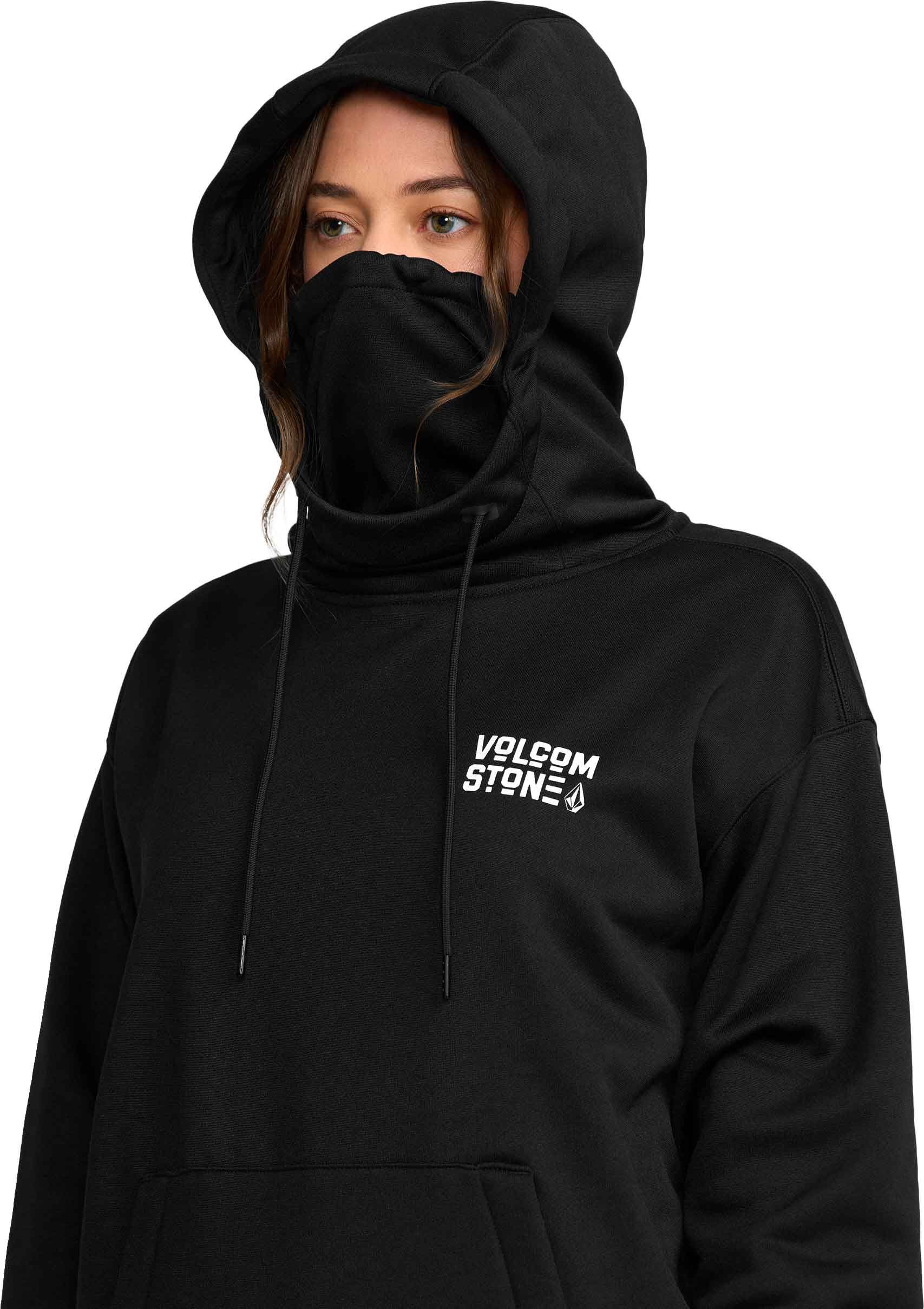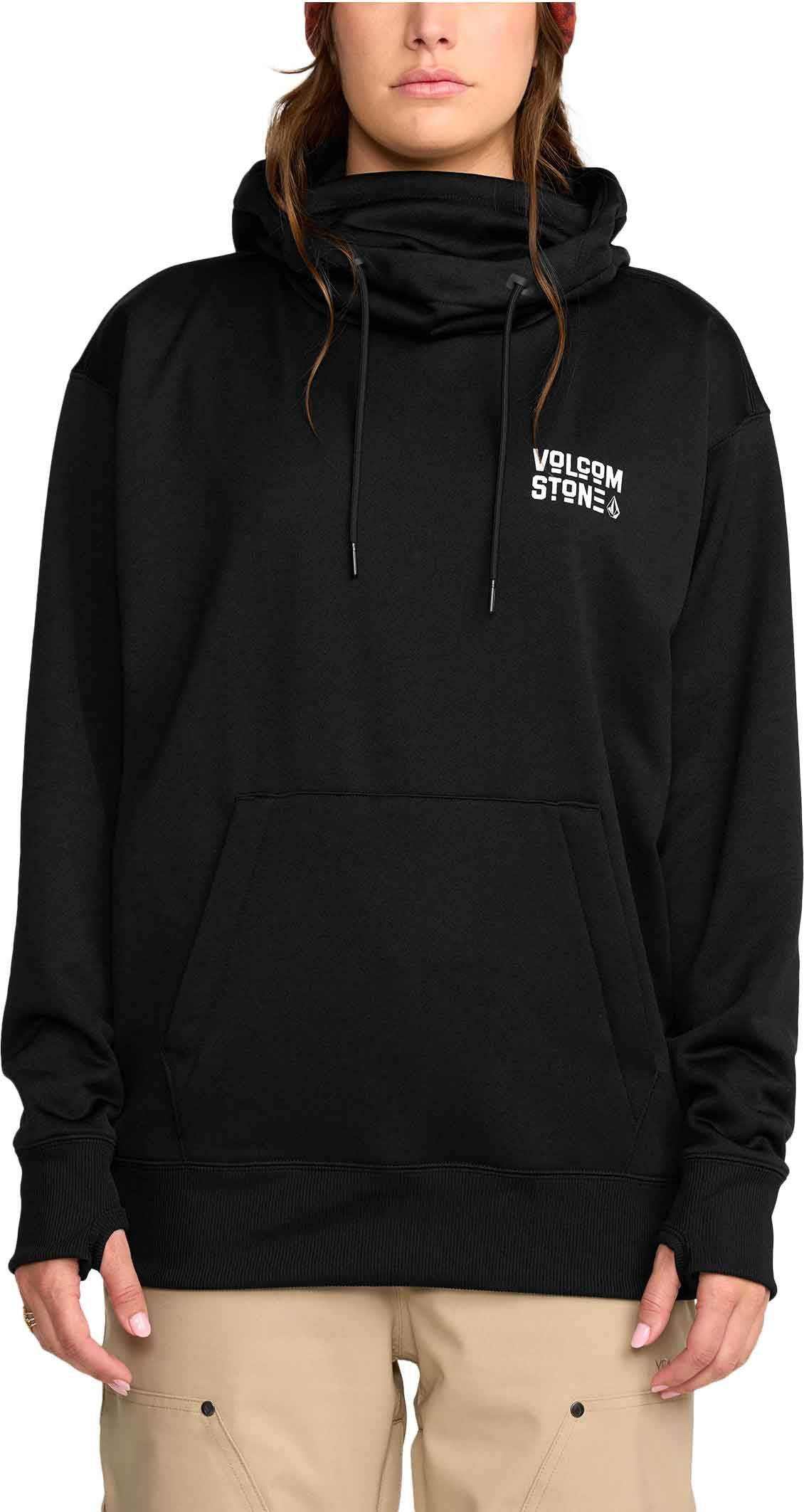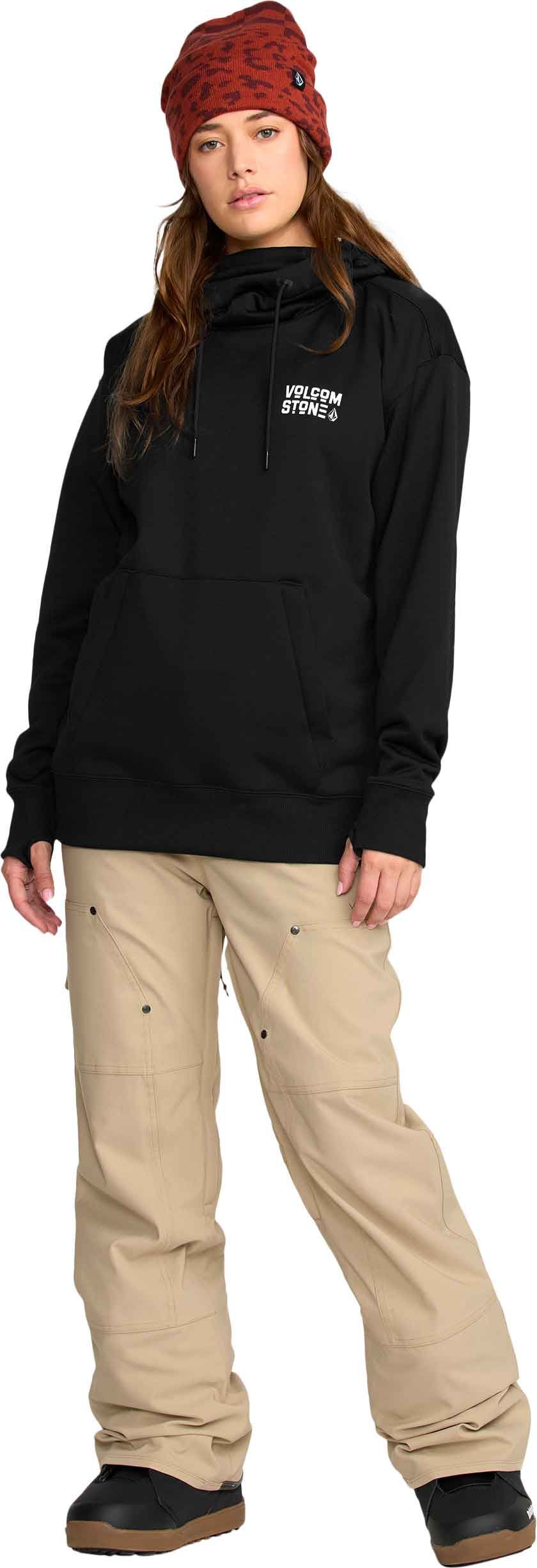 Sweat à capuche femme Volcom Riding Hydro P/O Bone en polaire hydrophobe, léger et respirant, avec capuche réglable, cache-cou, poche chauffe-mains zippée et poignets côtelés pour liberté de mouvement et protection contre l’humidité.
