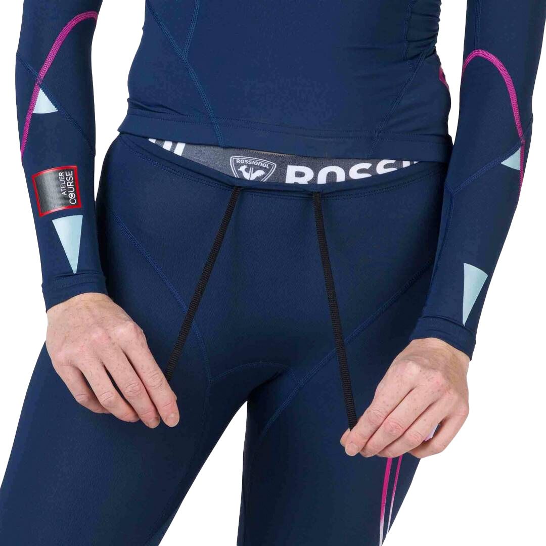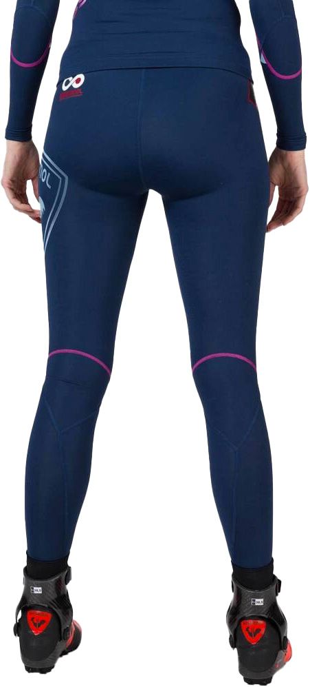 Collant Rossignol Infini Compression Race Tights femme en tissu stretch respirant navy, technologie compression brevetée pour optimiser l’alignement musculaire, réduire fatigue et améliorer performance ski de fond.