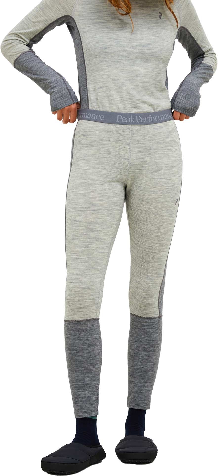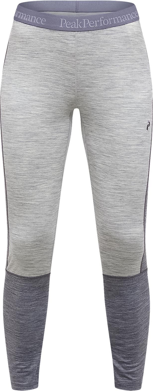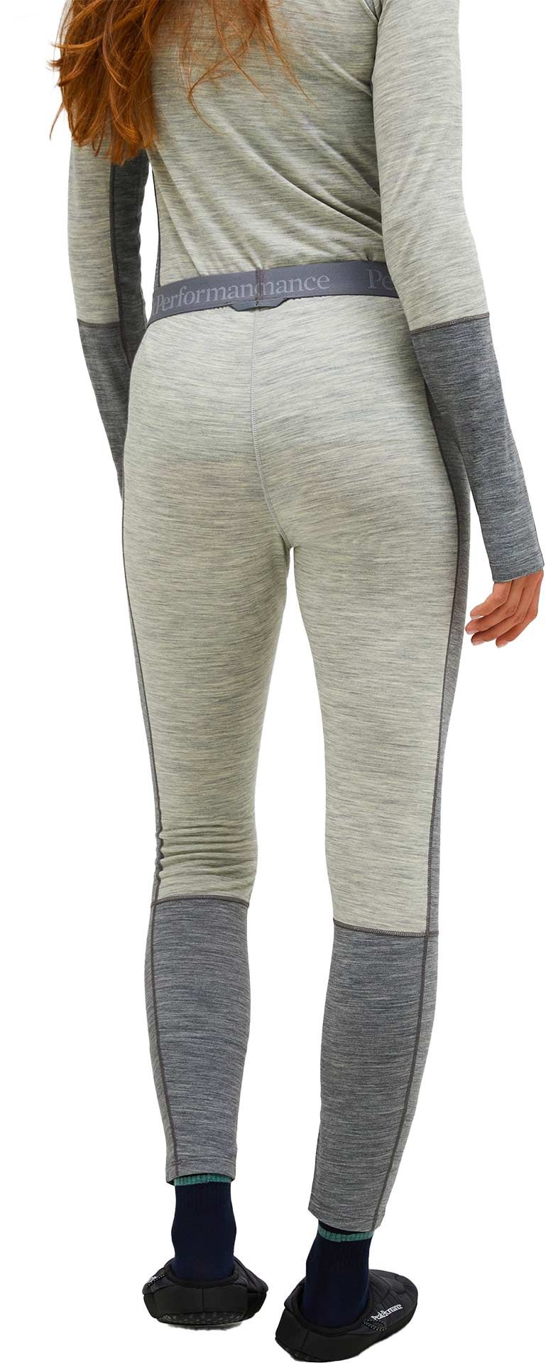 Le collant Magic Long Johns Baselayer Med Grey Melange Peak Performance pour femme combine laine mérinos et polyester durable pour un confort optimal et un contrôle thermique efficace en première couche hivernale.