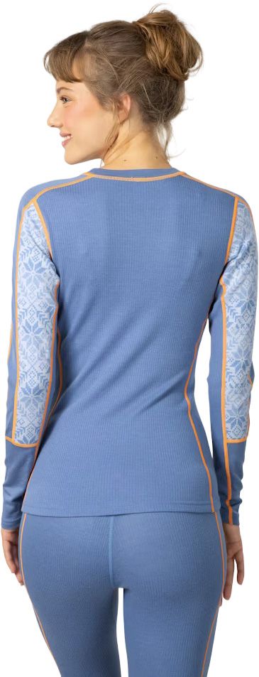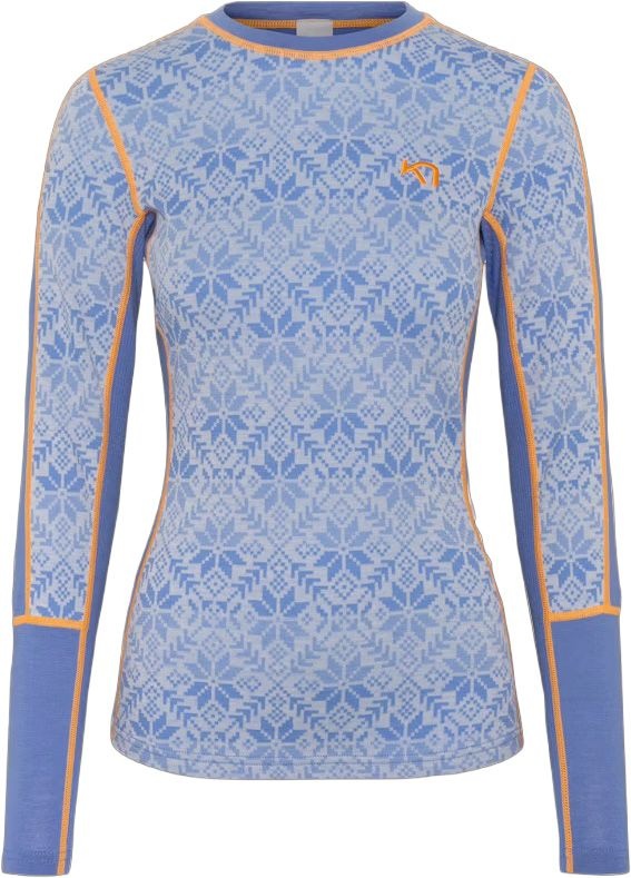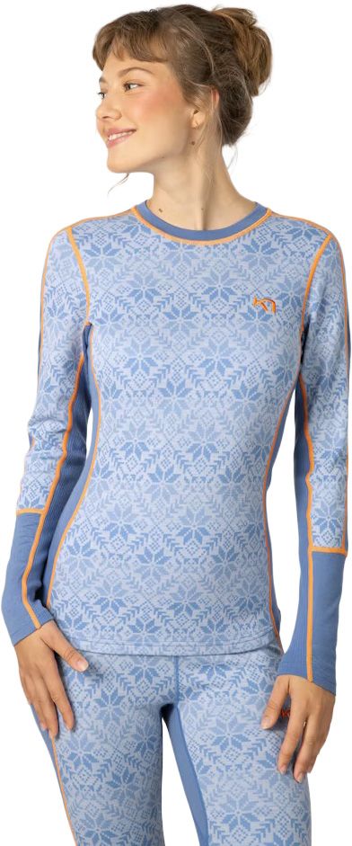 Kari Traa Anna Long Sleeve Sea, première couche technique femme en laine mérinos, respirante et anti-odeurs, garde au chaud même humide avec coutures plates et manches raglan pour un confort et une liberté de mouvement optimaux.