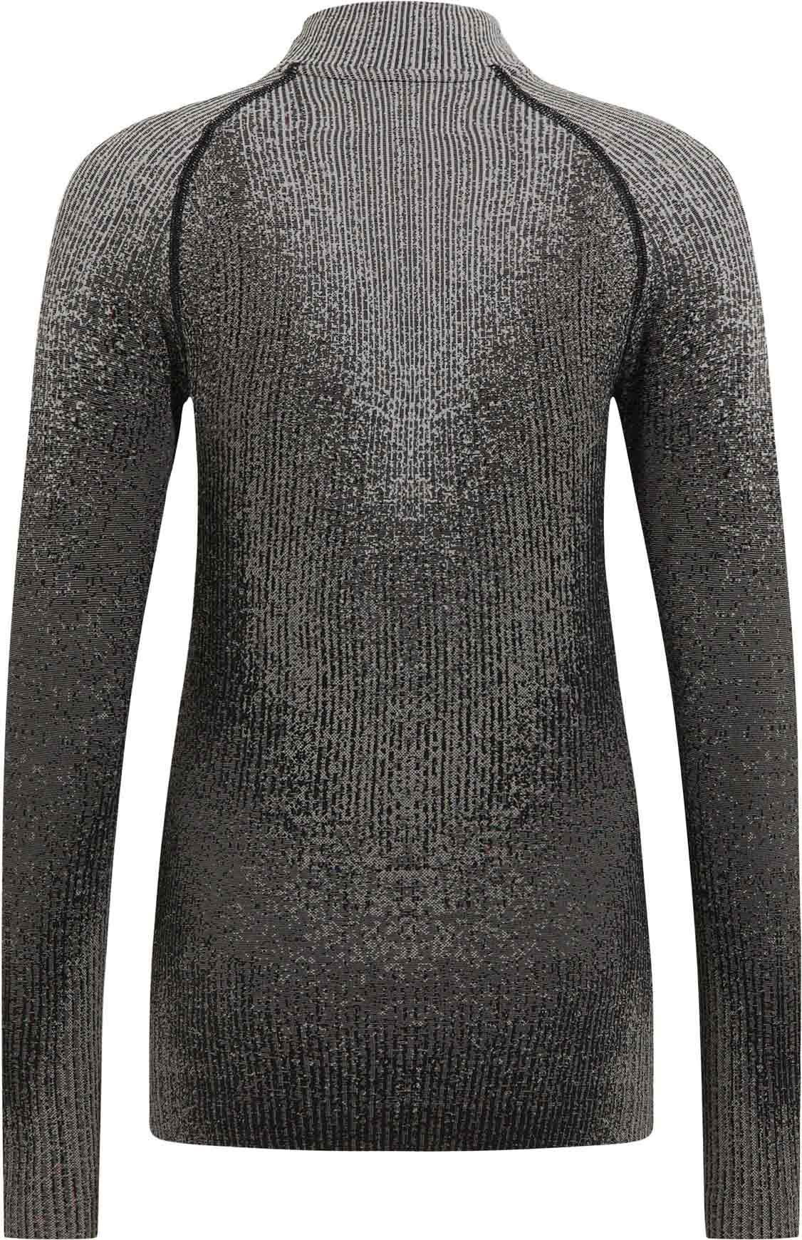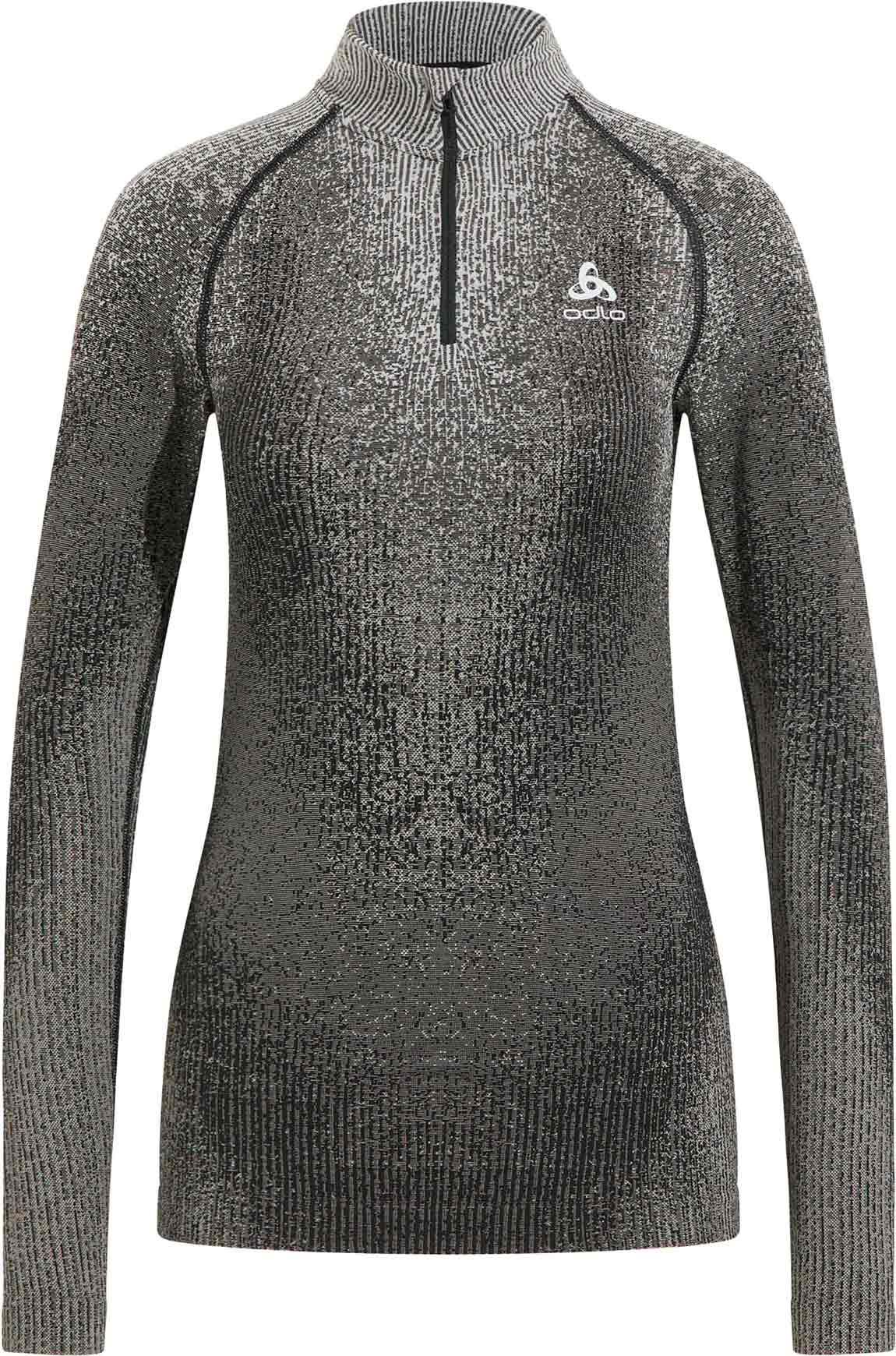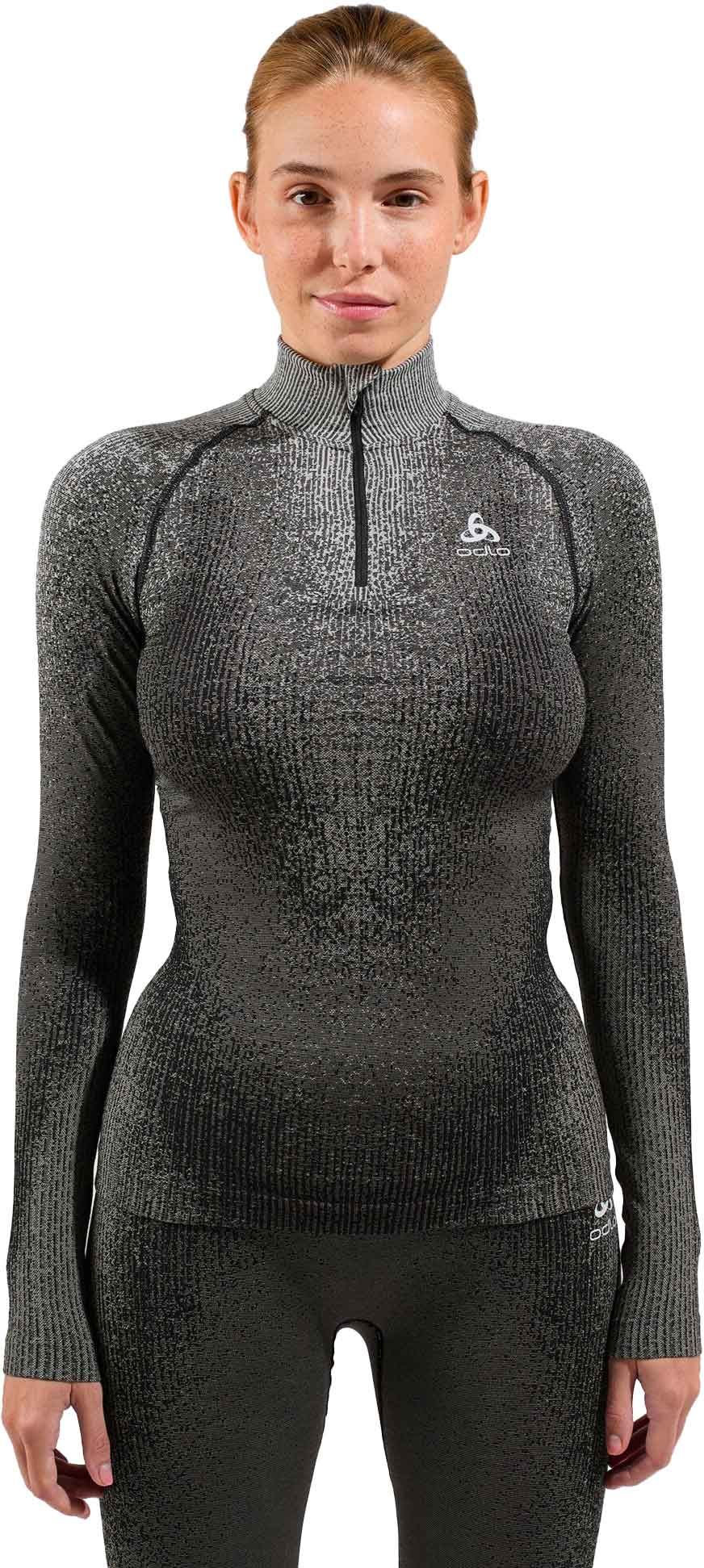 Le tee-shirt technique Performance Warm Blackcomb d’Odlo pour femme, à col montant zippé, offre chaleur, respirabilité et liberté de mouvement lors des activités hivernales intensives.