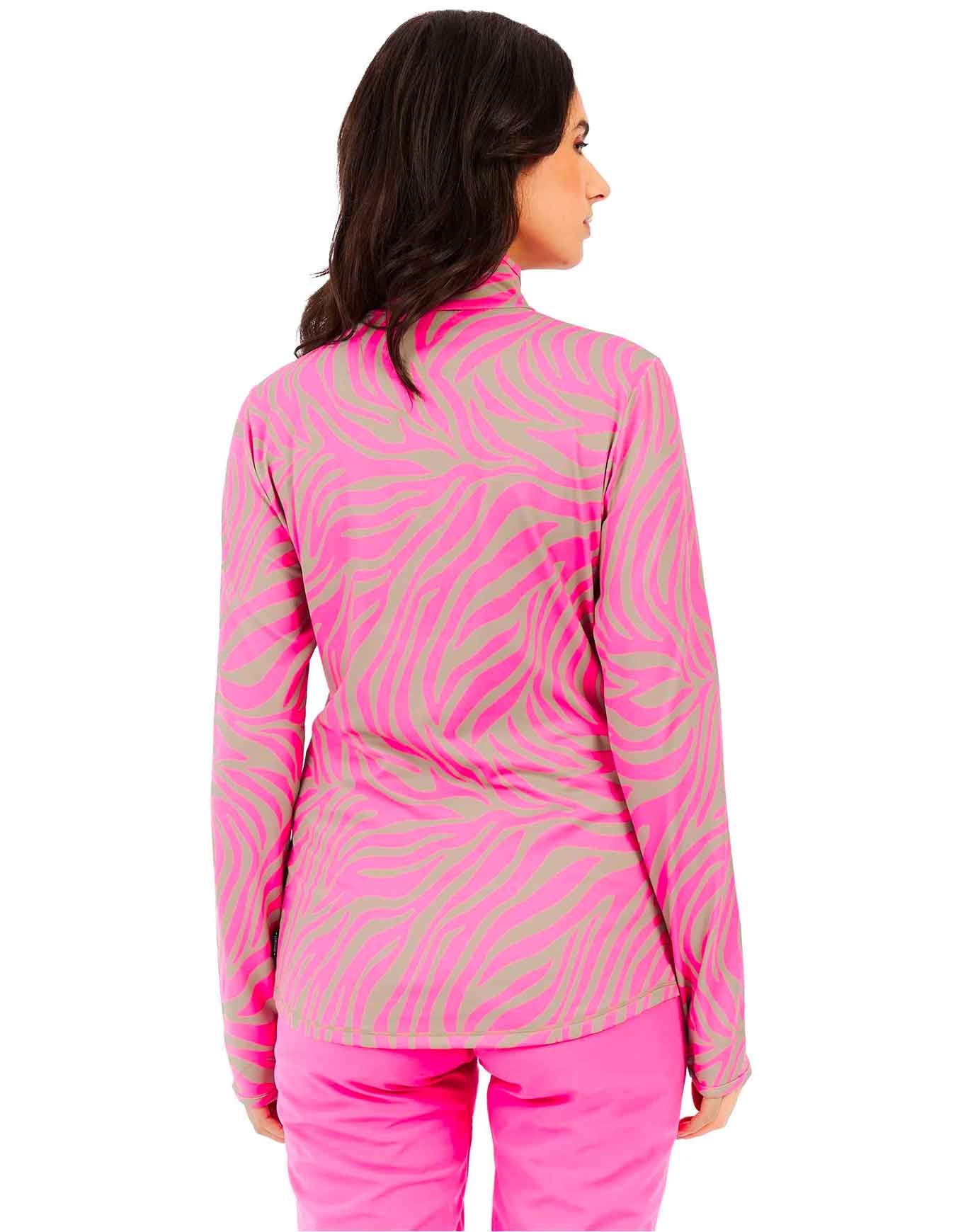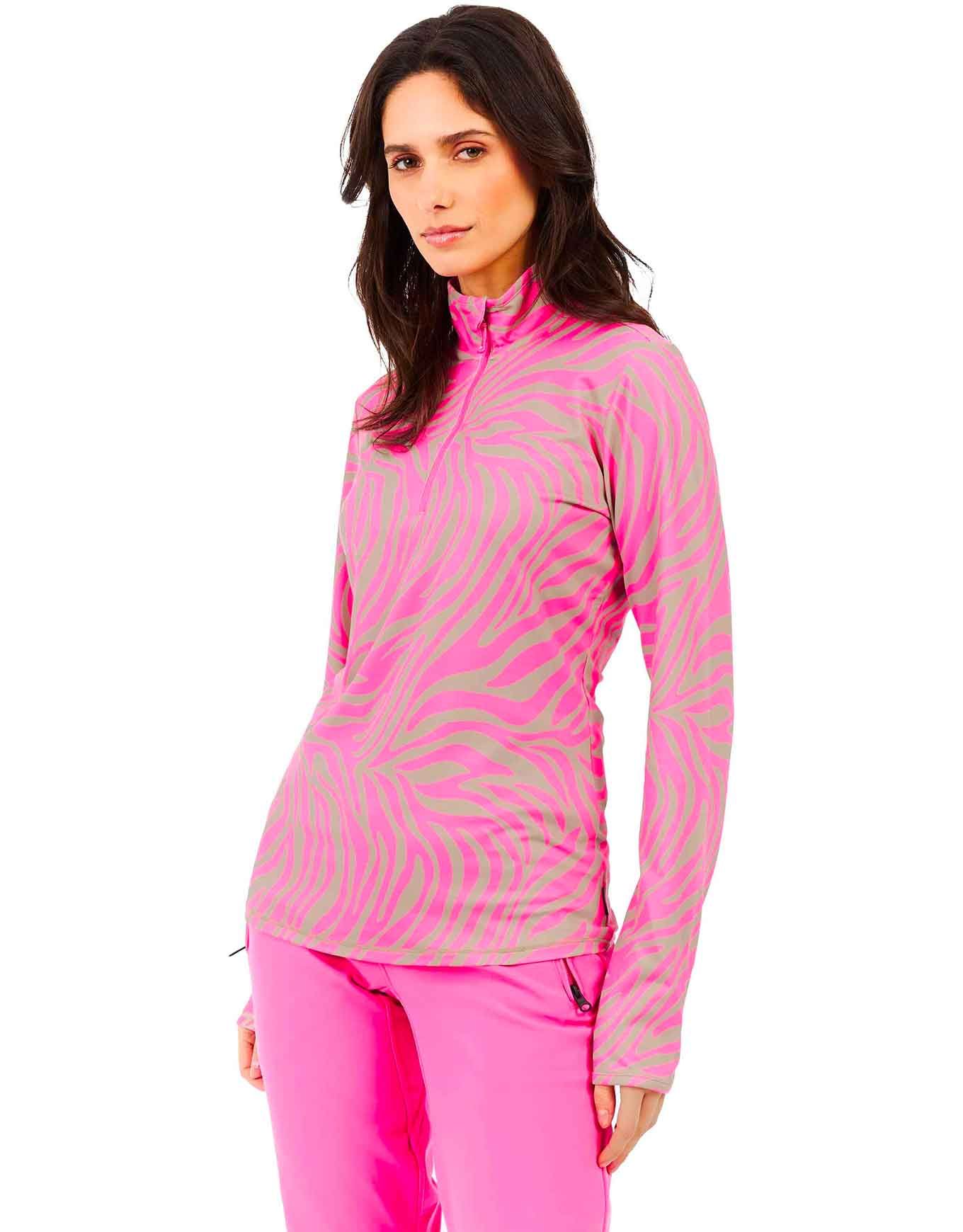 Protest Prtesher 1/4 Zip Active Top Foxy Pink, sous-pull femme en polyester recyclé et élasthanne GEOTECH thermo stretch, régule la chaleur et offre liberté de mouvement. Col montant, fermeture éclair inversée, coupe standard idéale en couche intermédiaire hivernale.