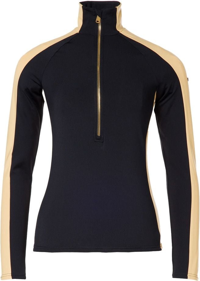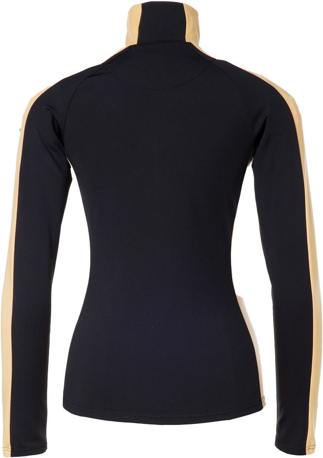 Première couche Royal Black/Gold Goldbergh femme en polyester recyclé, anti-odeurs et évacuant l’humidité pour le ski par temps froid. Coupe près du corps extensible, zip semi-intégral, manches raglan, bandes brillantes.