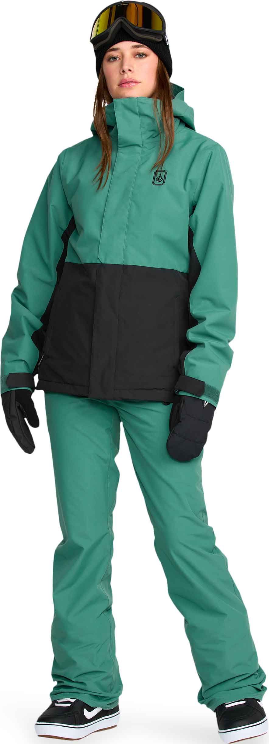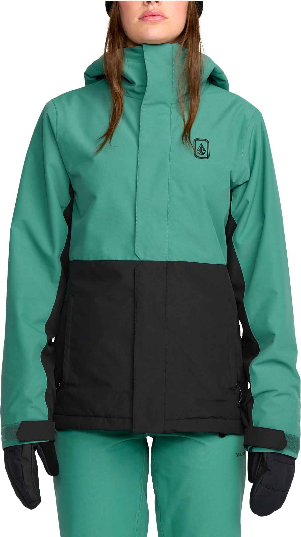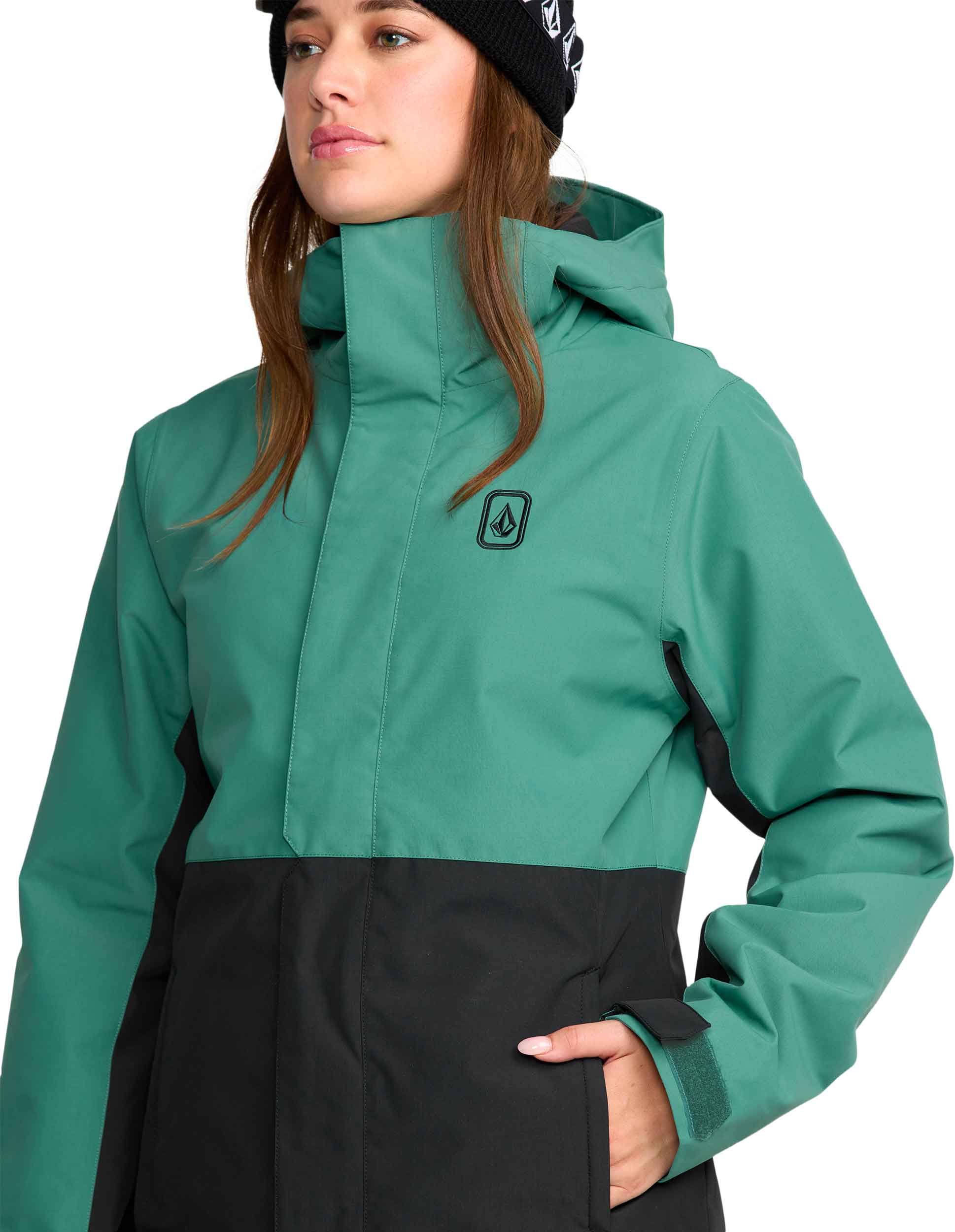 Veste ski femme Volcom Bolt Insulated Jacket Spruce Green, coupe ajustée avec Zip Tech® intégral, capuche fine, jupe pare-neige et poches chauffe-mains doublées.