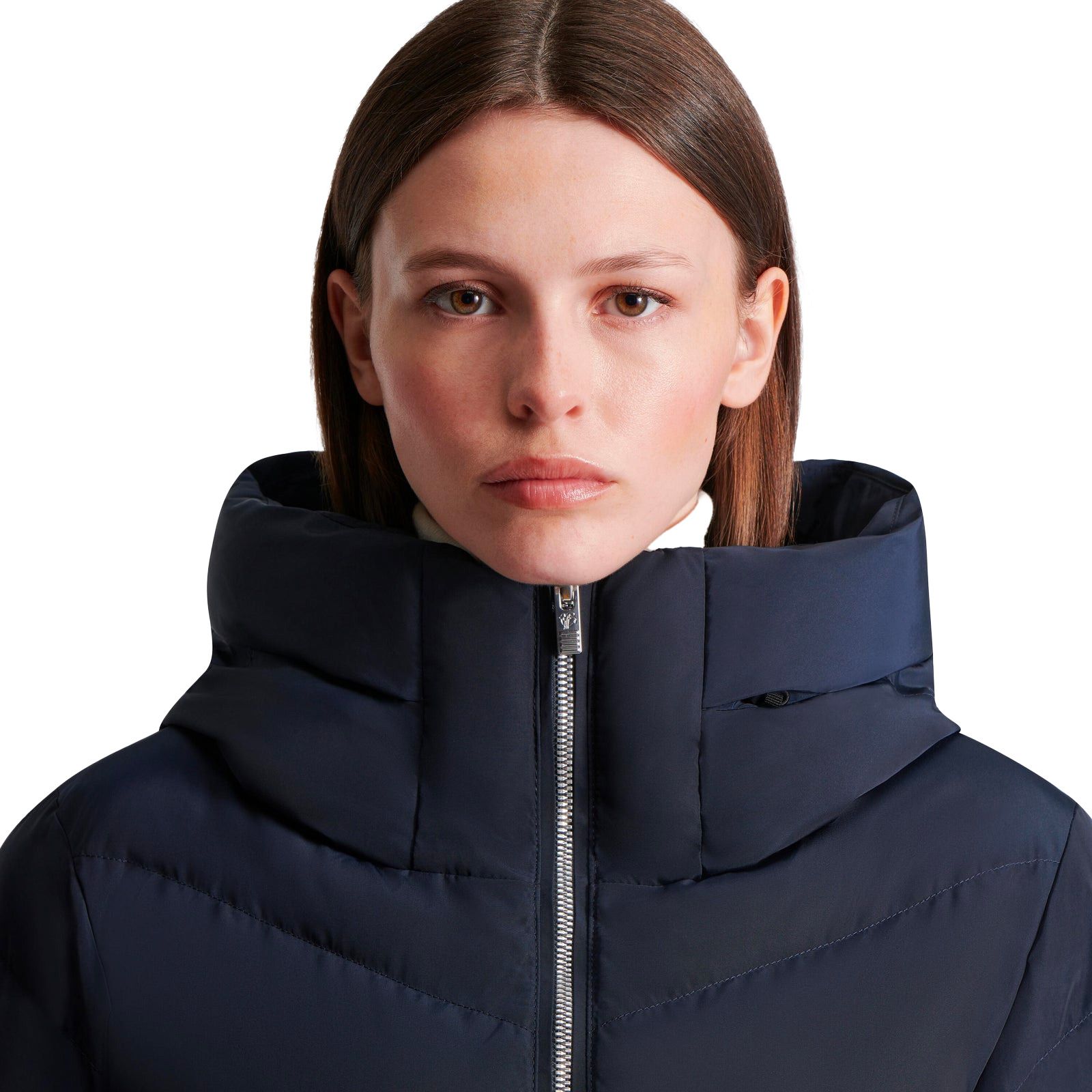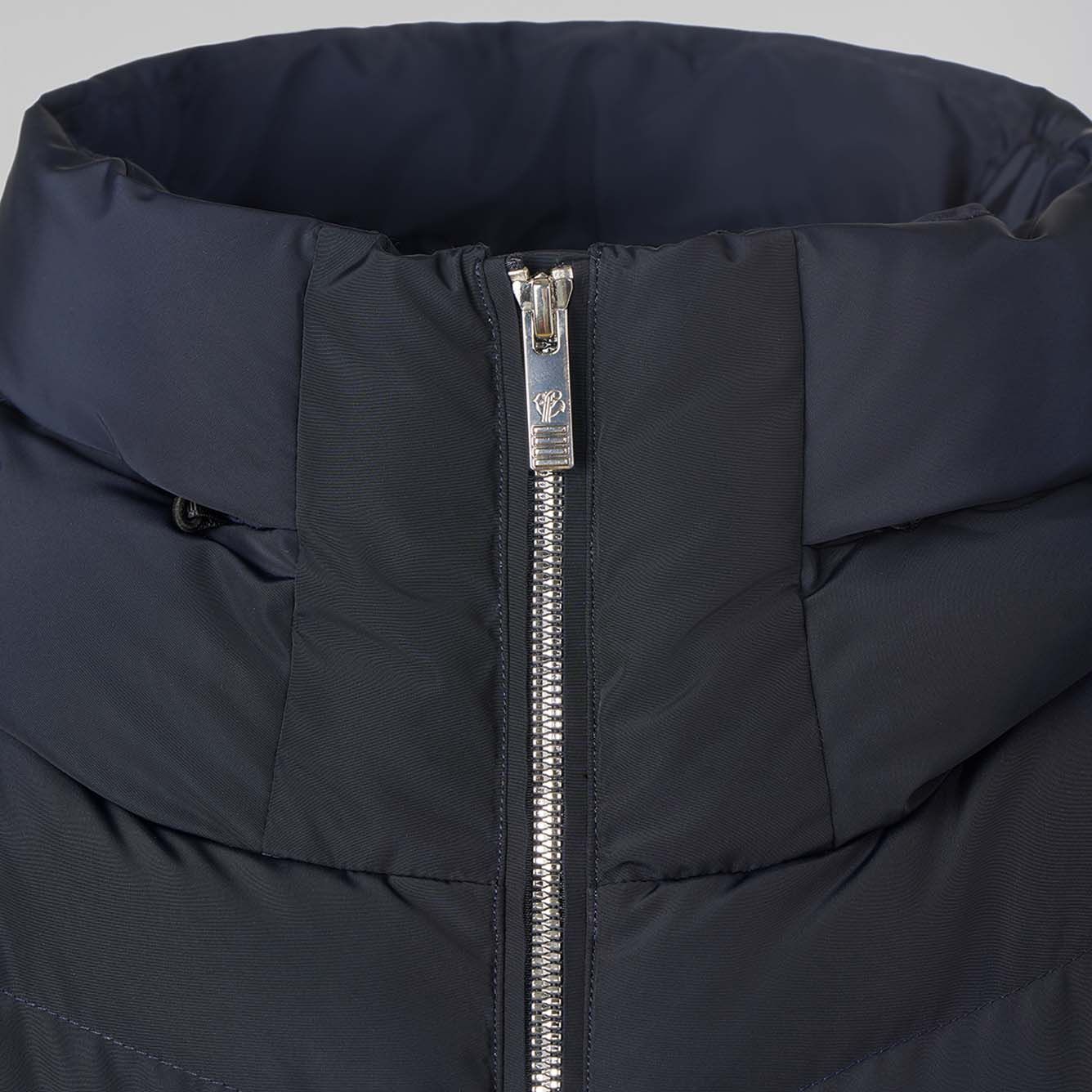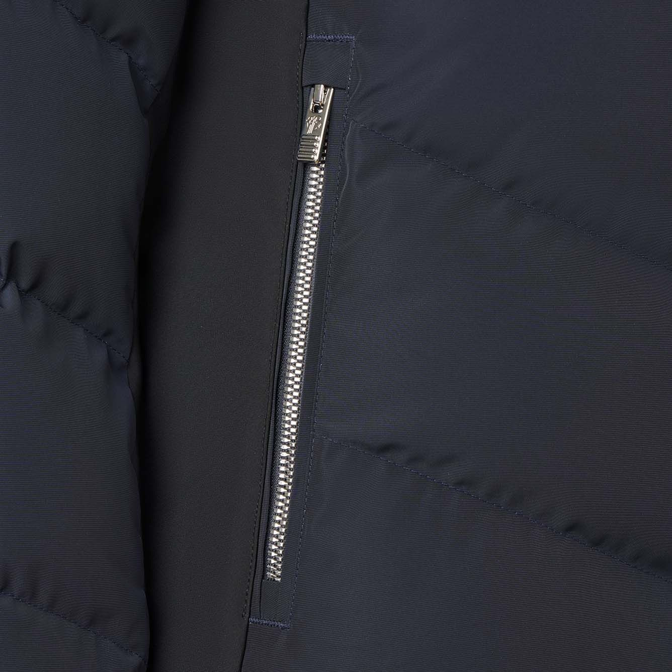 La veste de ski Delphine II Marin de Fusalp allie membrane Perfortex™ imperméable et isolation Dupont® Sorona® pour femme. Jupe pare-neige et tissu satiné assurent protection et élégance sur piste.