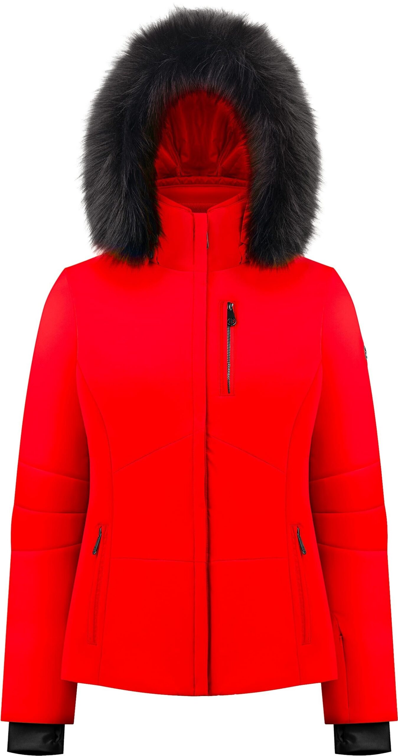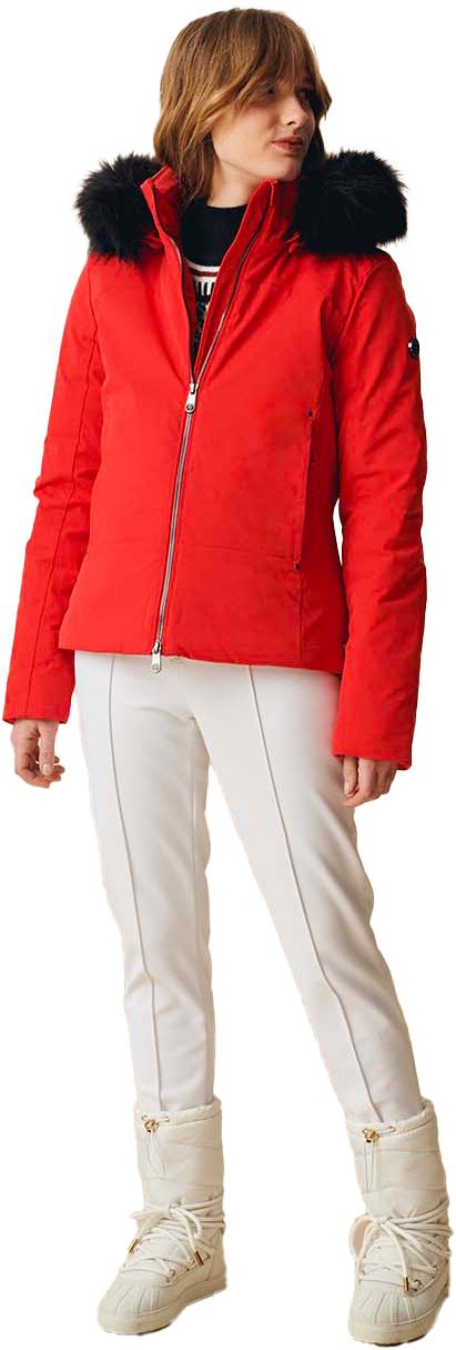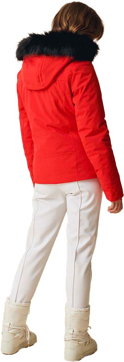 Veste de ski femme Poivre Blanc Emma Ski Jacket Scarlet Red : tissu 4-way stretch, membrane imper-respirante, capuche amovible à fausse fourrure, jupe pare-neige élastique et poches YKK® pour liberté de mouvement et protection sur les pistes.