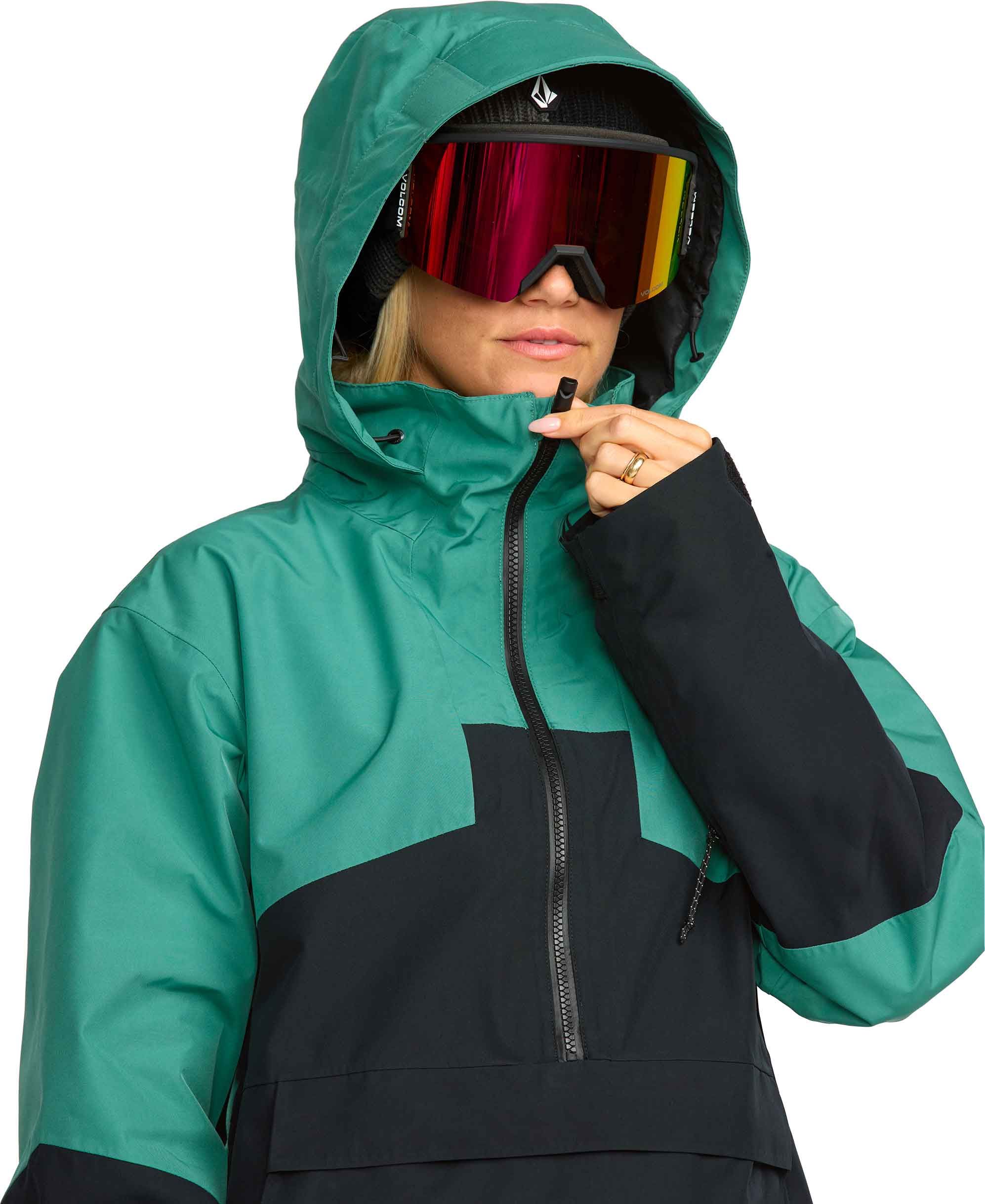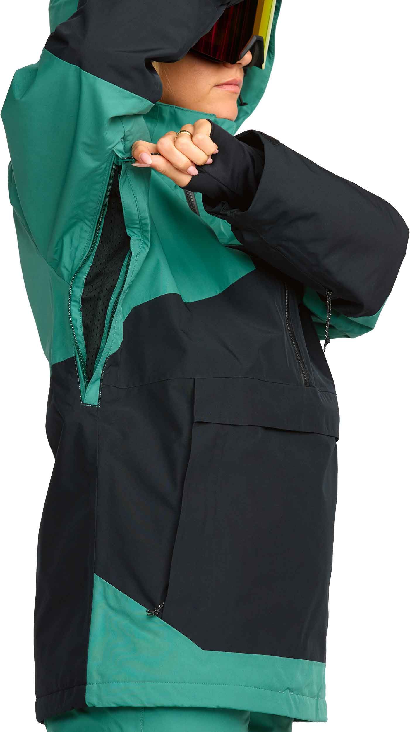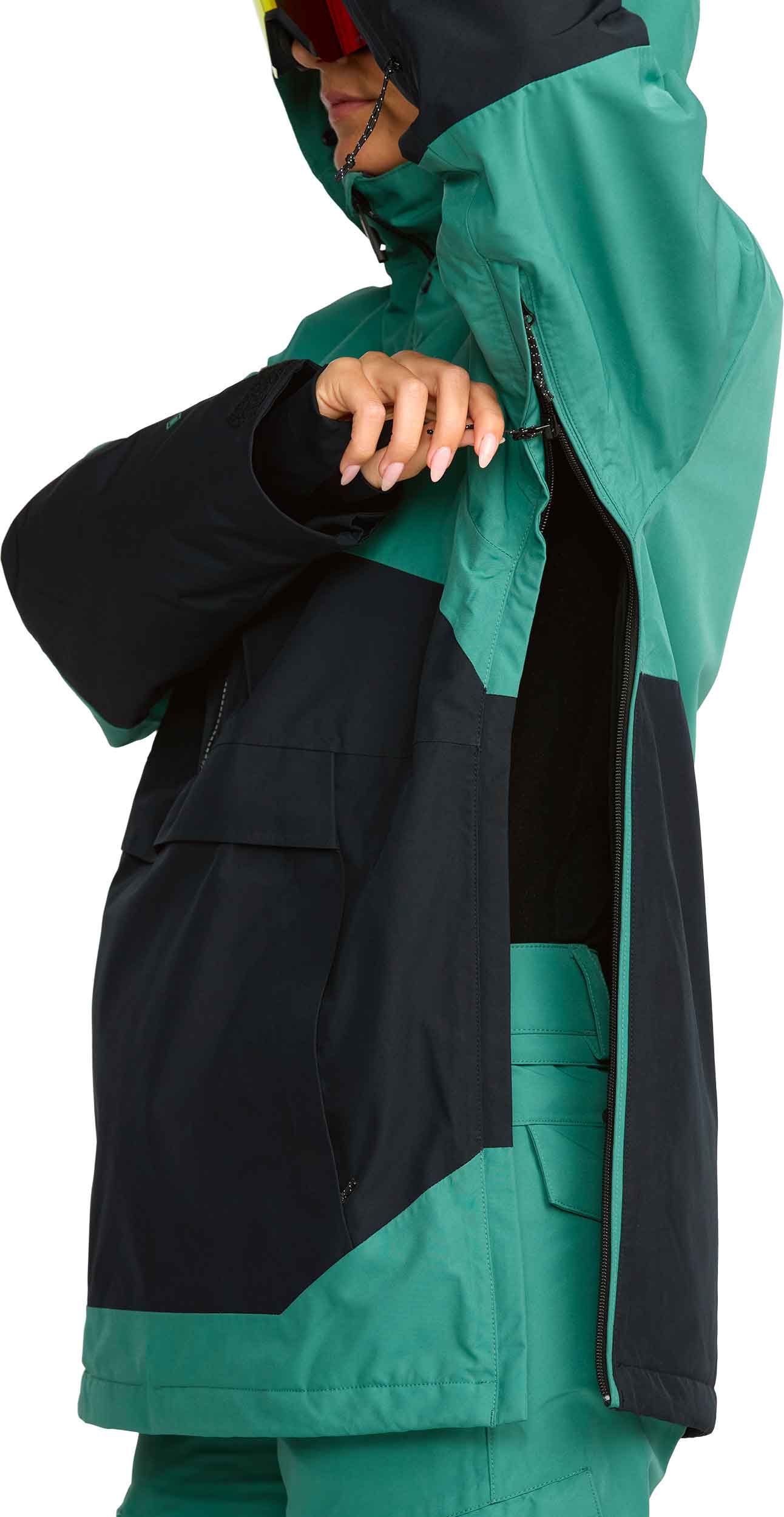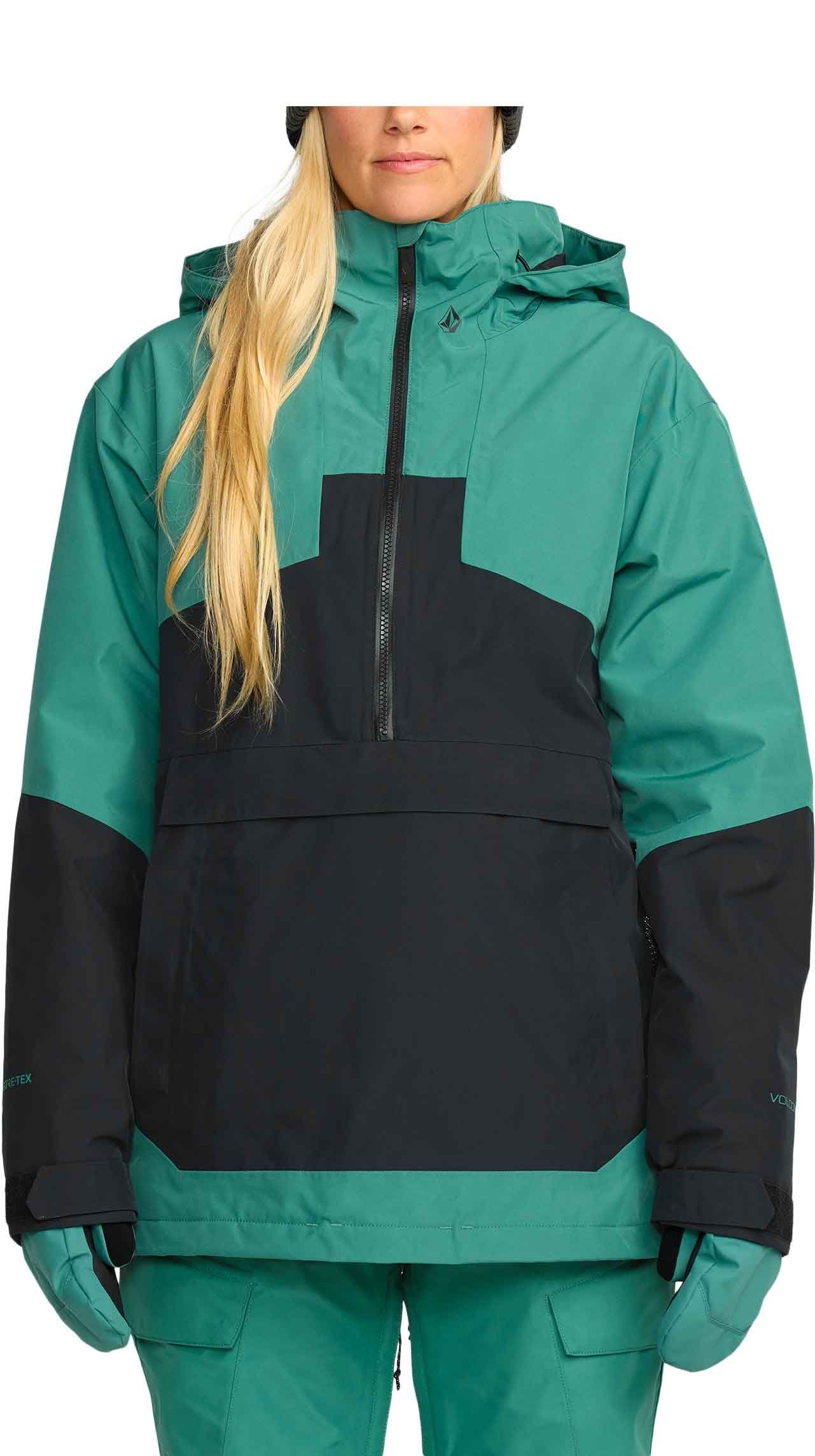 Veste ski femme Volcom Fern Insulated Gore-Tex Pullover Spruce Green, membrane GORE-TEX ePE 2 couches recyclée, isolation thermique, Zip Tech® veste-pantalon, zips ventilation, capuche ajustée, jupe pare-neige.