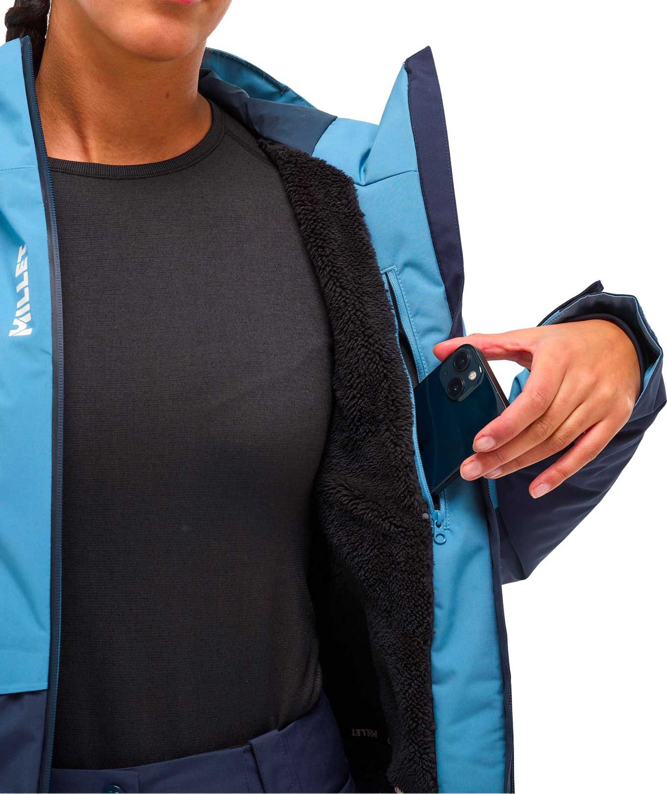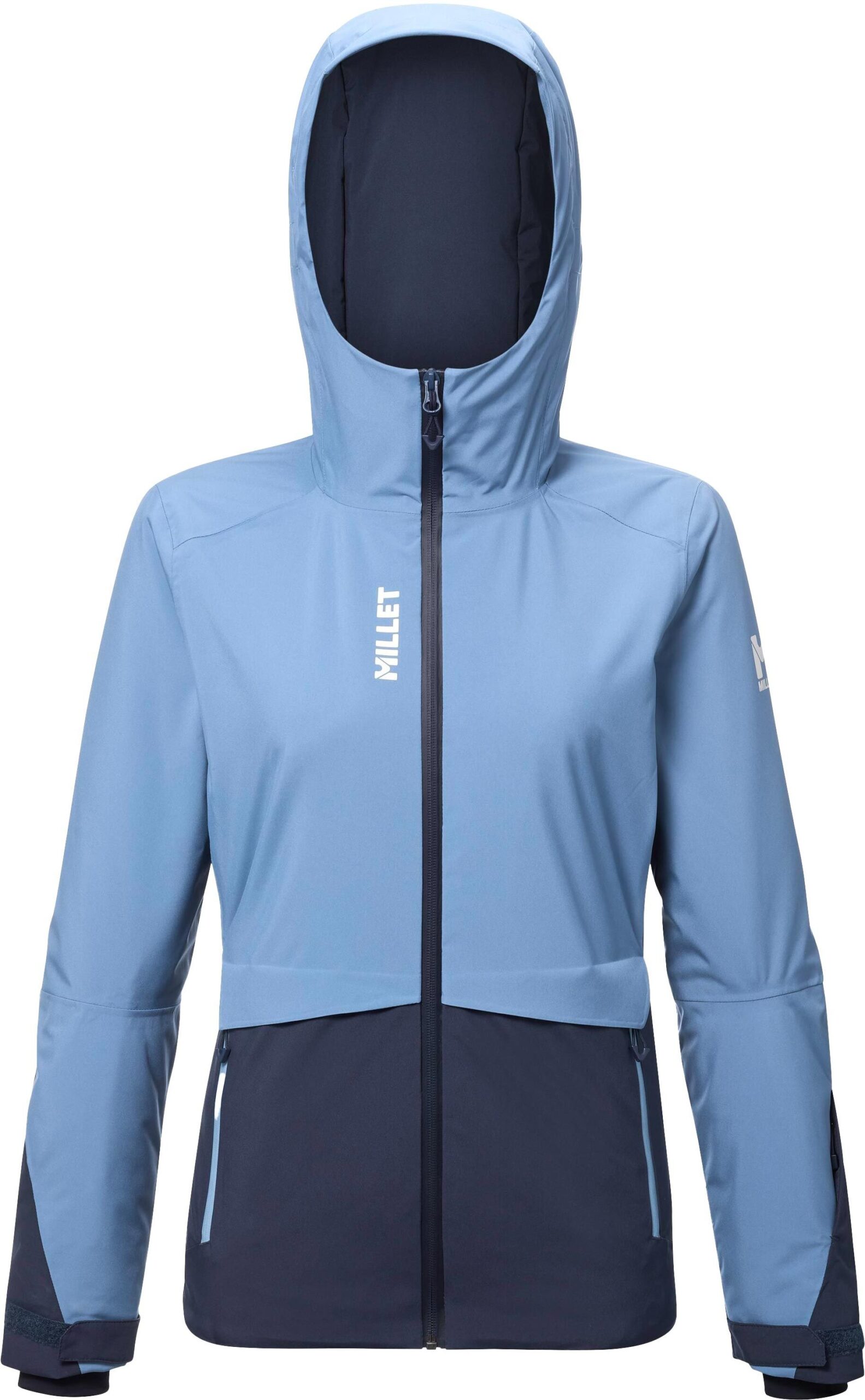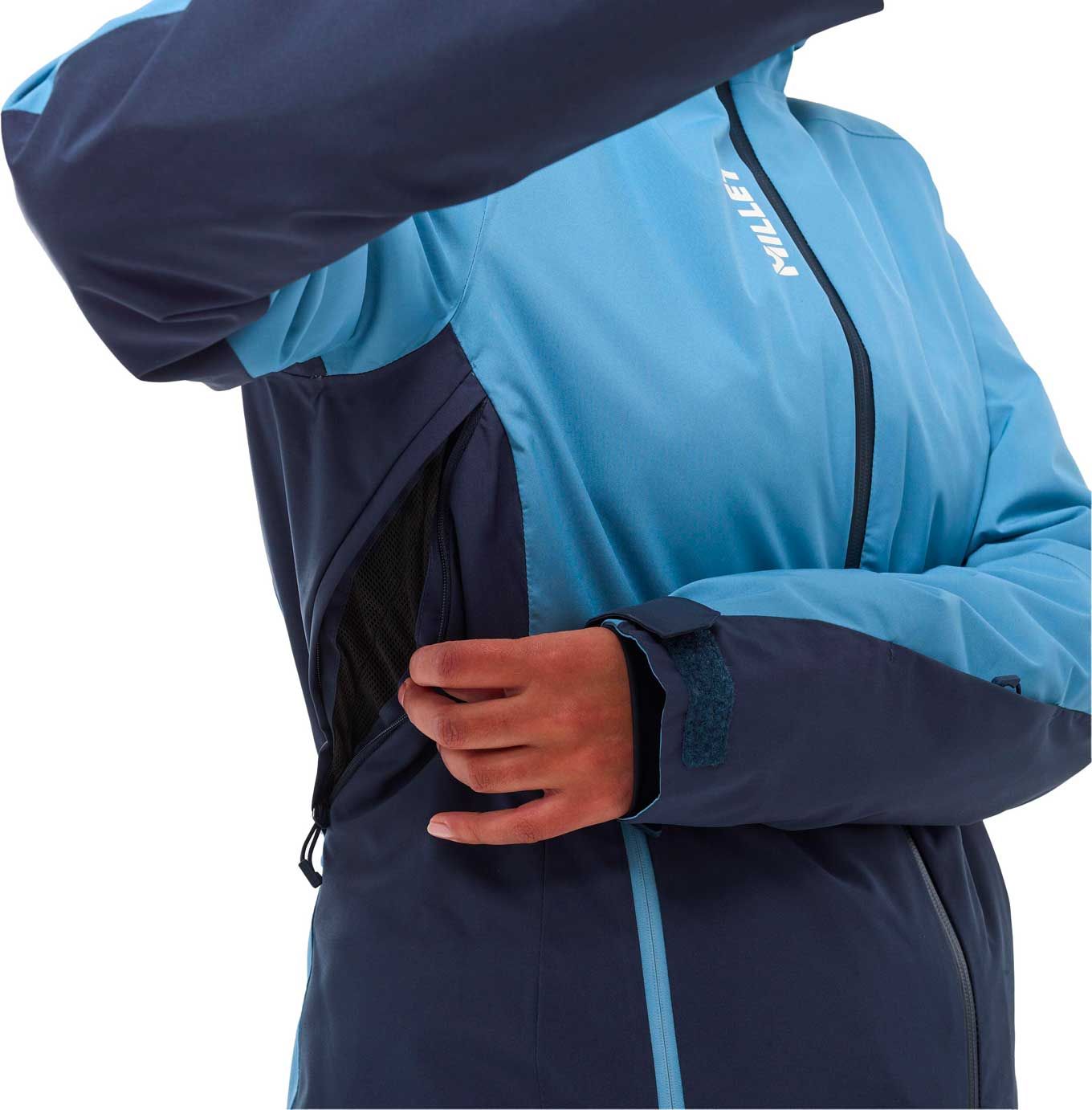La veste de ski Millet Grands Montets Jkt Coronet Blue Saphir pour femme allie membrane DRYEDGE™ imperméable-respirante, isolation REPREVE® recyclée zonale et coutures thermosoudées pour une protection ciblée sur les pistes.