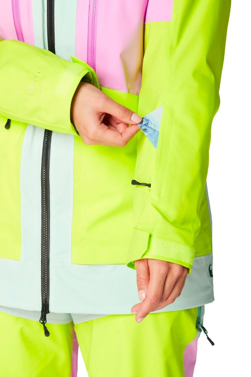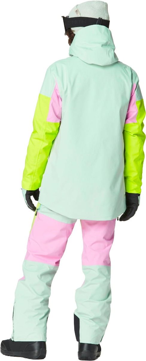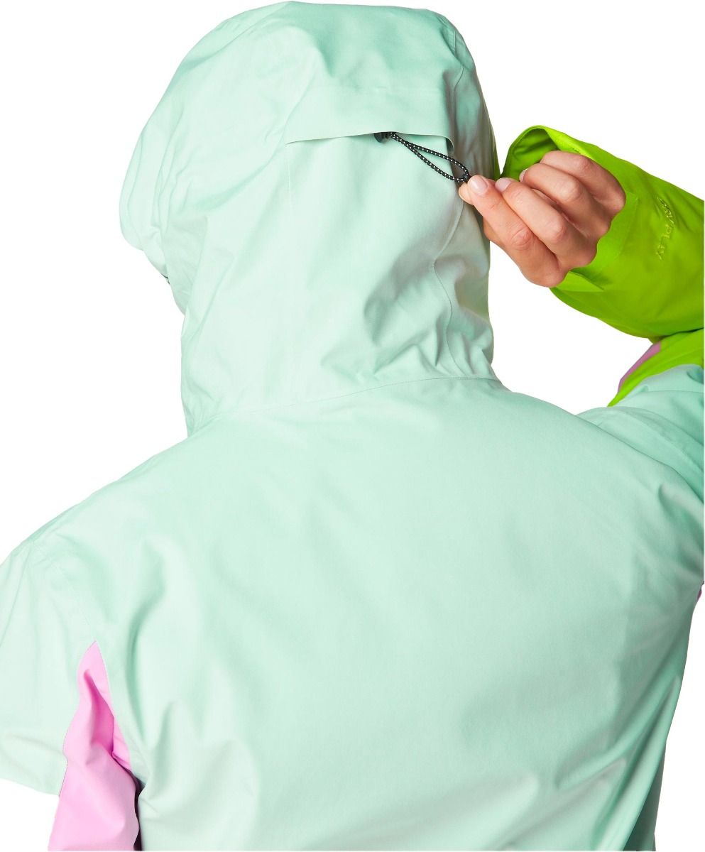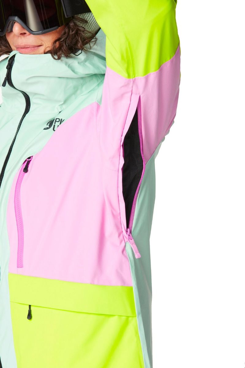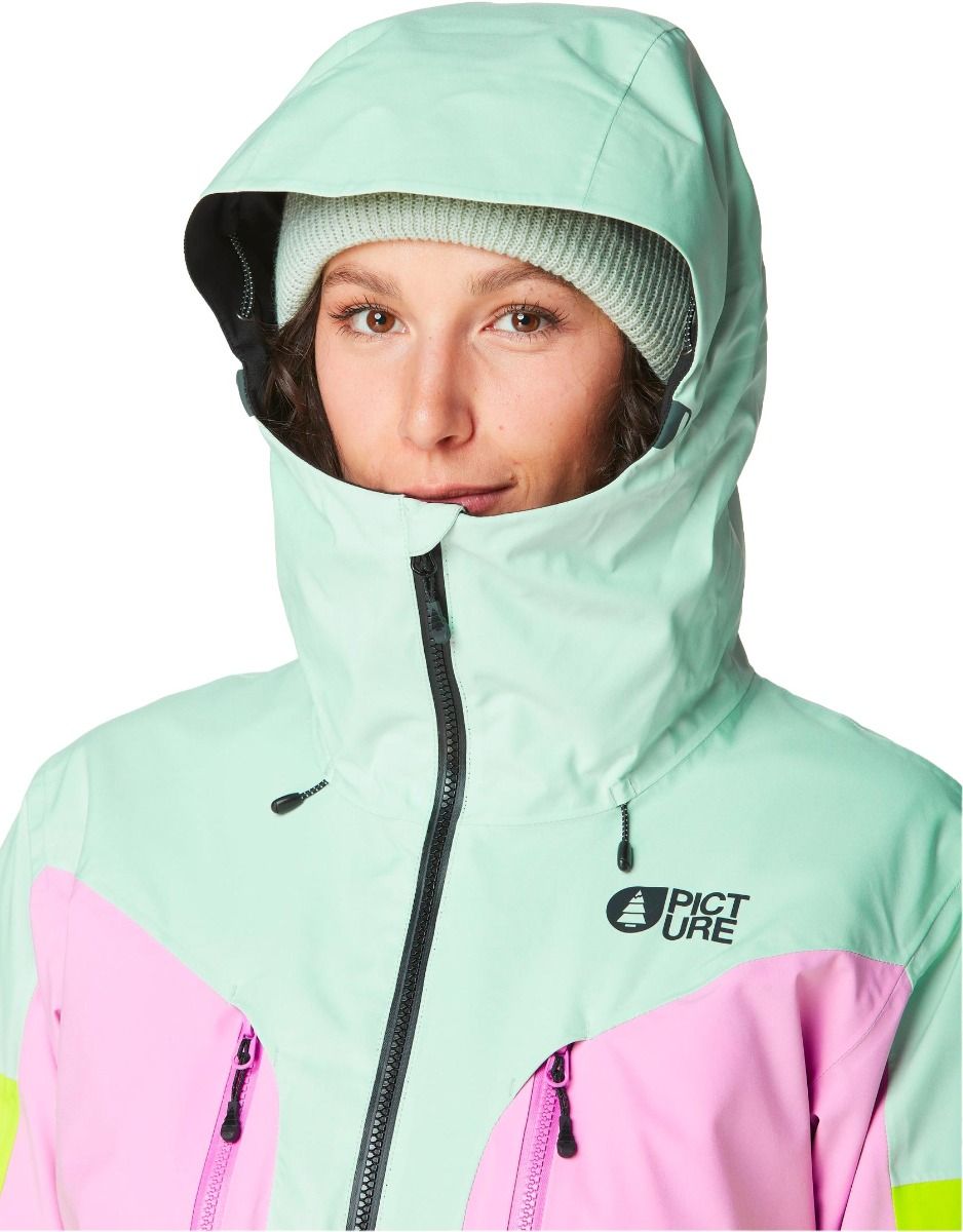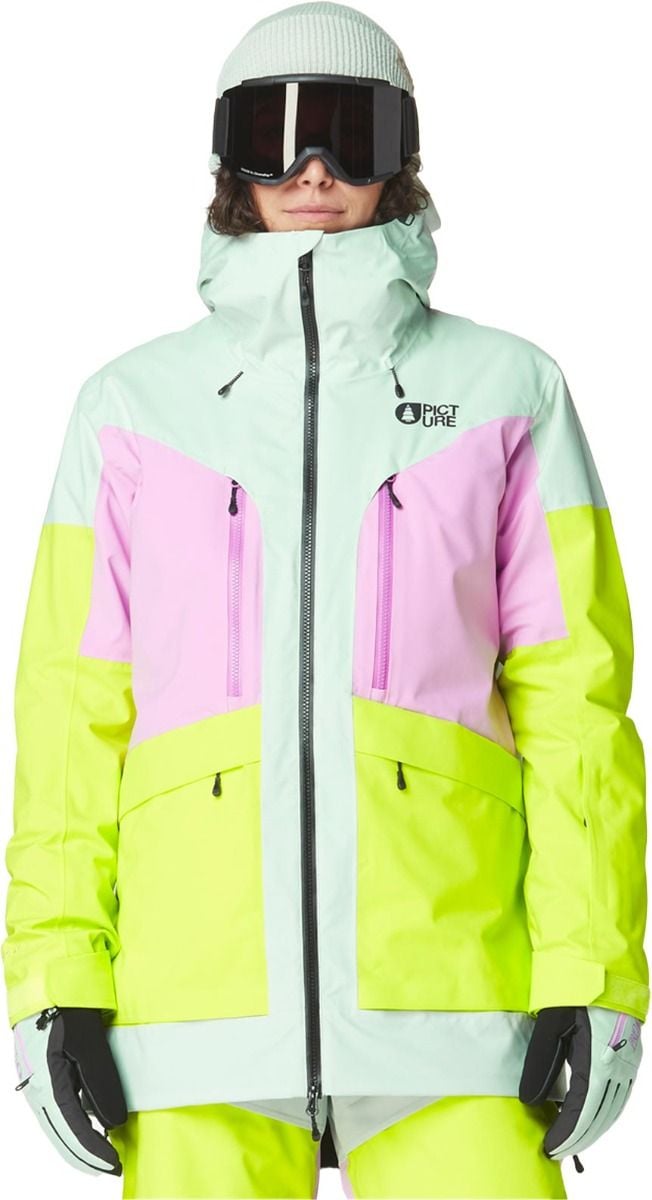 Veste de ski femme Picture Organic Clothing Haakon Silt Green Orchid, 2 couches, membrane Dryplay 20K/15K, traitement Teflon Ecoelite™ sans PFC, doublure Thermal Dry System recyclée, capuche ergonomique, jupe pare-neige, ventilation aisselles.