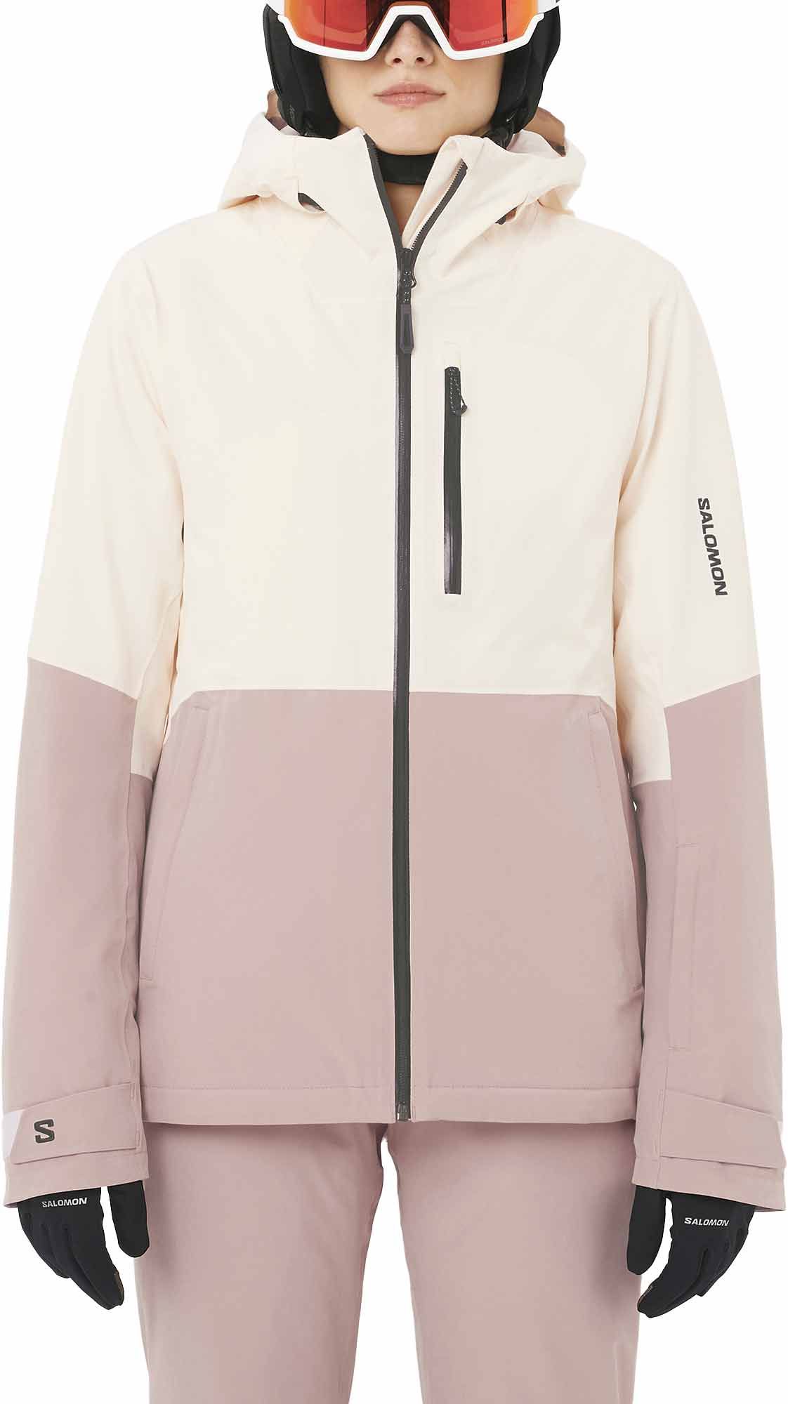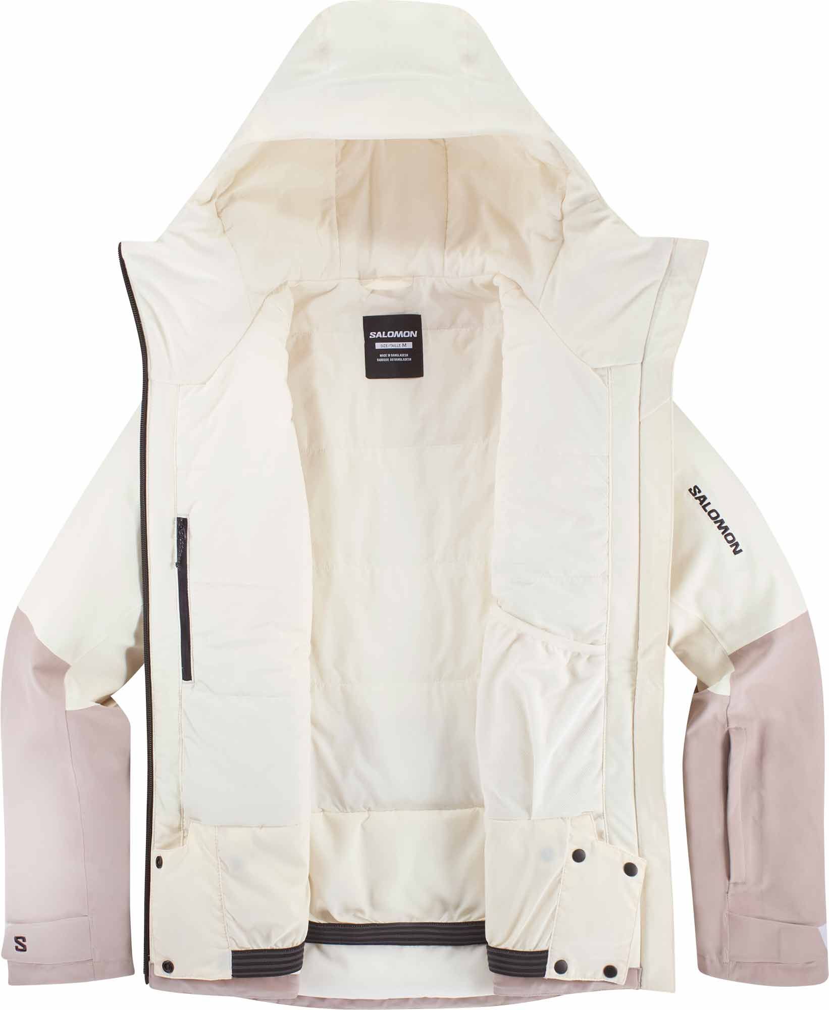 Veste technique Salomon Highland Jacket Whisper White/Etherea femme, imperméable, coupe-vent et respirante avec isolation PrimaLoft® Eco Black, capuche compatible casque et jupe pare-neige pour vos sorties hivernales à ski.