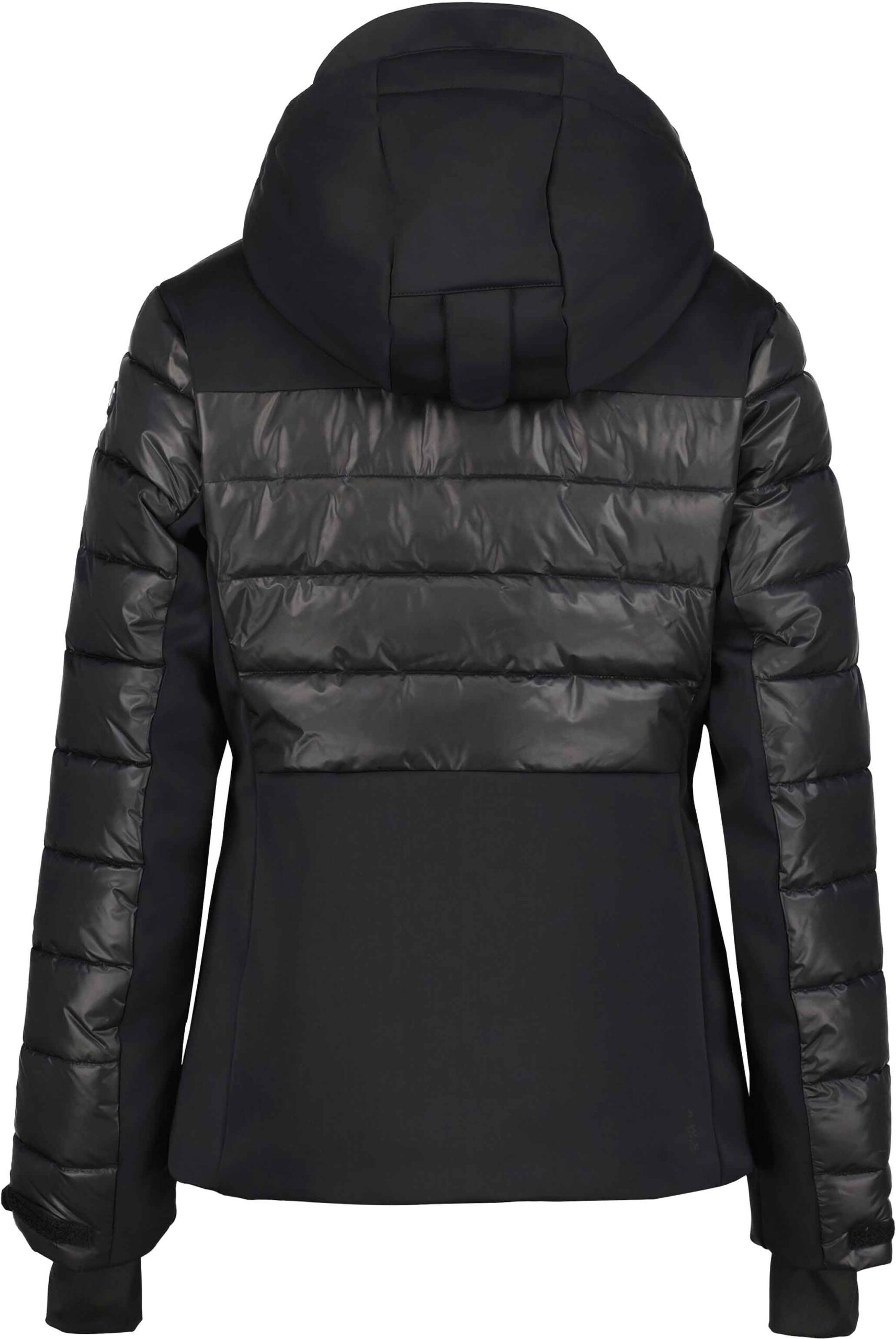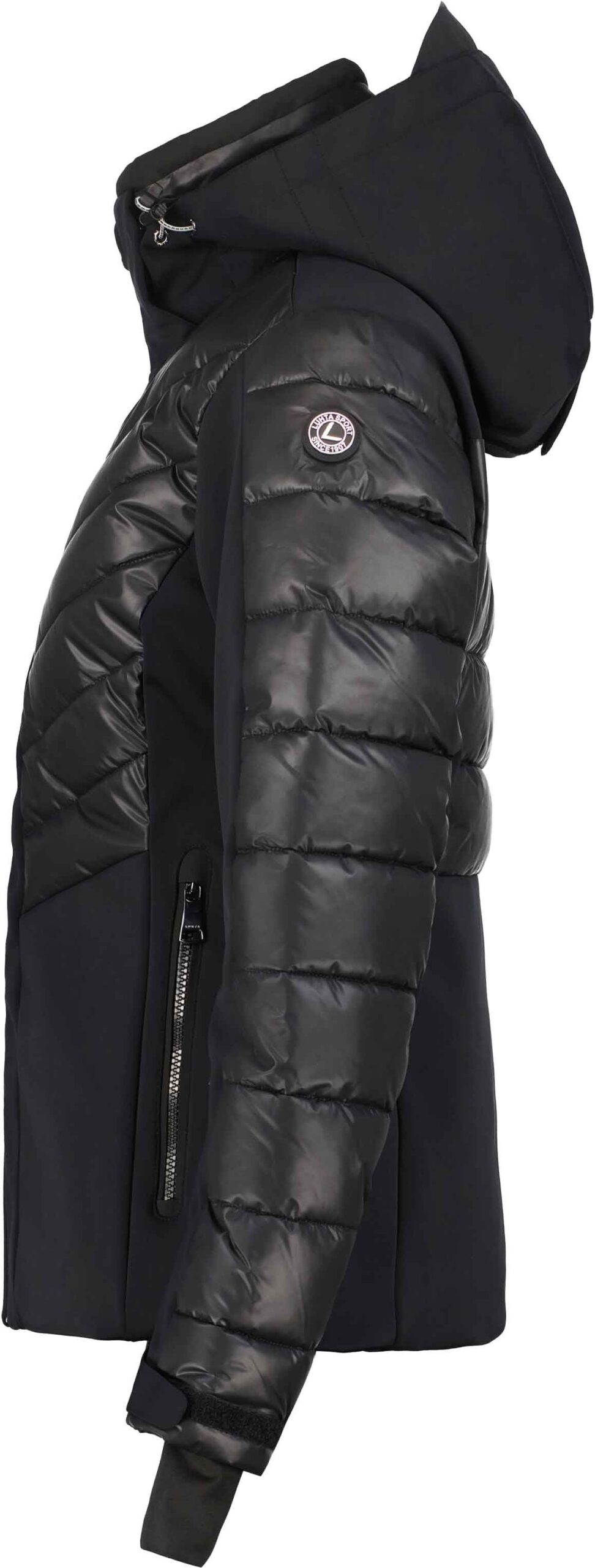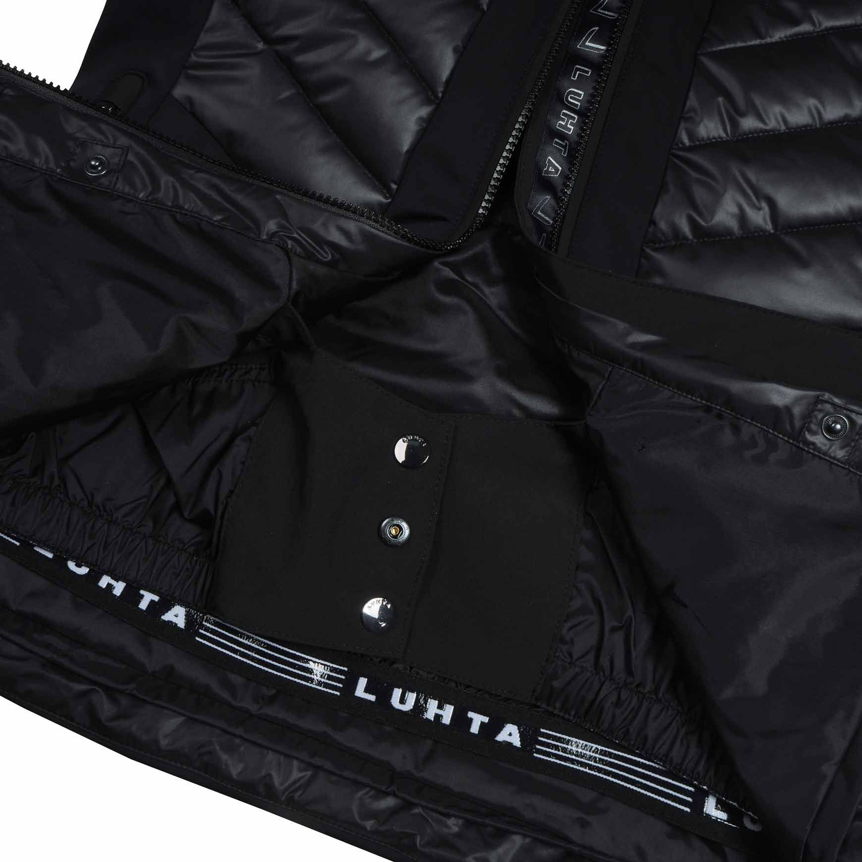 Veste de ski Luhta Mallatunturit Noire pour femme, stretch 4 directions, coupe-vent et imperméable avec capuche amovible, isolation REPREVE® recyclée, jupe pare-neige et finitions étanches.