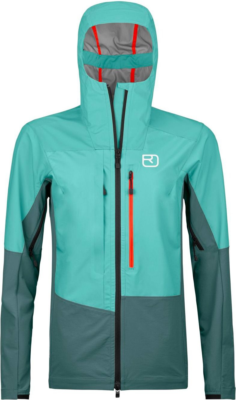 Veste technique freeride Ortovox Mesola Jacket Ice Waterfall femme : membrane Dermizax® NX, tissu MERINO DEEP SHELL, softshell respirant dos et côtés, laine mérinos intérieure, capuche et poignets réglables, poches poitrine compatibles sac.