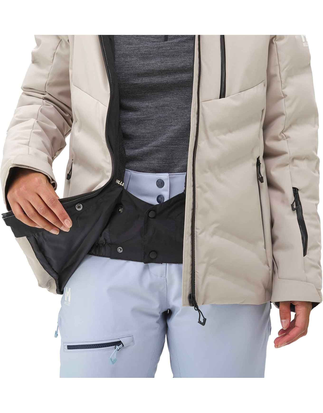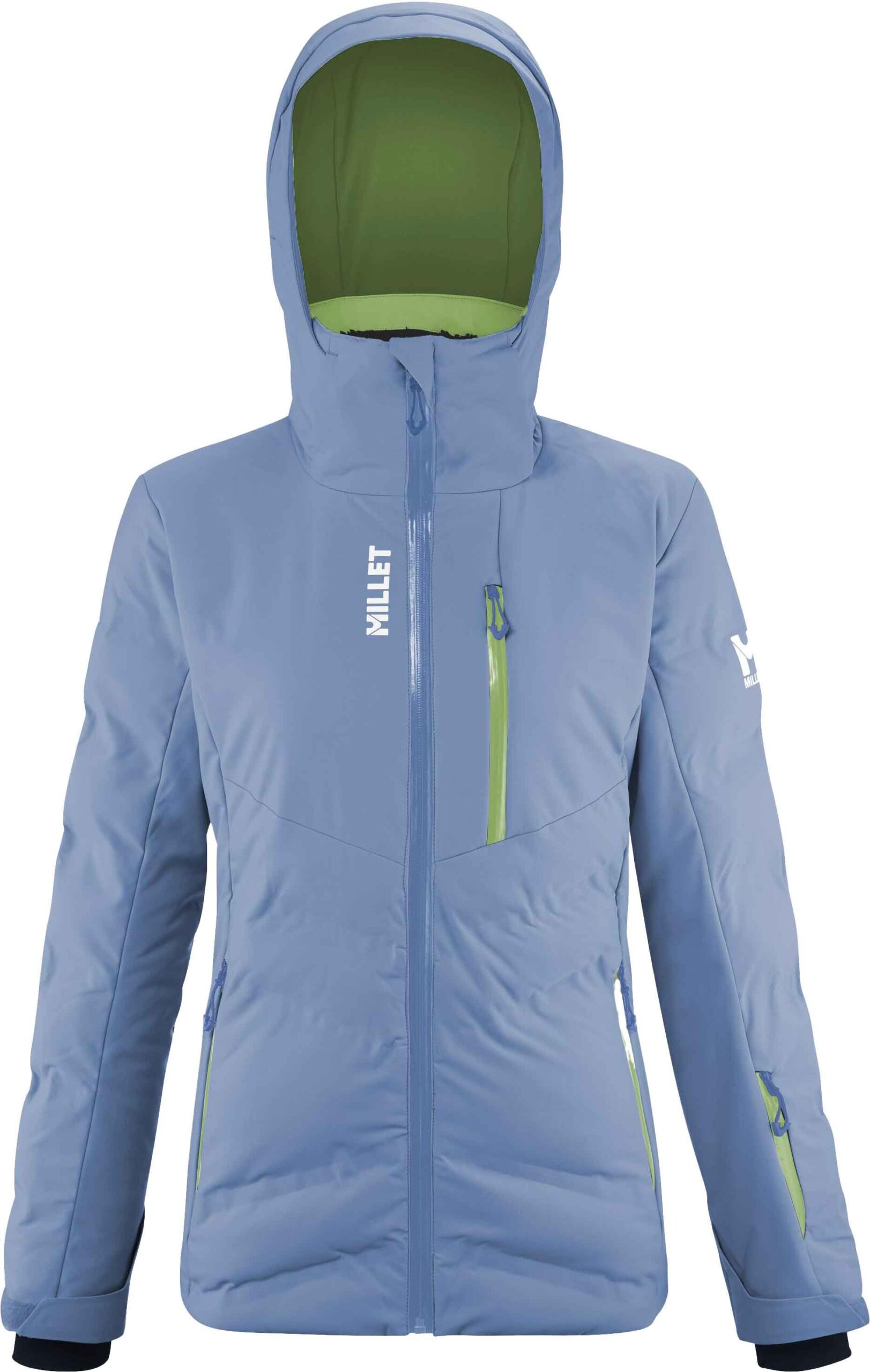 Veste de ski Millet Monashee Jkt femme, bleue, en tissu recyclé Repreve® et isolation synthétique, imperméable DRYEDGE™ stretch, coupe-vent, coutures thermosoudées, capuche amovible, poches sécurisées et ventilations latérales.