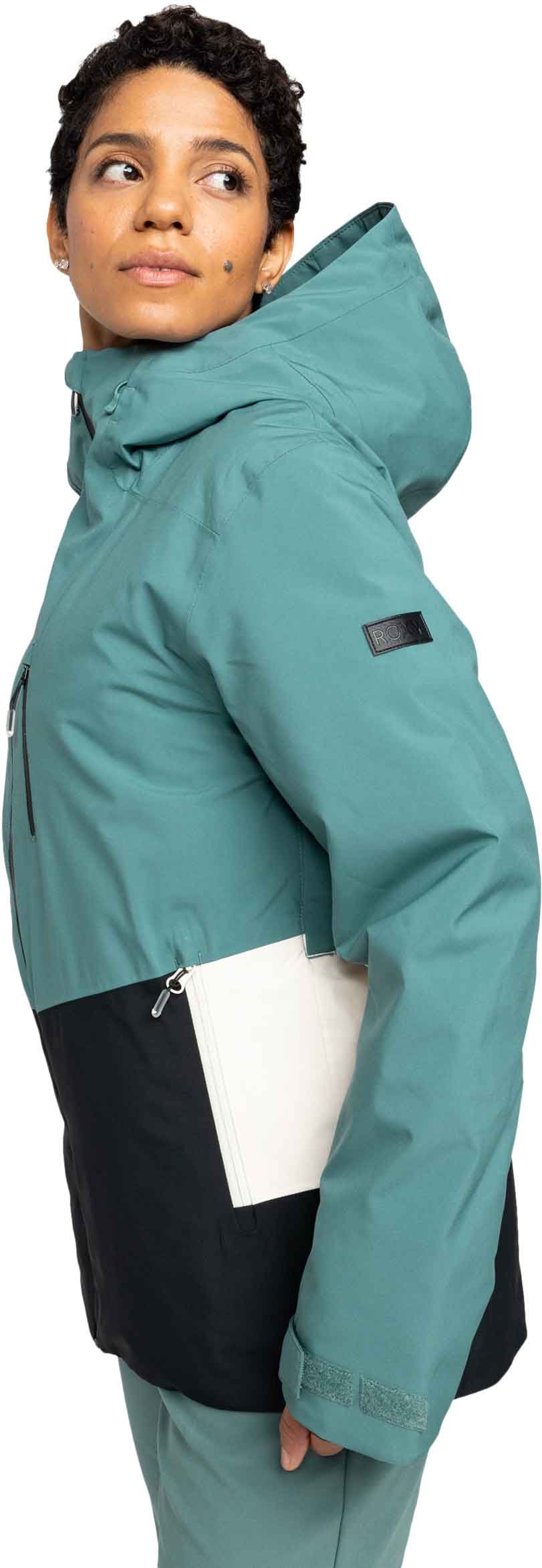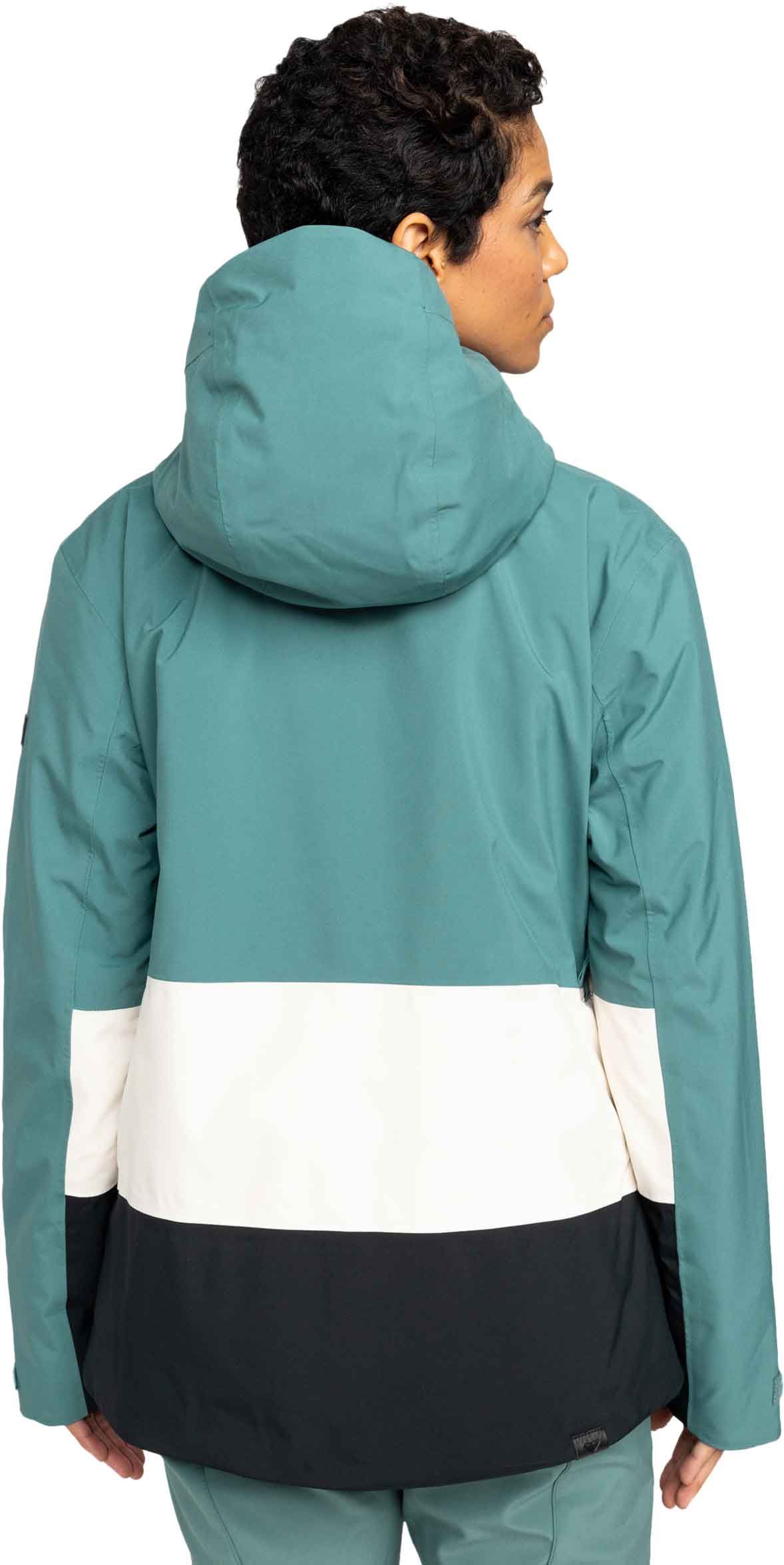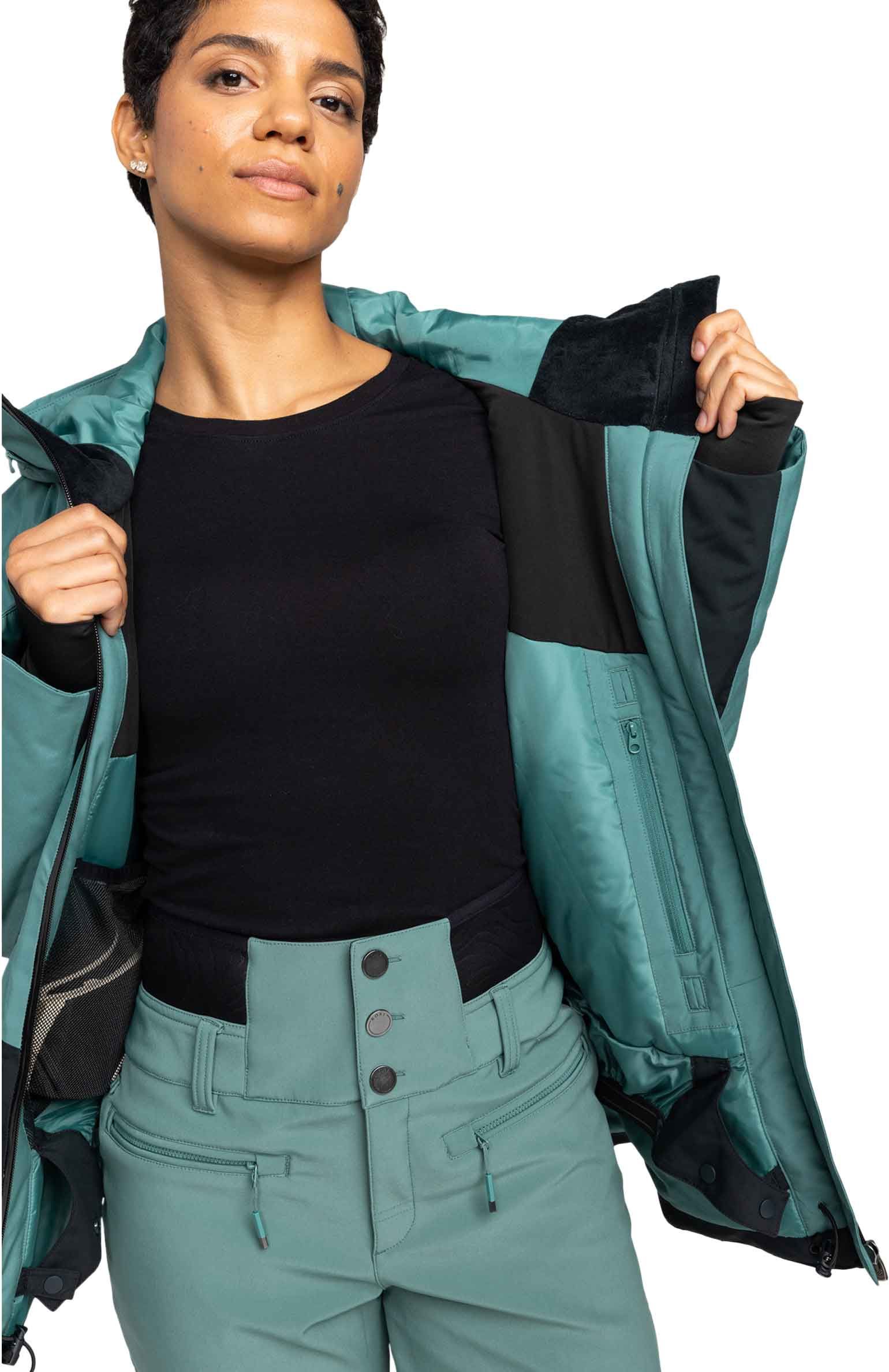Veste ski femme Roxy Peakside Sea Pine, imperméable, coupe-vent et respirante DryFlight® WarmFlight®, avec capuche réglable, jupe pare-neige et attache veste-pantalon.