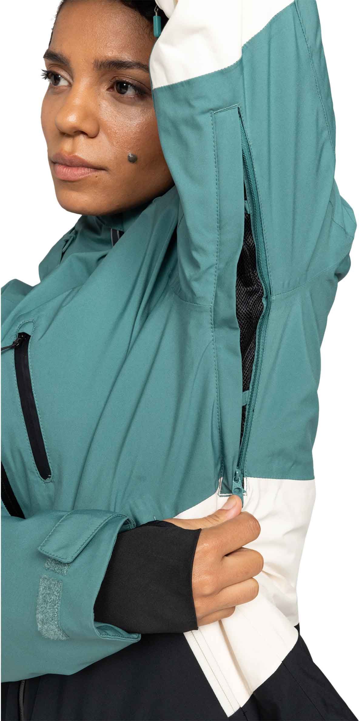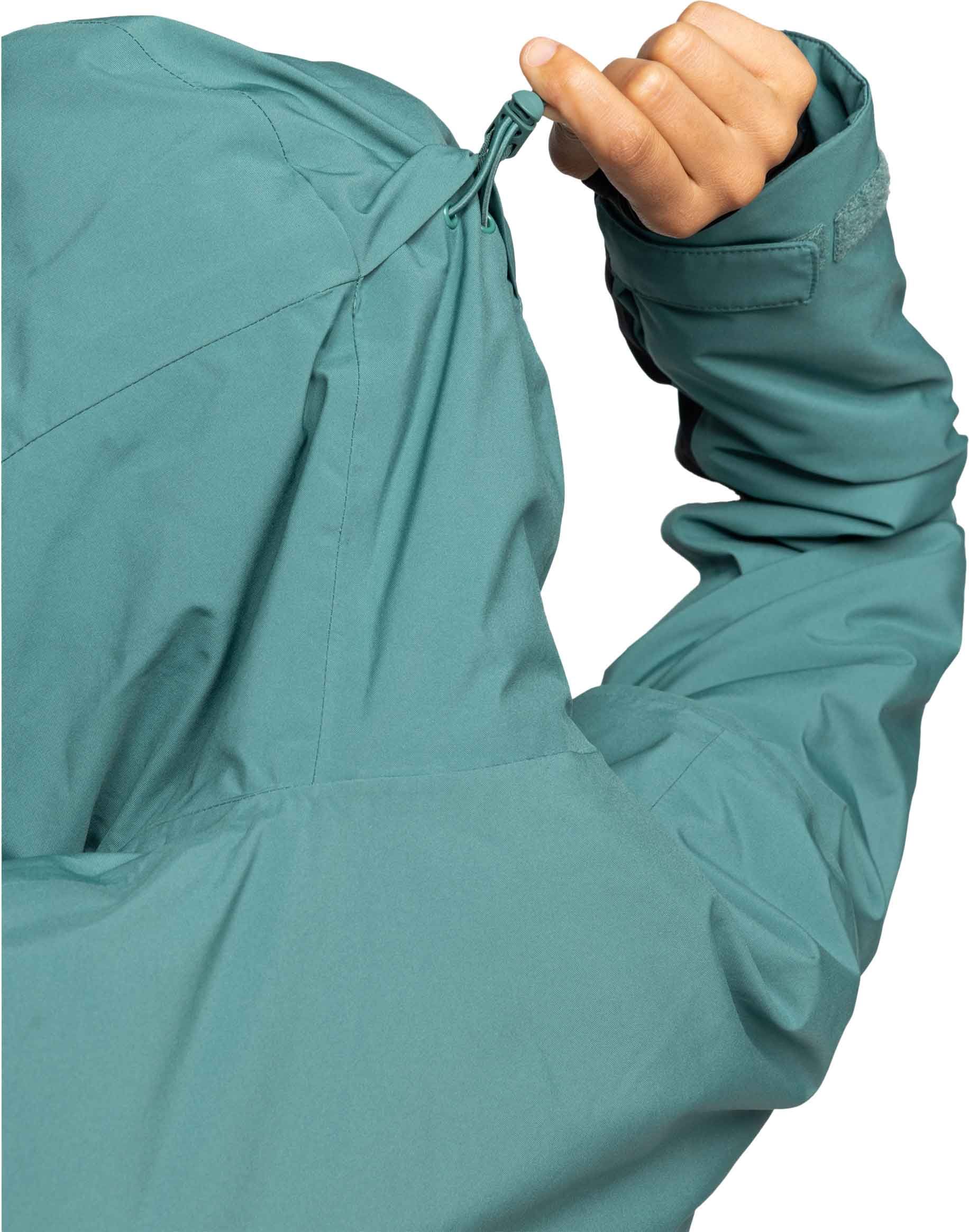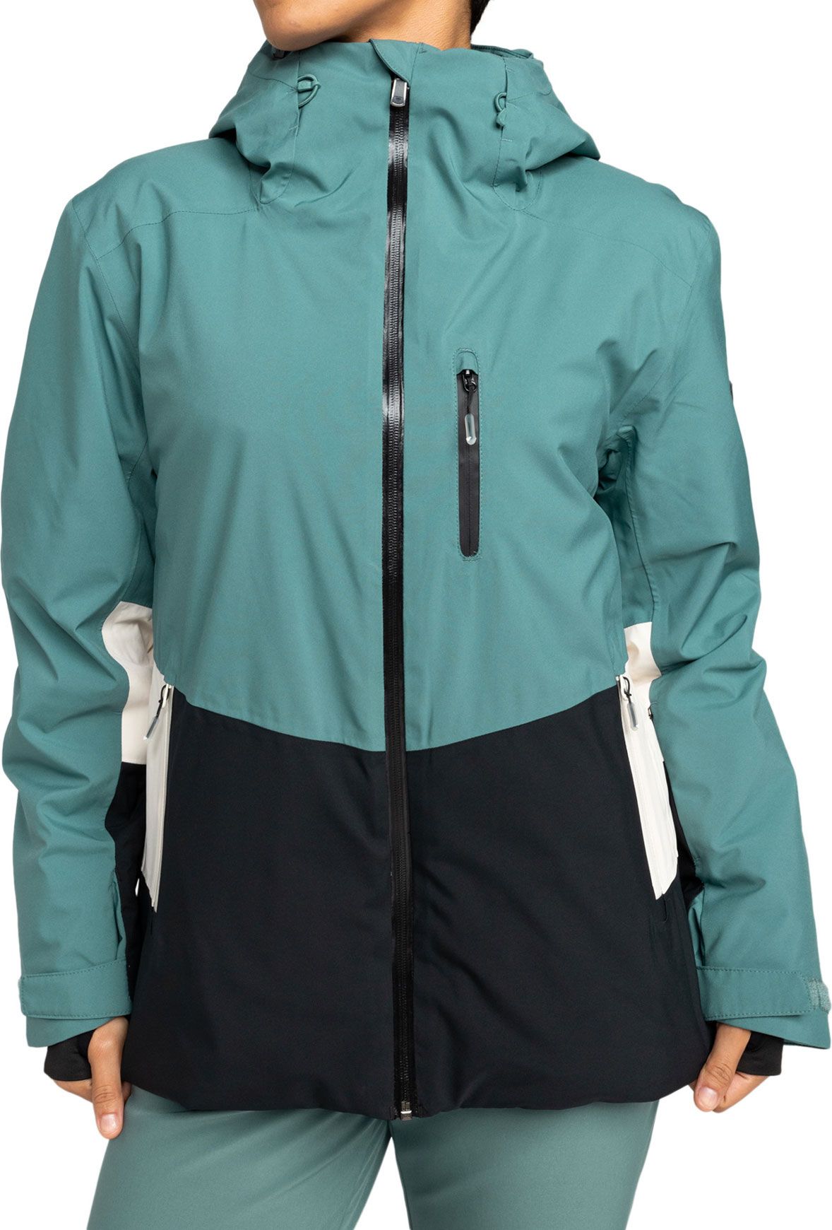 Veste ski femme Roxy Peakside Sea Pine, imperméable, coupe-vent et respirante DryFlight® WarmFlight®, avec capuche réglable, jupe pare-neige et attache veste-pantalon.