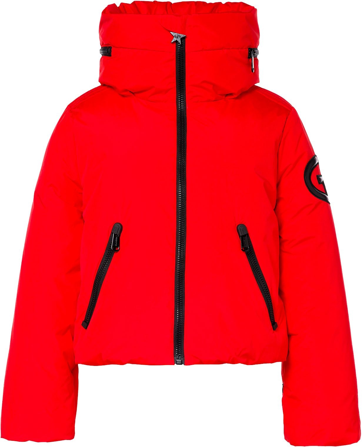 Doudoune de ski courte Goldberg Porter Flame pour femme, en duvet d’oie imperméable et respirante, doublure recyclée anti-odeurs, capuche, jupe pare-neige amovible et poignets tricotés.