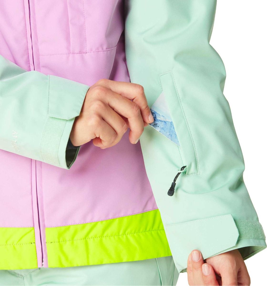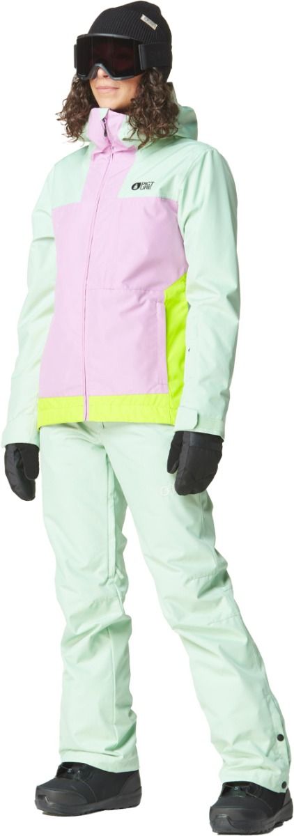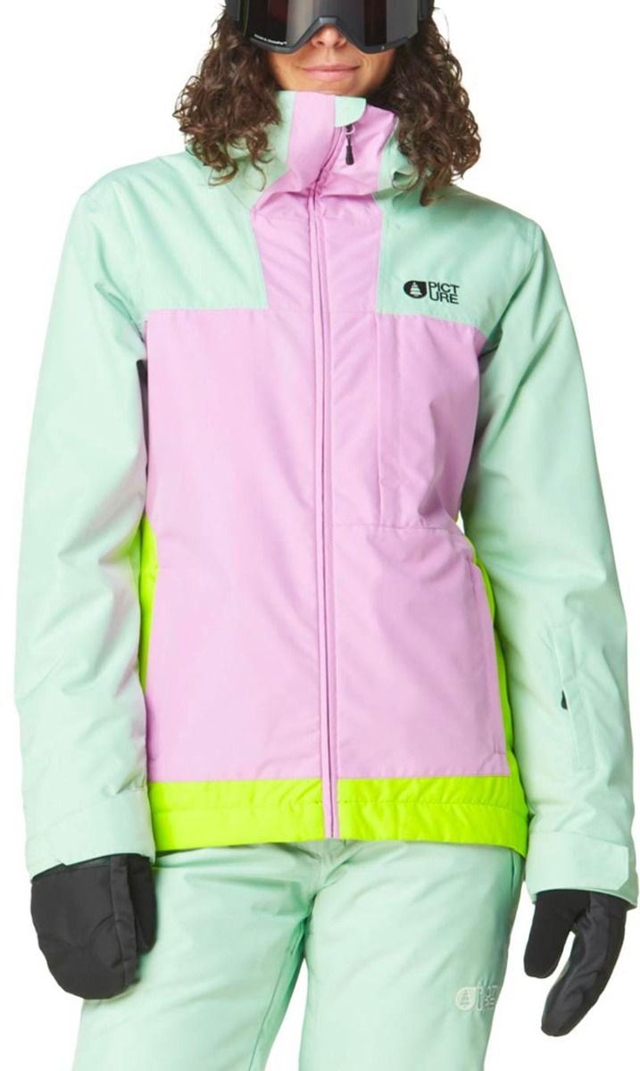 La veste de ski Seakrest Silt Green Orchid pour femme de Picture Organic Clothing combine membrane Dryplay 10K/10K, coutures collées et isolation Thermal STD recyclé pour une protection fiable sur les pistes.