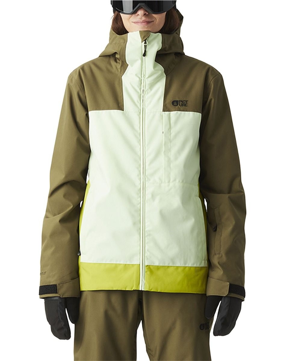 Veste de ski femme Picture Organic Clothing Seakrest Stonewash, membrane Dryplay 10K/10K, isolation polyester, coutures collées, capuche ergonomique et jupe pare-neige.