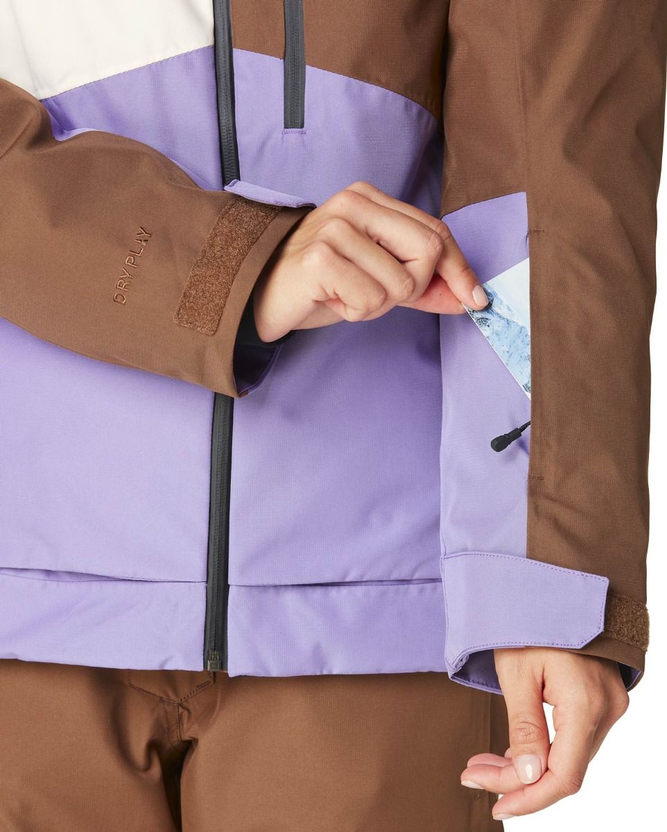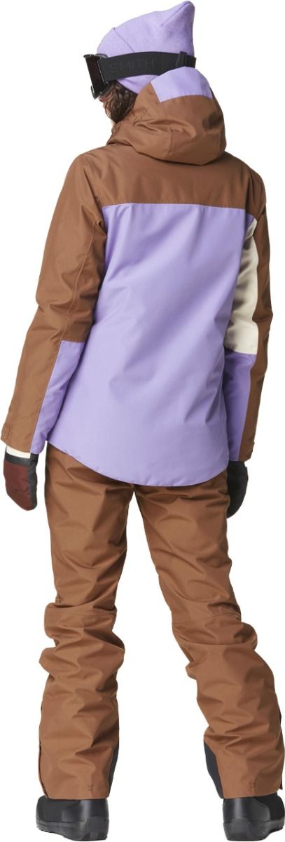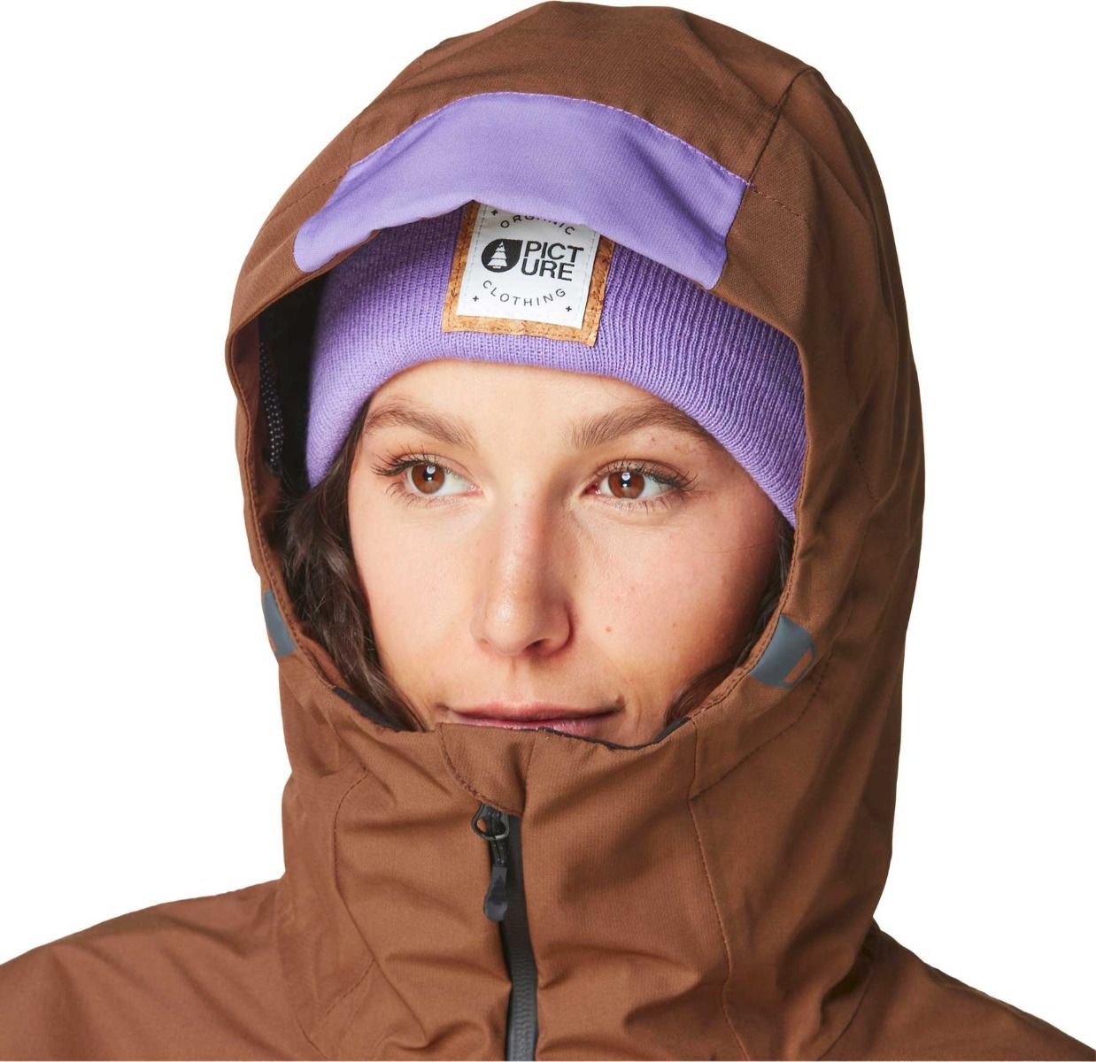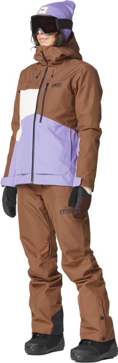 Veste de ski femme Seen Cocoa Brown Paisley par Picture Organic Clothing, membrane Dryplay 20K/15K, matière 100 % recyclée, isolation Thermal STD, jupe pare-neige et zips ventilation sous les bras pour un confort chaud et respirant sur les pistes.