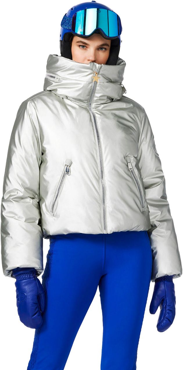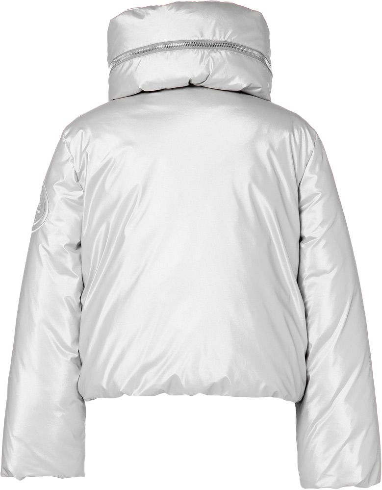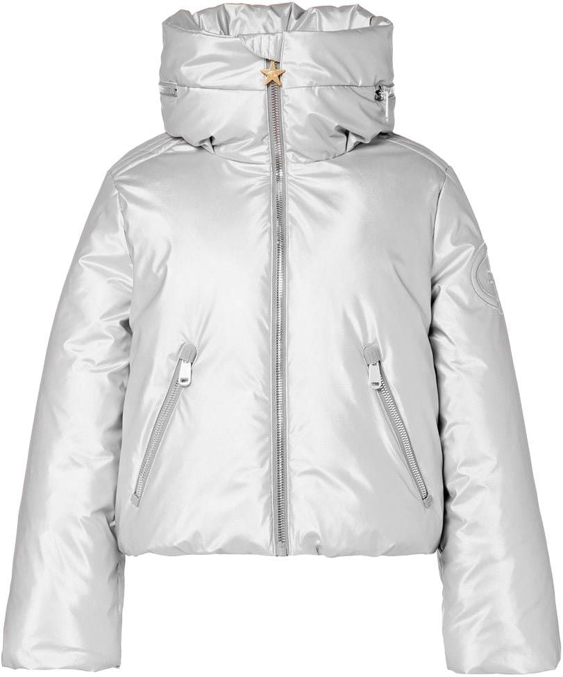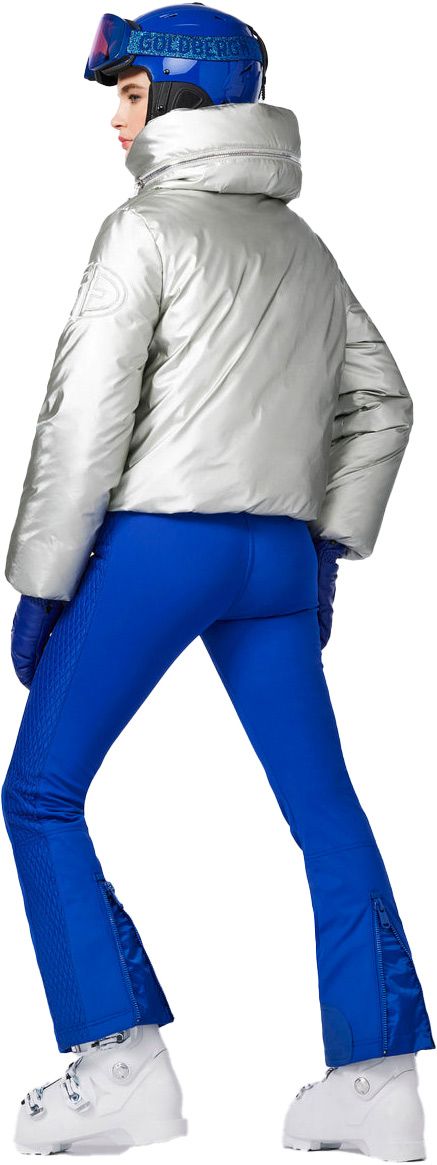 La doudoune de ski courte Goldberg Soleil Ski Jacket Silver pour femme, en duvet de canard, offre chaleur, déperlance et jupe pare-neige amovible pour des journées sur pistes confortablement protégées.