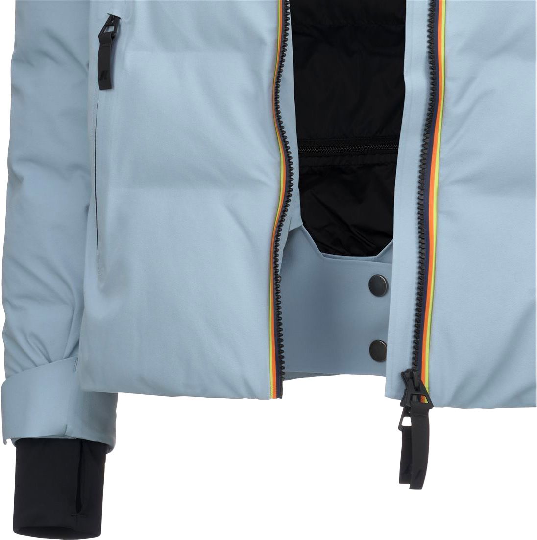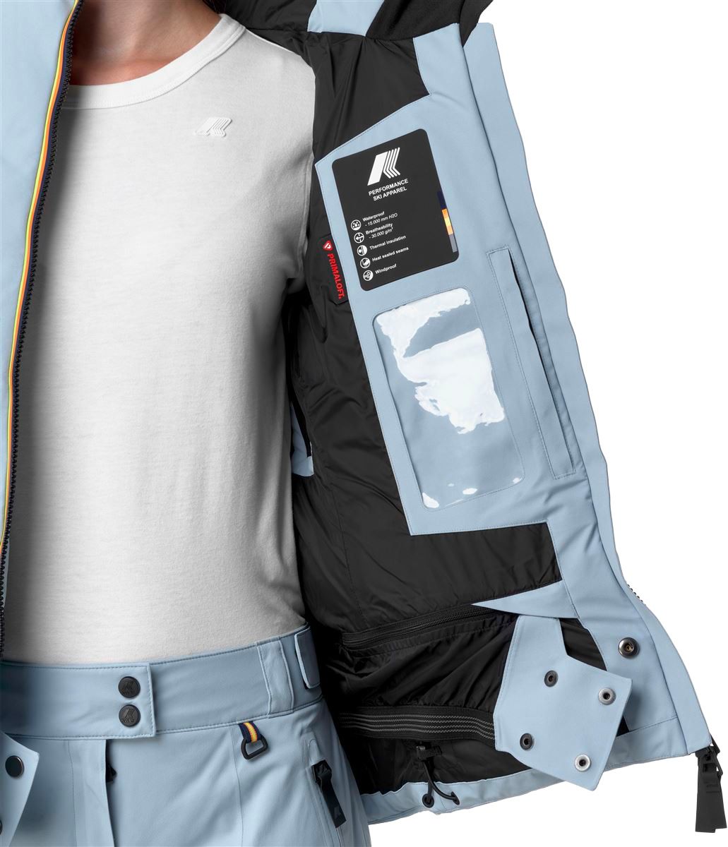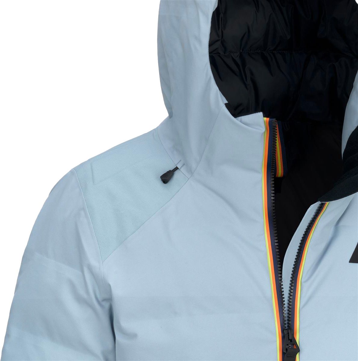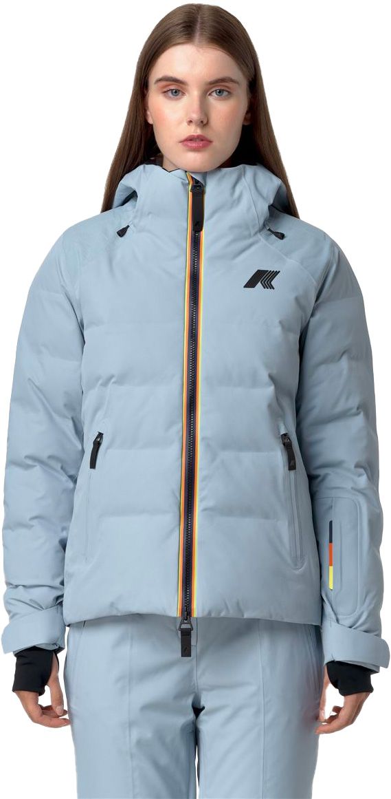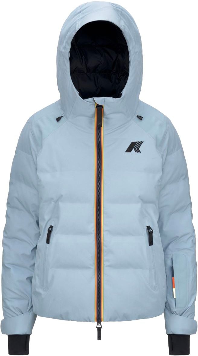 Veste de ski femme K-Way Tueda Blue Avion, isolation synthétique, coupe ajustée matelassée, capuche et poignets réglables, poches zippées sécurisées.