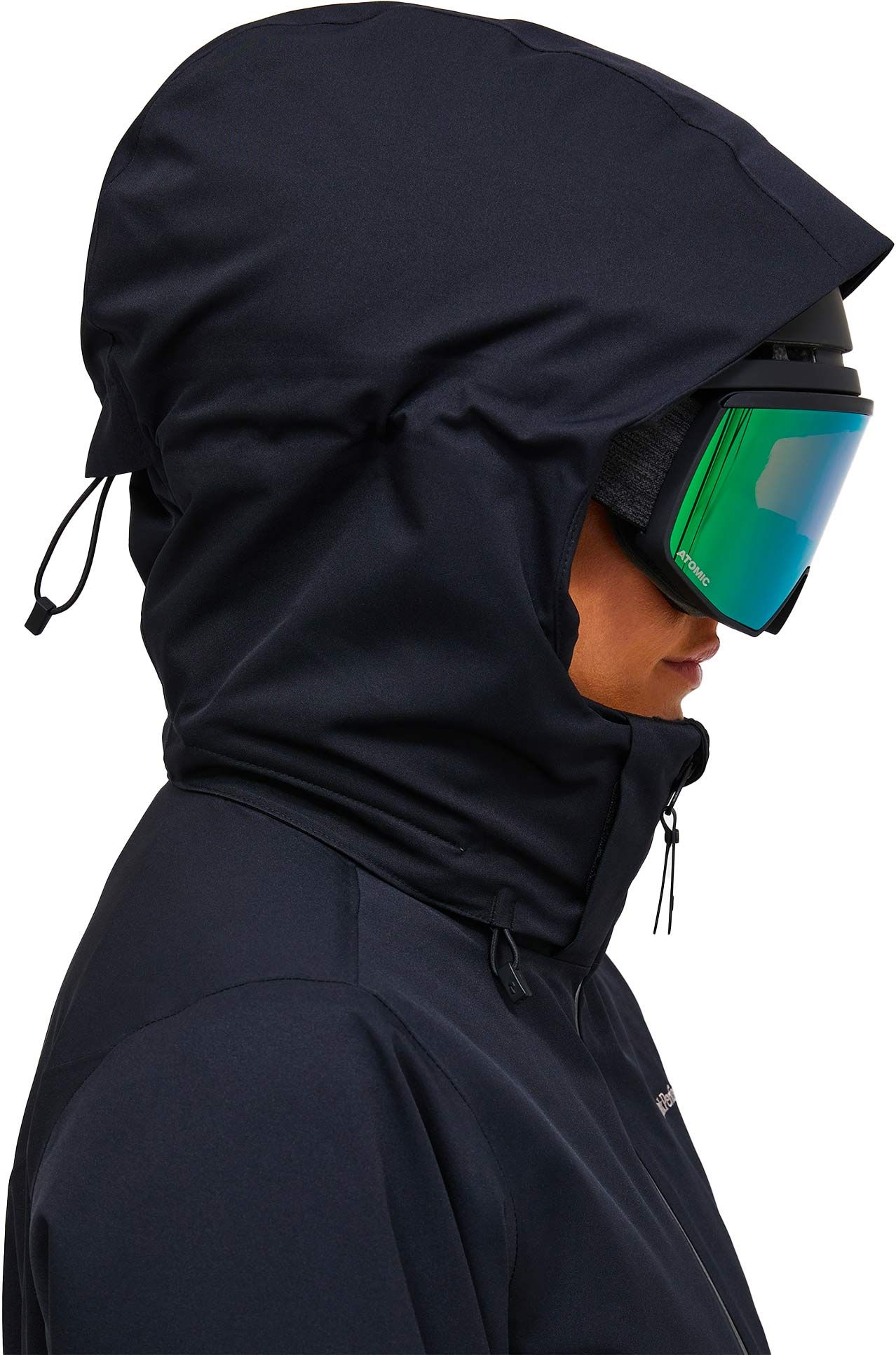Des manchons élastiques, des poignets réglables par patte velcro, un ourlet ajustable par cordon et des ouvertures de ventilation zippées sous les bras contribuent à optimiser le confort. L’entrée de neige est limitée par une jupe pare-neige fixe munie d’un système d’attache au pantalon.