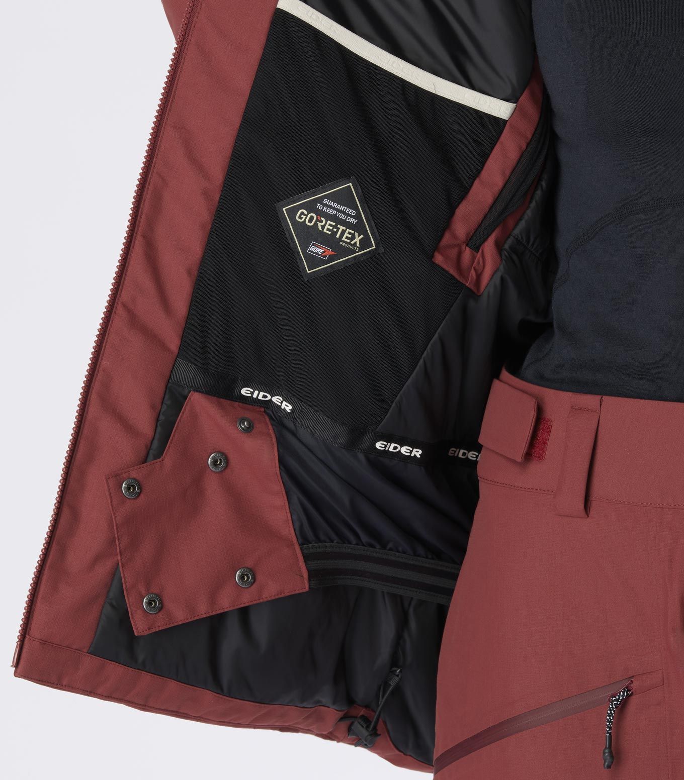 Zip frontal YKK® étanche avec garage menton, coutures principales scellées, jupe pare-neige amovible avec gripper, bord côte interne et rivets d’aération. Logo EIDER brodé sur la poitrine.