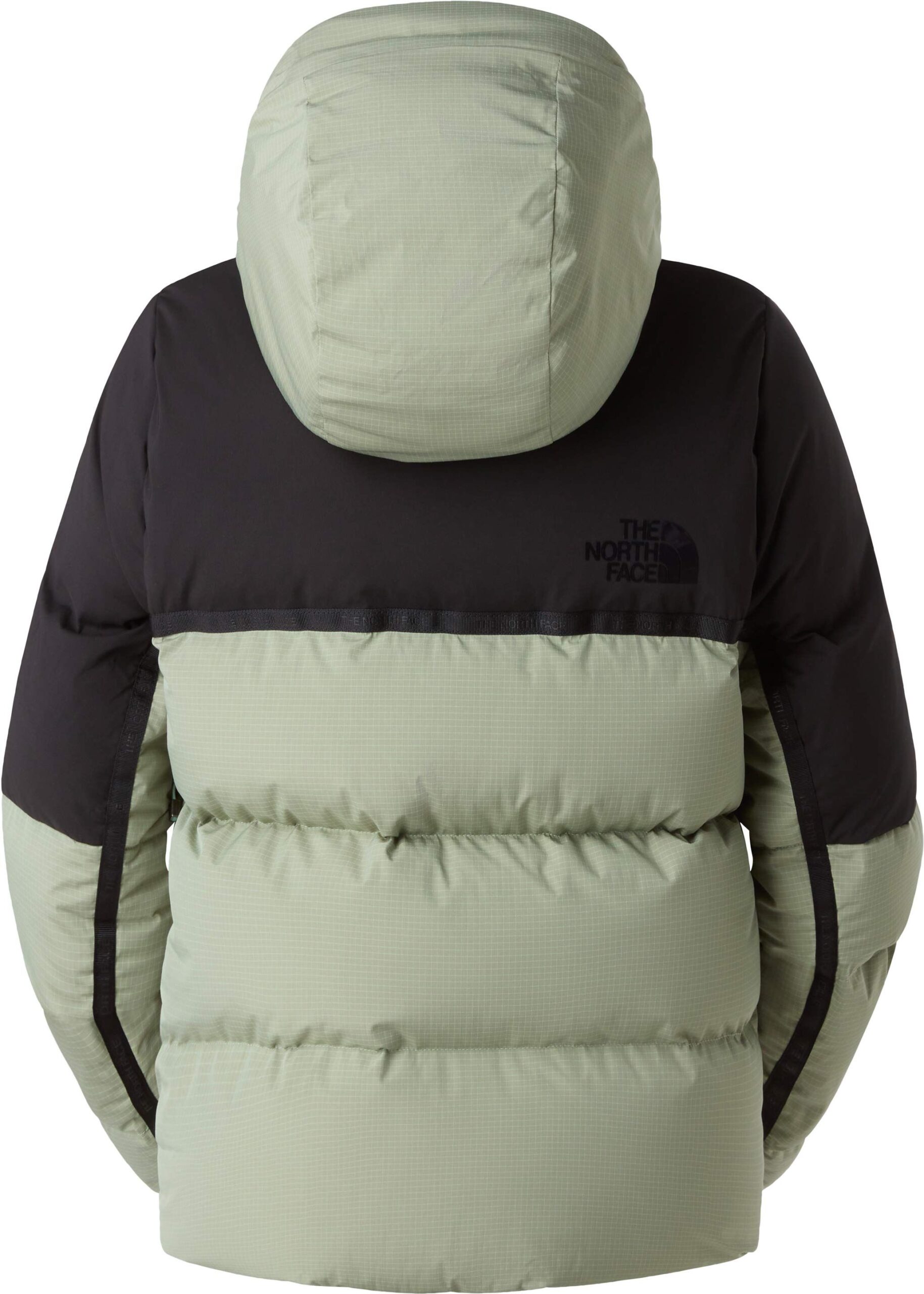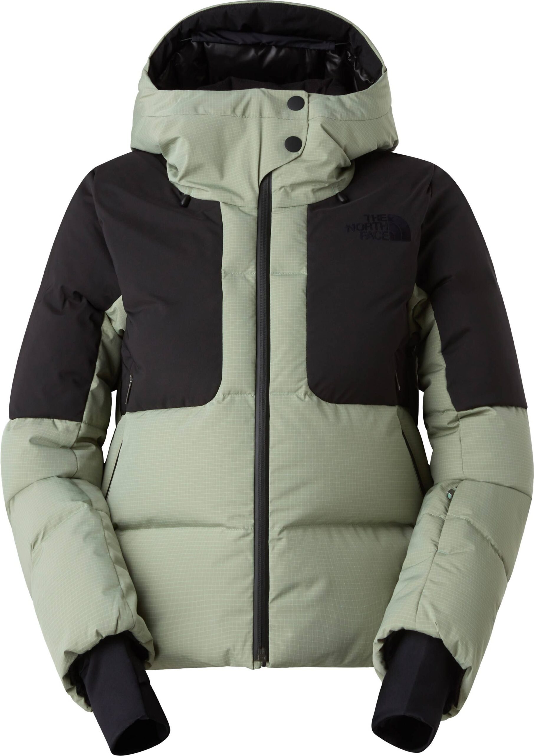 The North Face Cold Spell Cropped Down Jacket Slate Moss TNF Black femme est une doudoune légère en duvet, chaude et compressible, dotée de poches zippées, jupe pare-neige amovible, guêtres passe-pouces et aérations sous les bras pour le ski.