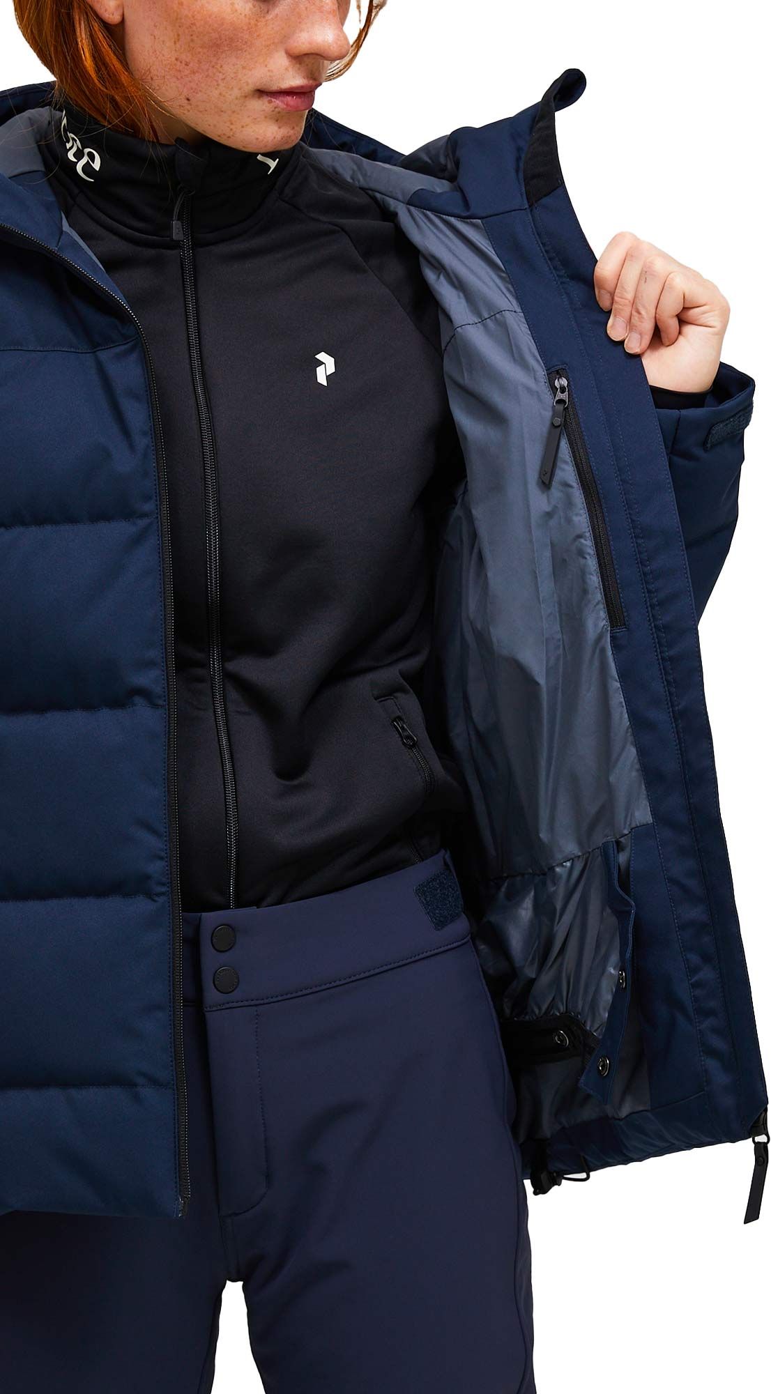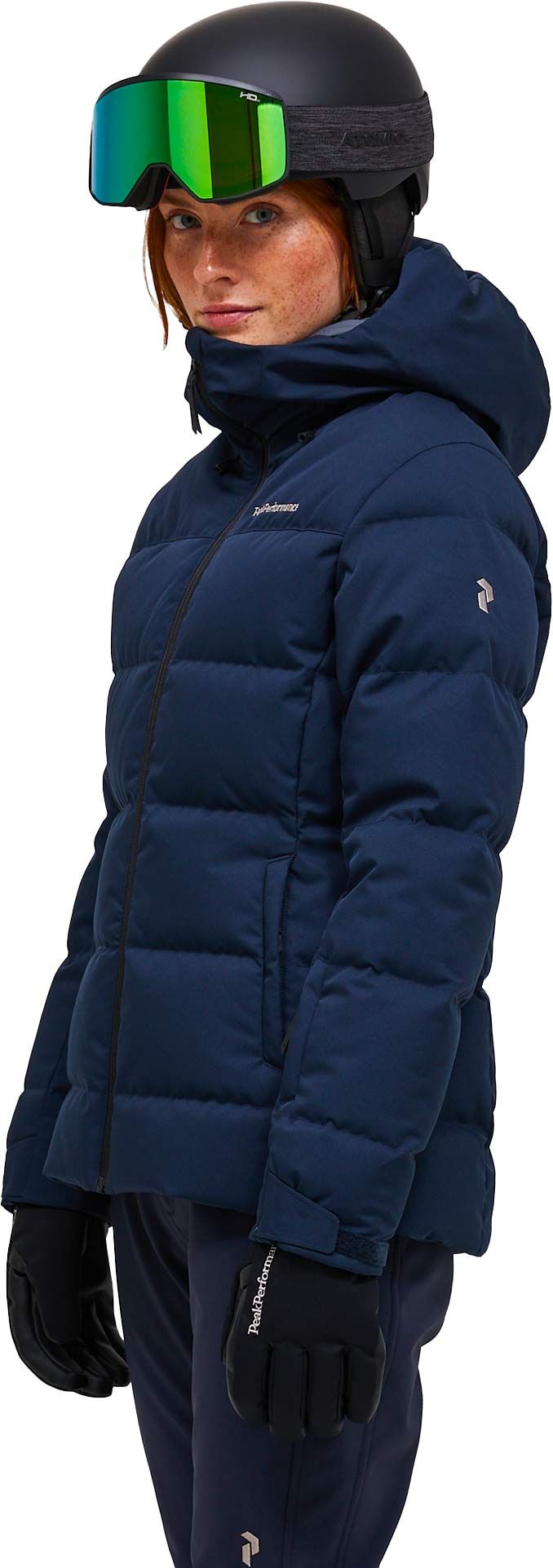 La Shred Down Jacket Blue Shadow de Peak Performance est une doudoune de ski femme en tissu recyclé, isolée en duvet 700 CUIN, avec capuche fixe, jupe pare-neige et réflecteur RECCO® pour une protection complète sur les pistes.
