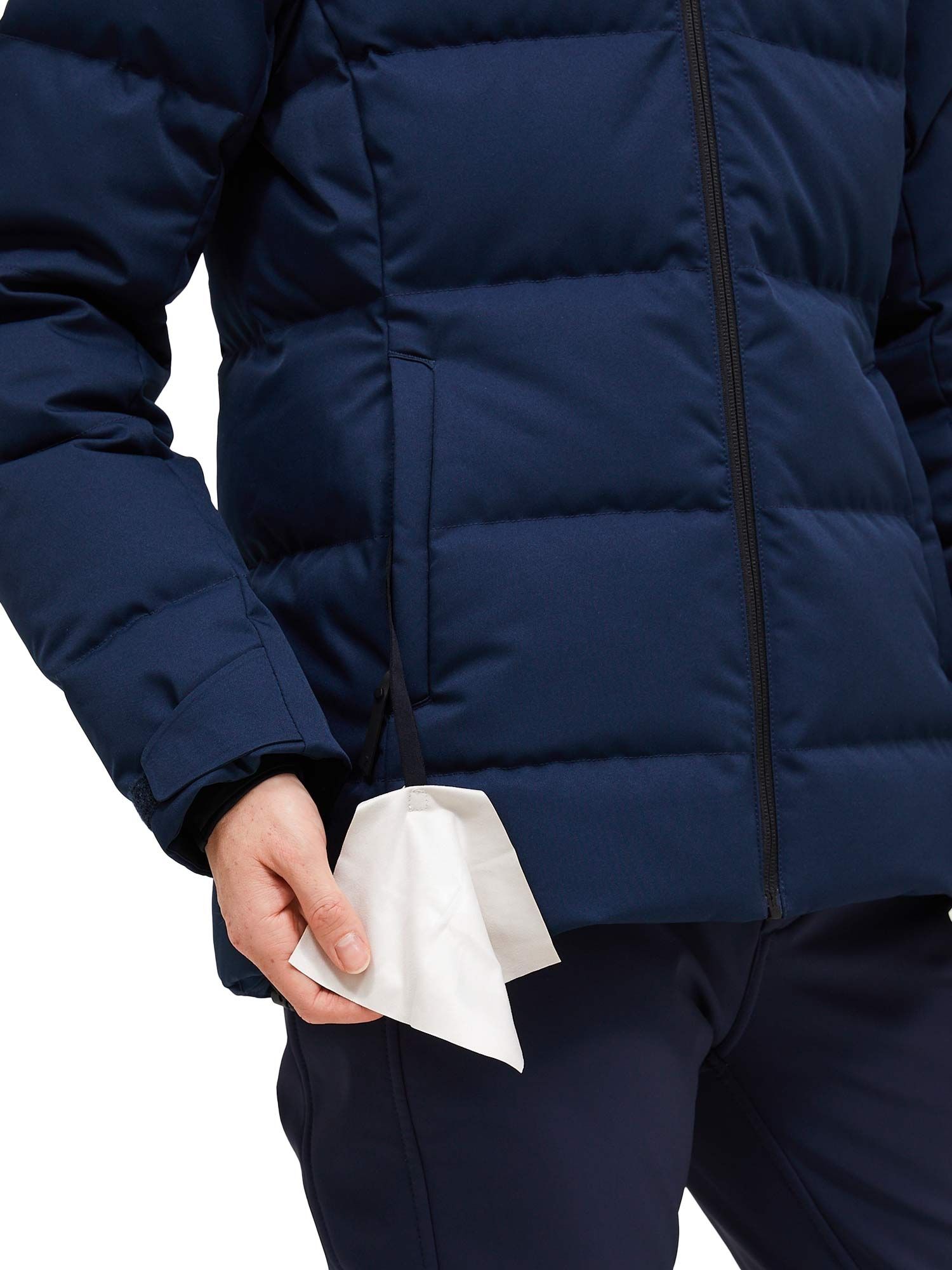 Les équipements techniques incluent un réflecteur RECCO® intégré et une poche zippée située sur la manche, tandis que les poches extérieures pour les mains et les compartiments intérieurs facilitent l’accès à vos objets indispensables.