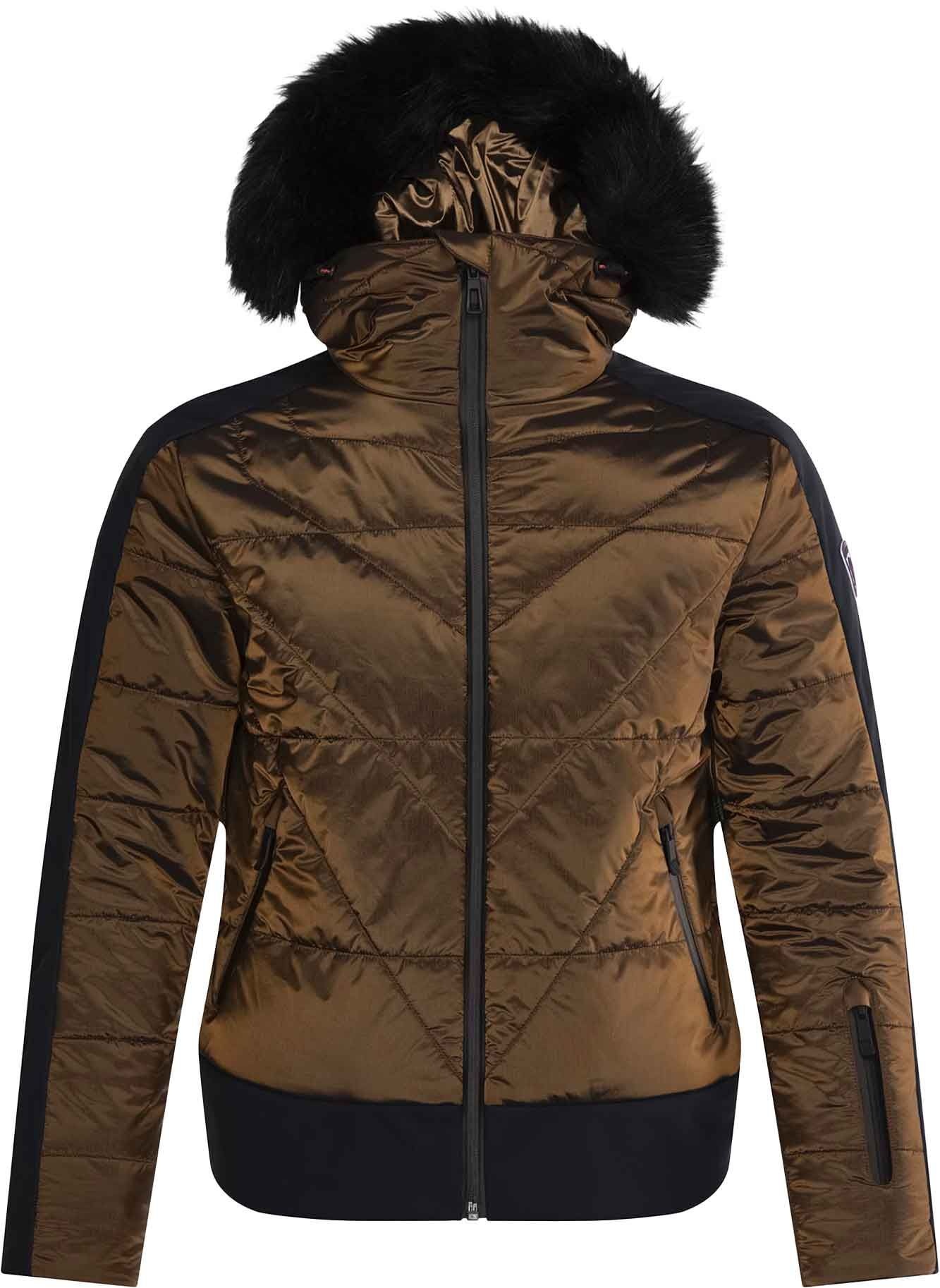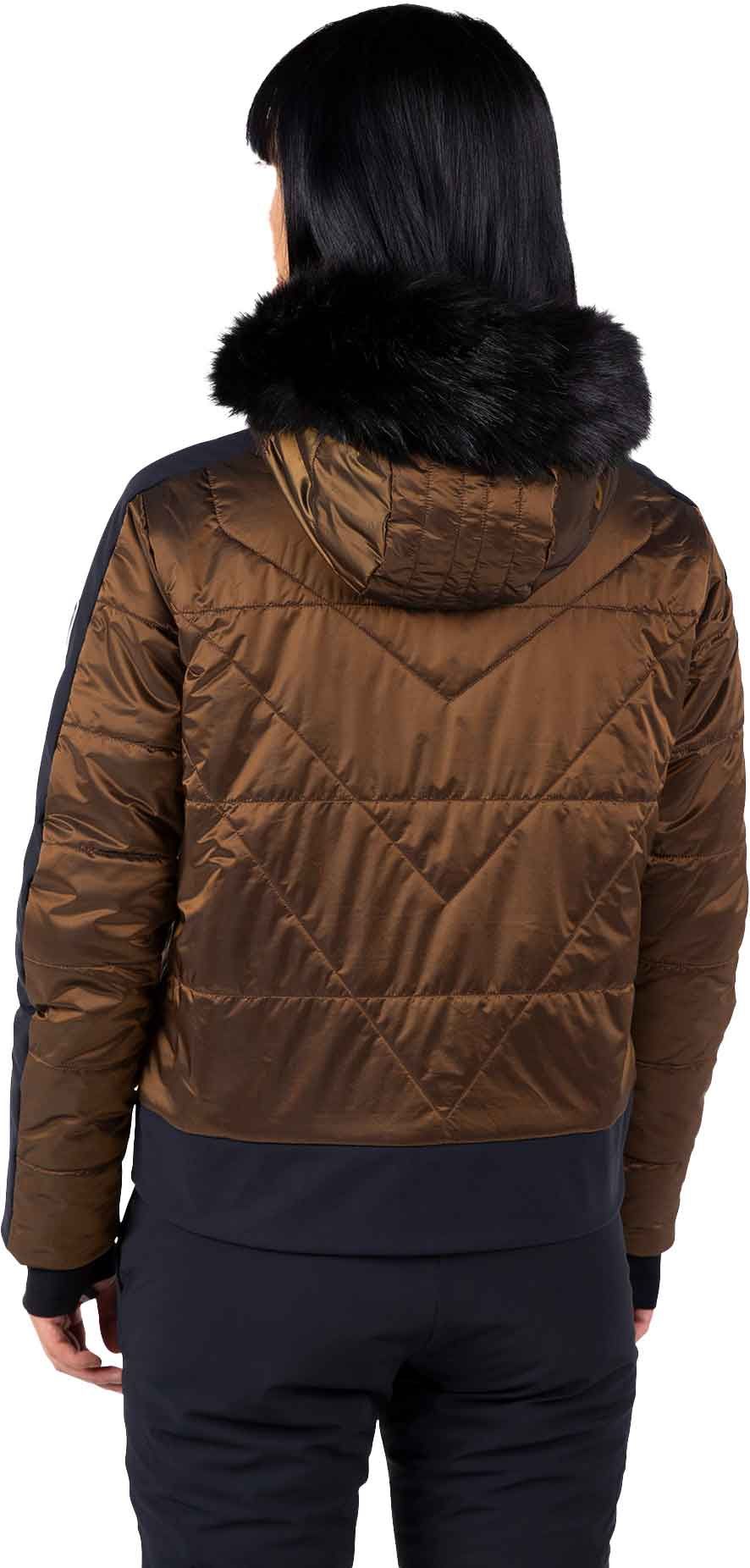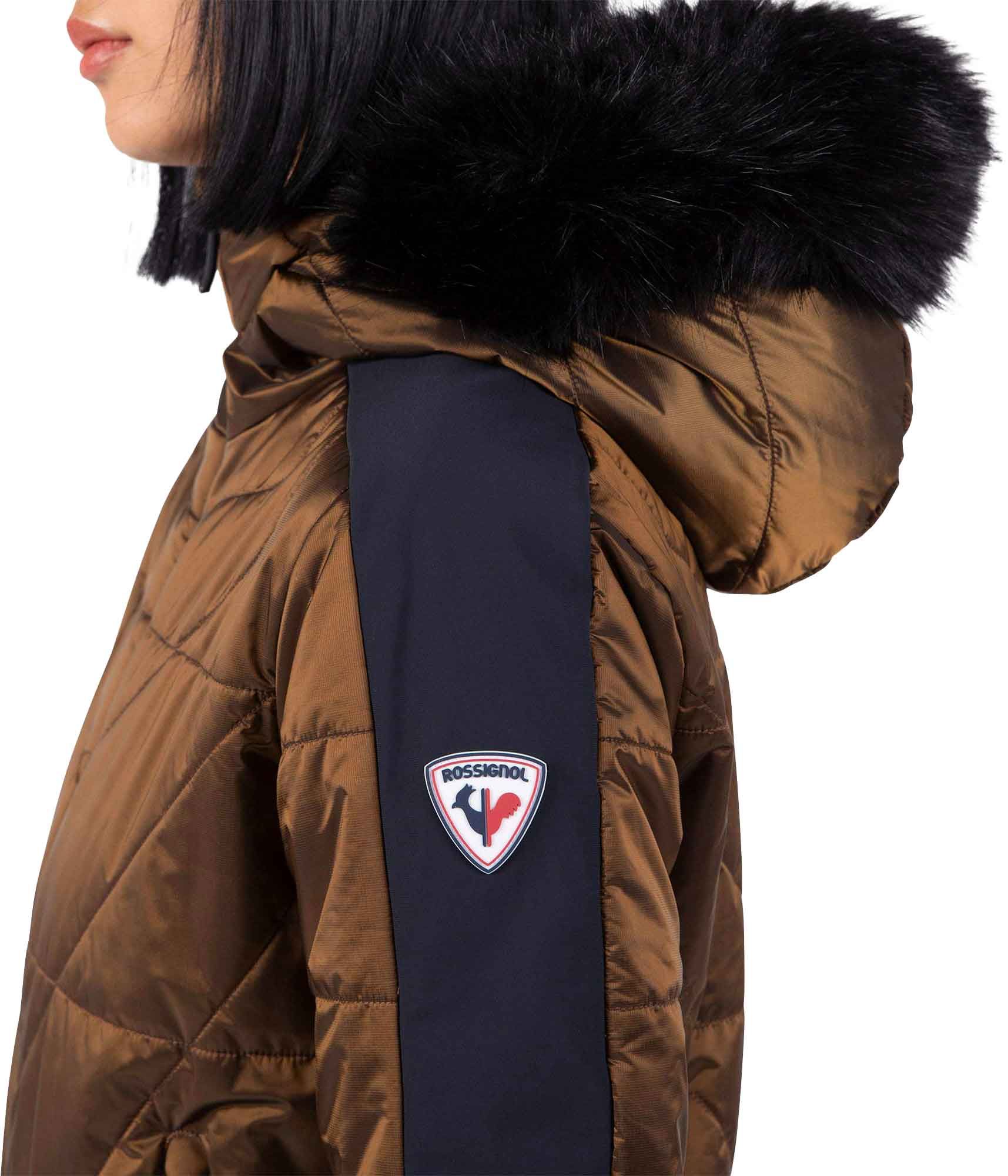 Veste de ski Rossignol Ventina Bomber Bronze pour femme en nylon stretch, isolée Primaloft, membrane imper-respirante, jupe pare-neige, capuche fixe.