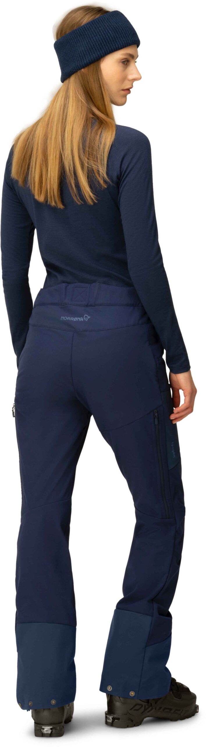 Pantalon ski de randonnée femme Norrona Lyngen Hiloflex200 Slim Pants : tissu hiloflex200 coupe-vent et chaud, intérieur polaire, taille élastique, poches zippées, genoux articulés, guêtres pare-neige réglées.