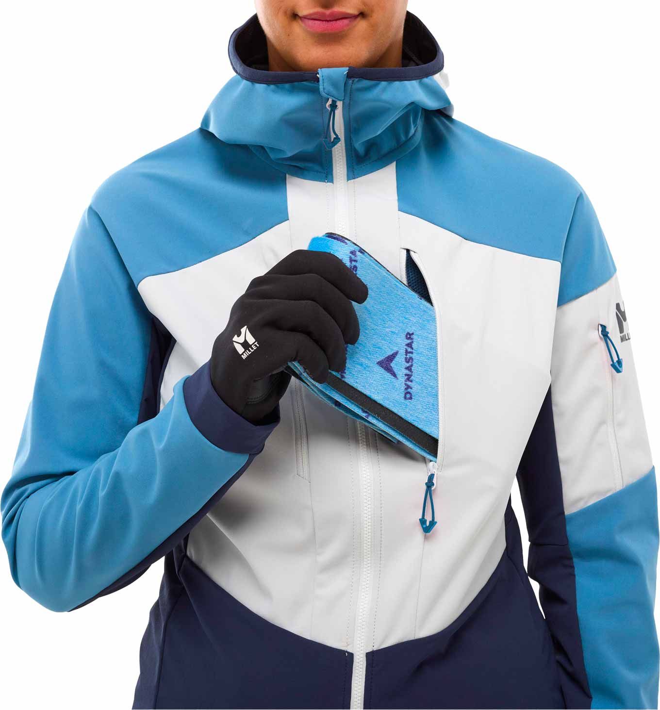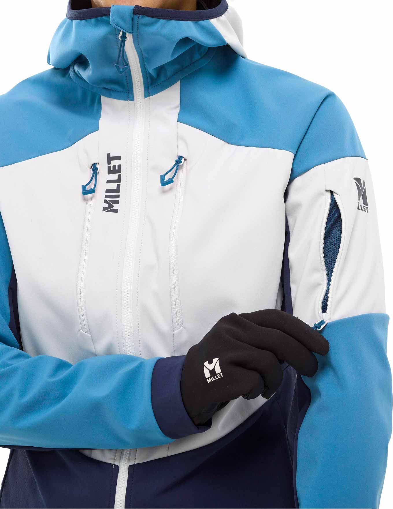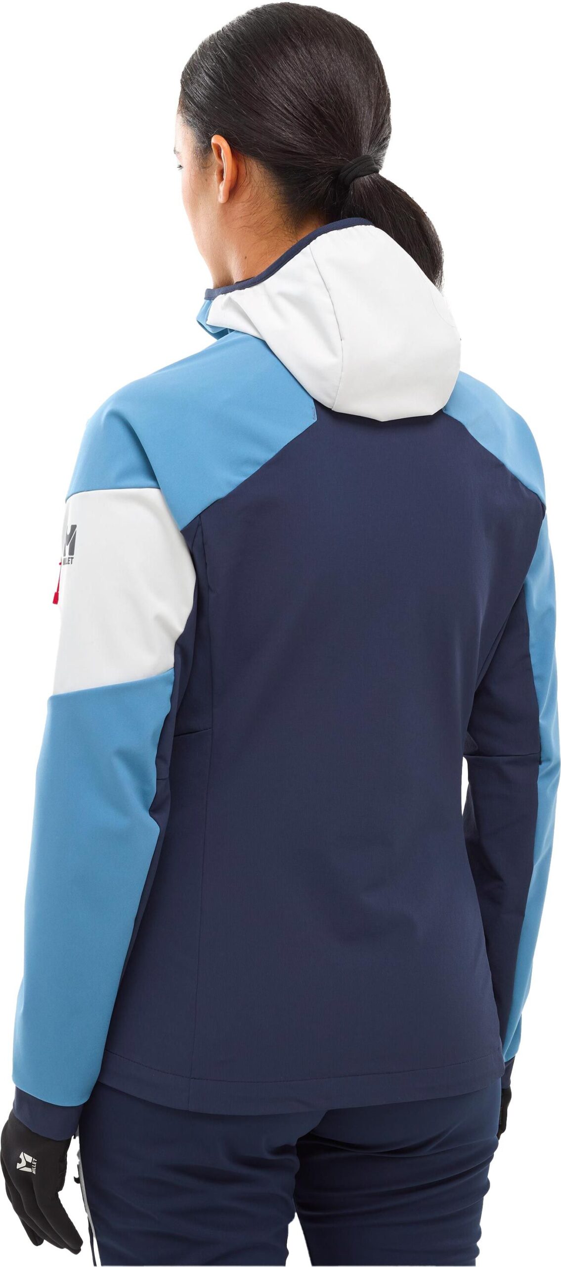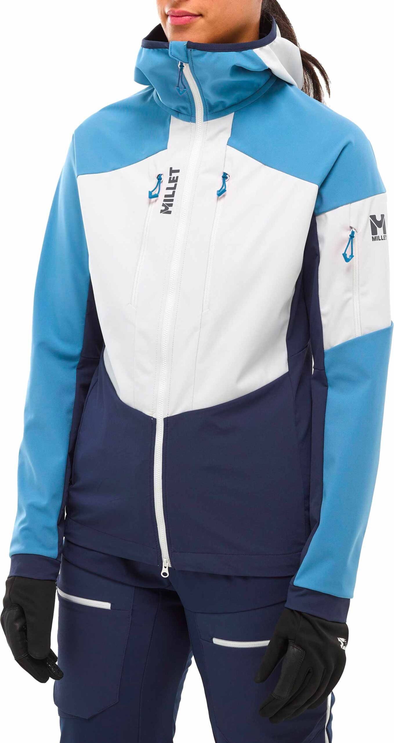 Veste Millet M White Shield Jkt pour femme, conçue pour le ski de randonnée intense en altitude. Stretch mécanique, Element Shield™ imperméable coupe-vent, capuche ajustée, poches peaux et ventilation latérale.