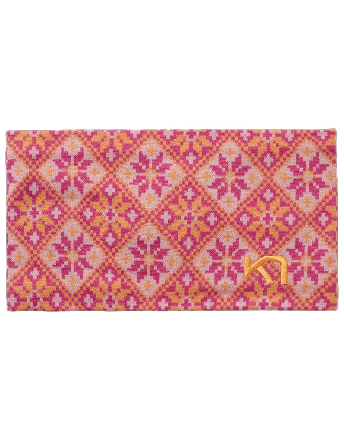 Bandeau Kari Traa Rose Headband Pink en laine mérinos ultra-fin, chaud et respirant, motifs flocons, séchage rapide, doublé pour le confort féminin en hiver.