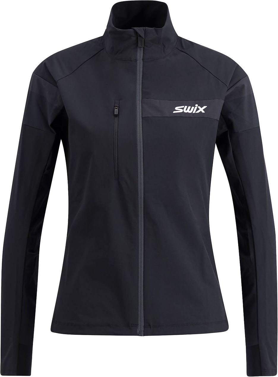 Veste Swix Focus Jacket Black/Black femme, softshell léger et respirant pour le ski nordique, liberté de mouvement, poches sécurisées et bande réfléchissante au dos.