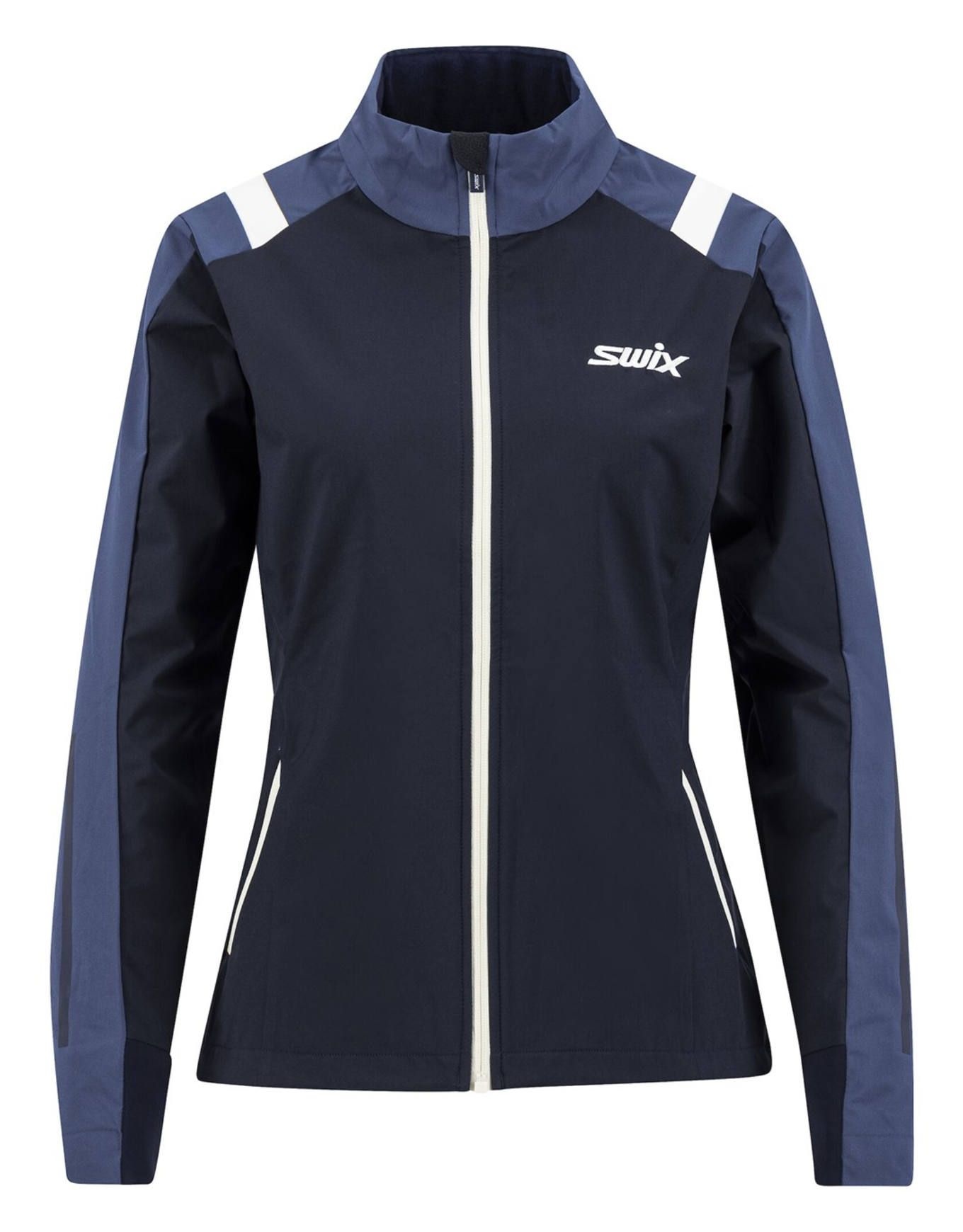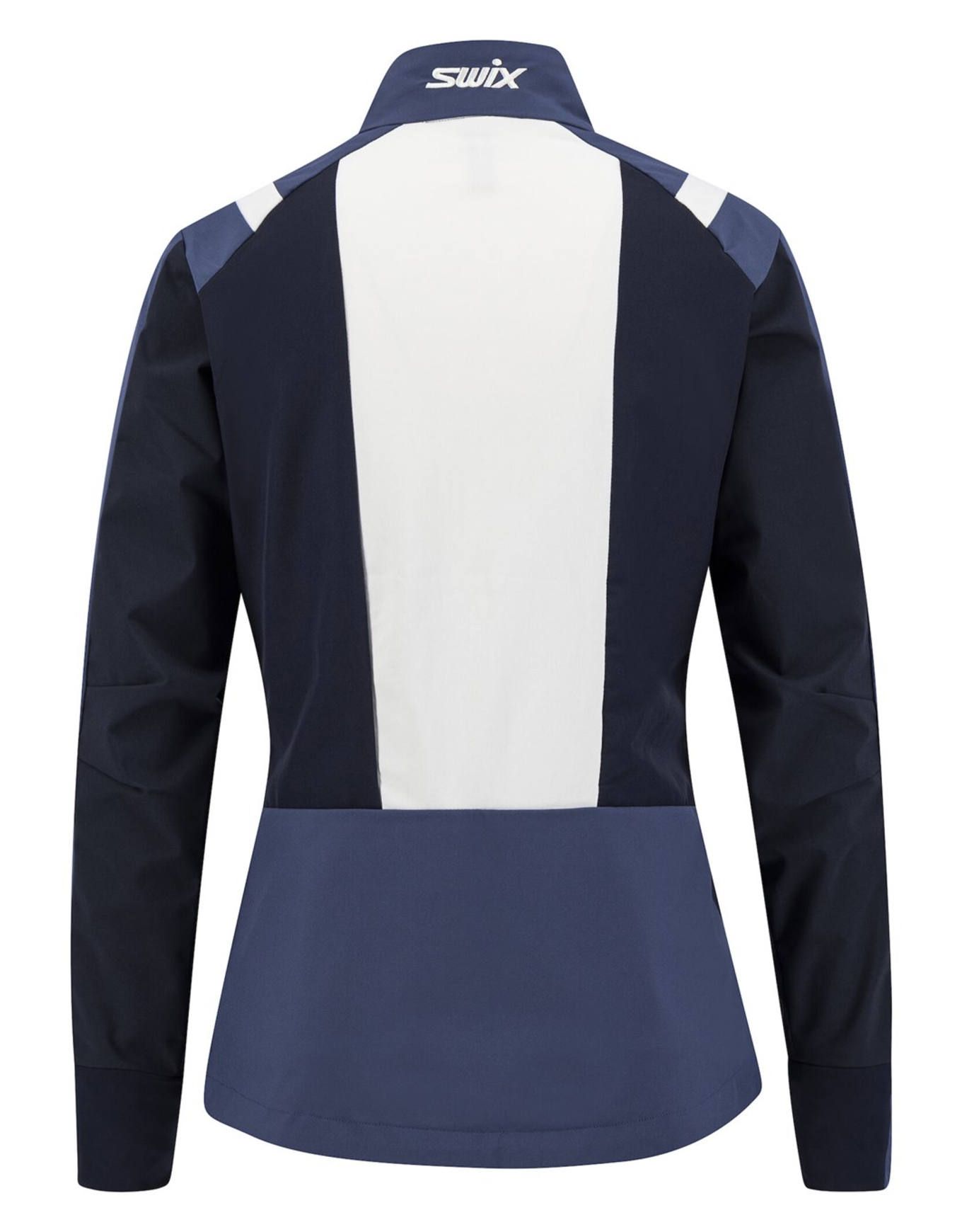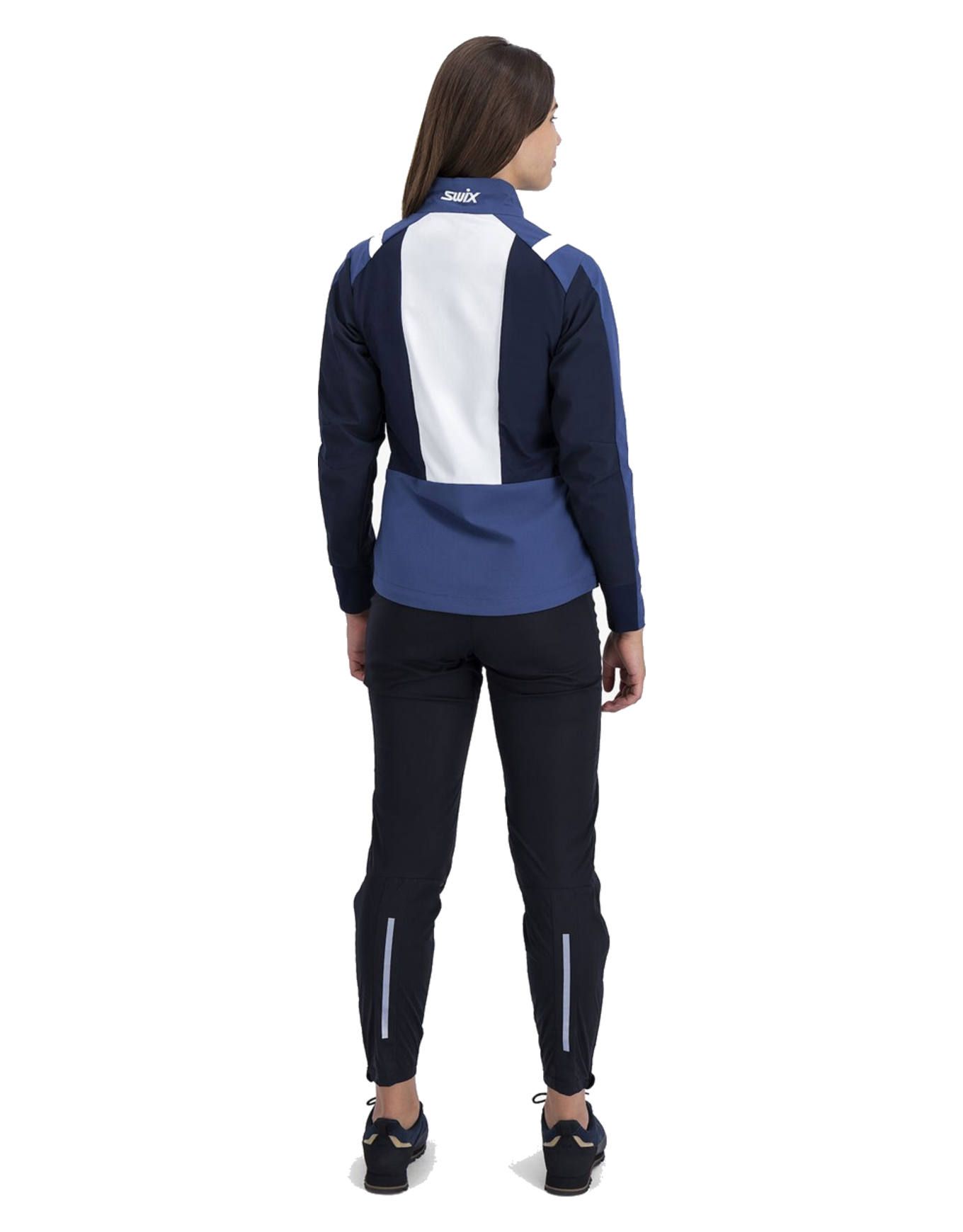 Veste Swix Infinity Jacket Lake Blue pour femme, coupe-vent et déperlante, respirante à l’avant, extensible au dos pour liberté de mouvement en ski nordique.