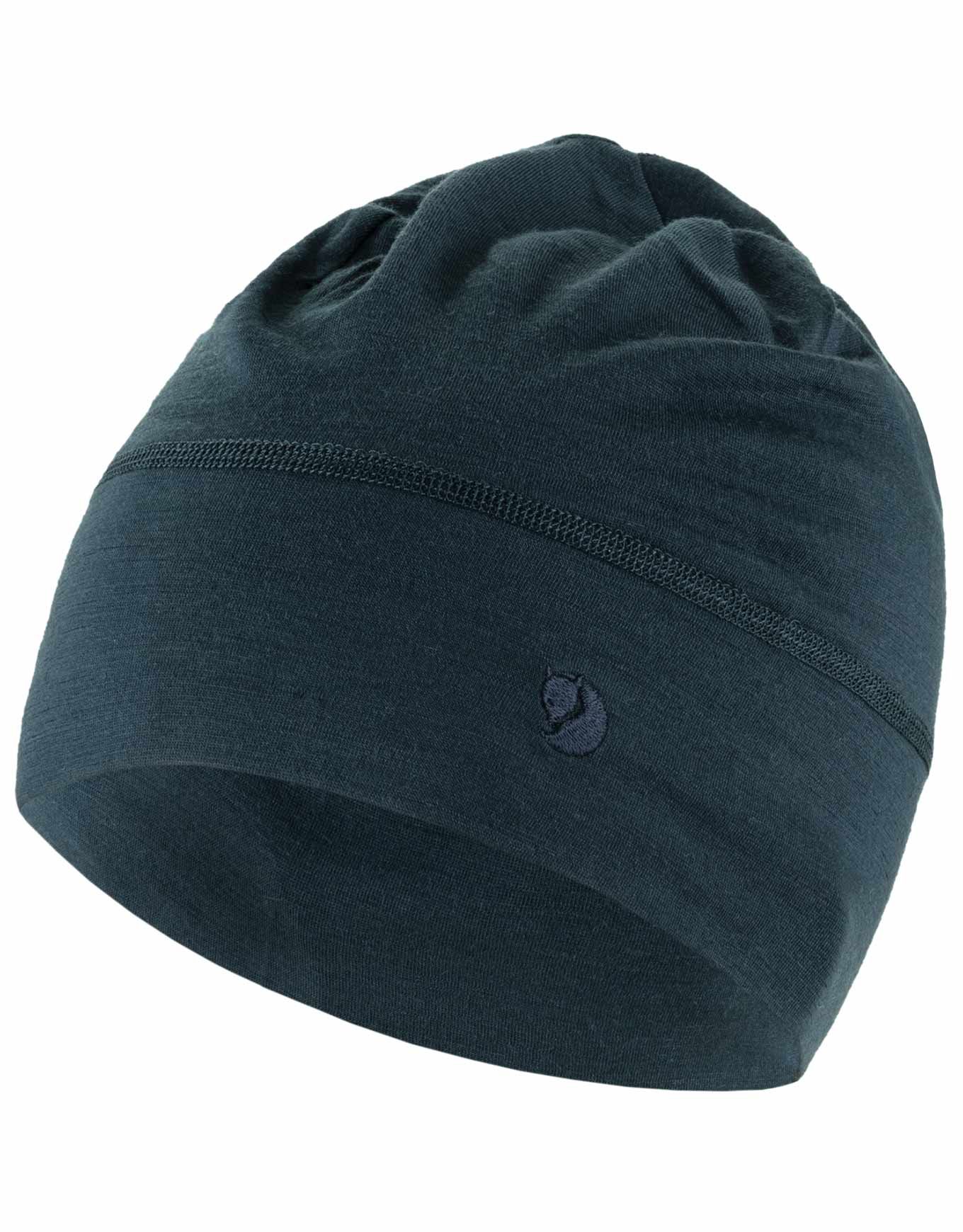 Le bonnet Abisko Lite Wool Dark Navy unisexe de Fjällräven, fin et léger en laine mérinos et polyester traçable, évacue l’humidité et glisse facilement sous un casque pour un confort chaud sans bulk.