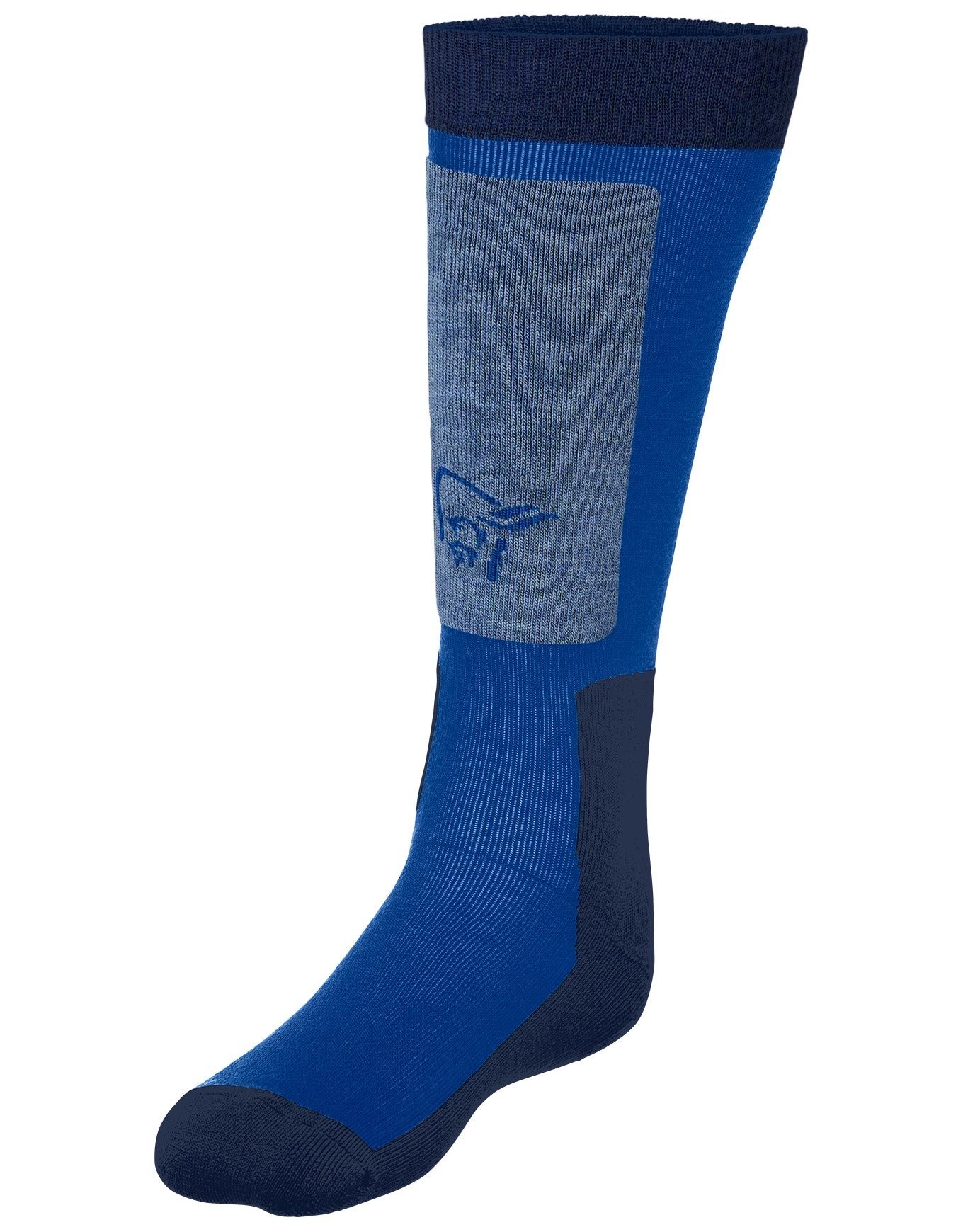 Norrona Lofoten Mid Weight Merino Socks Long Limoges : chaussettes hautes unisexe en laine mérinos pour freeride ski ou snowboard, chaleur, respirabilité et séchage rapide avec zones de soutien ciblées.