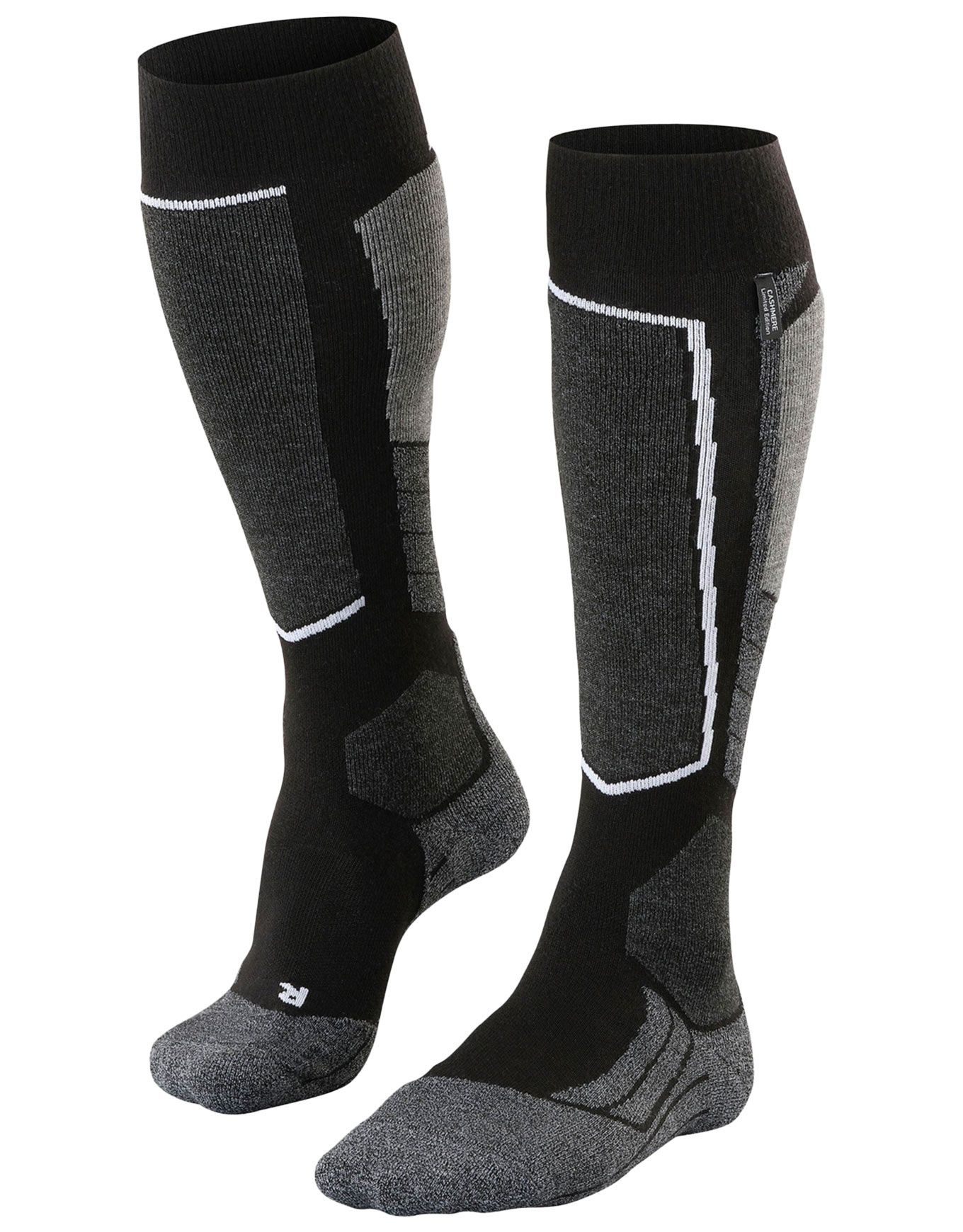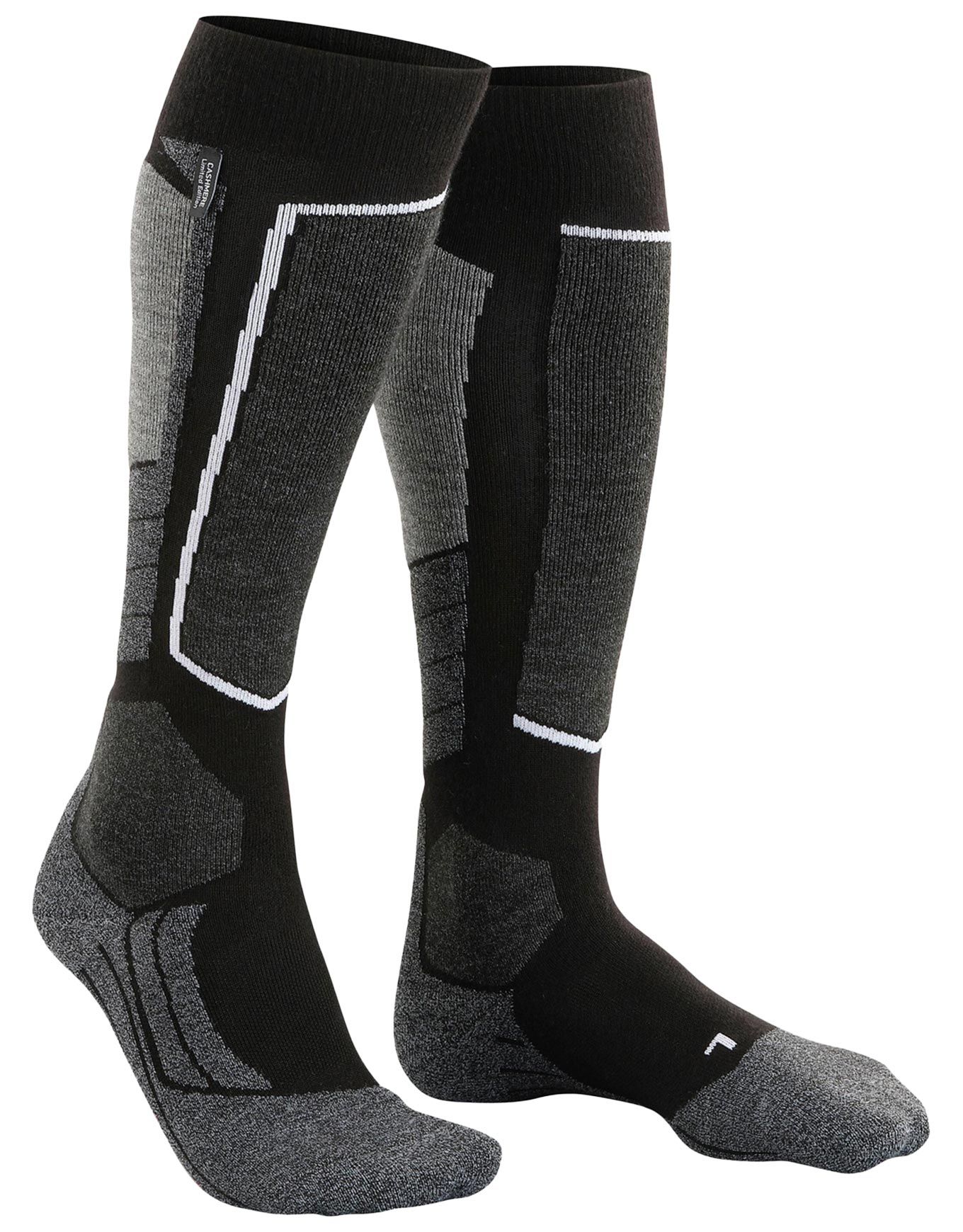 Chaussettes de ski Falke SK2 Intermediate Cashmere Black Mix pour homme, à amorti moyen pour un équilibre vitesse-contrôle. Construction 3 couches en laine mérinos et soie, évacuation efficace de l’humidité, rembourrage tibias-cheville, ajustement optimal.