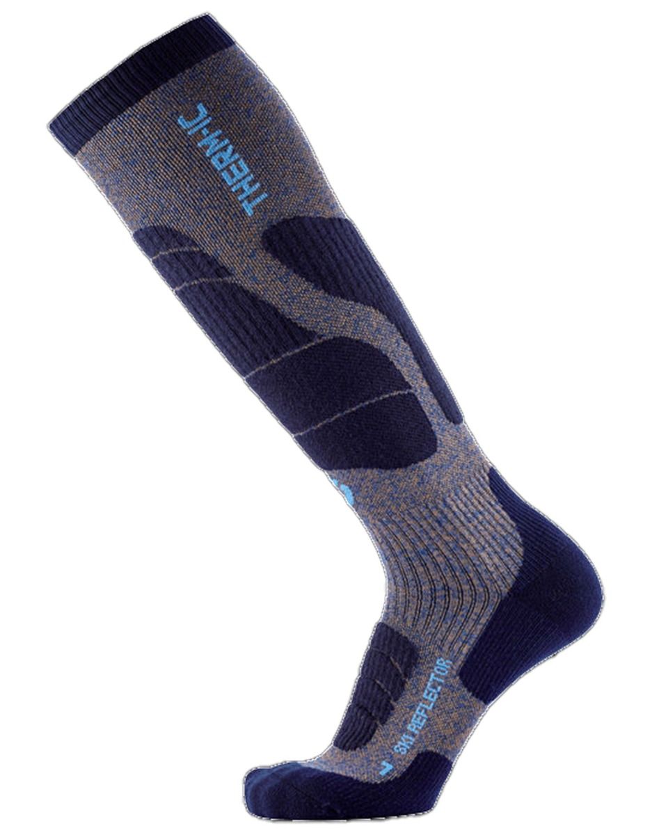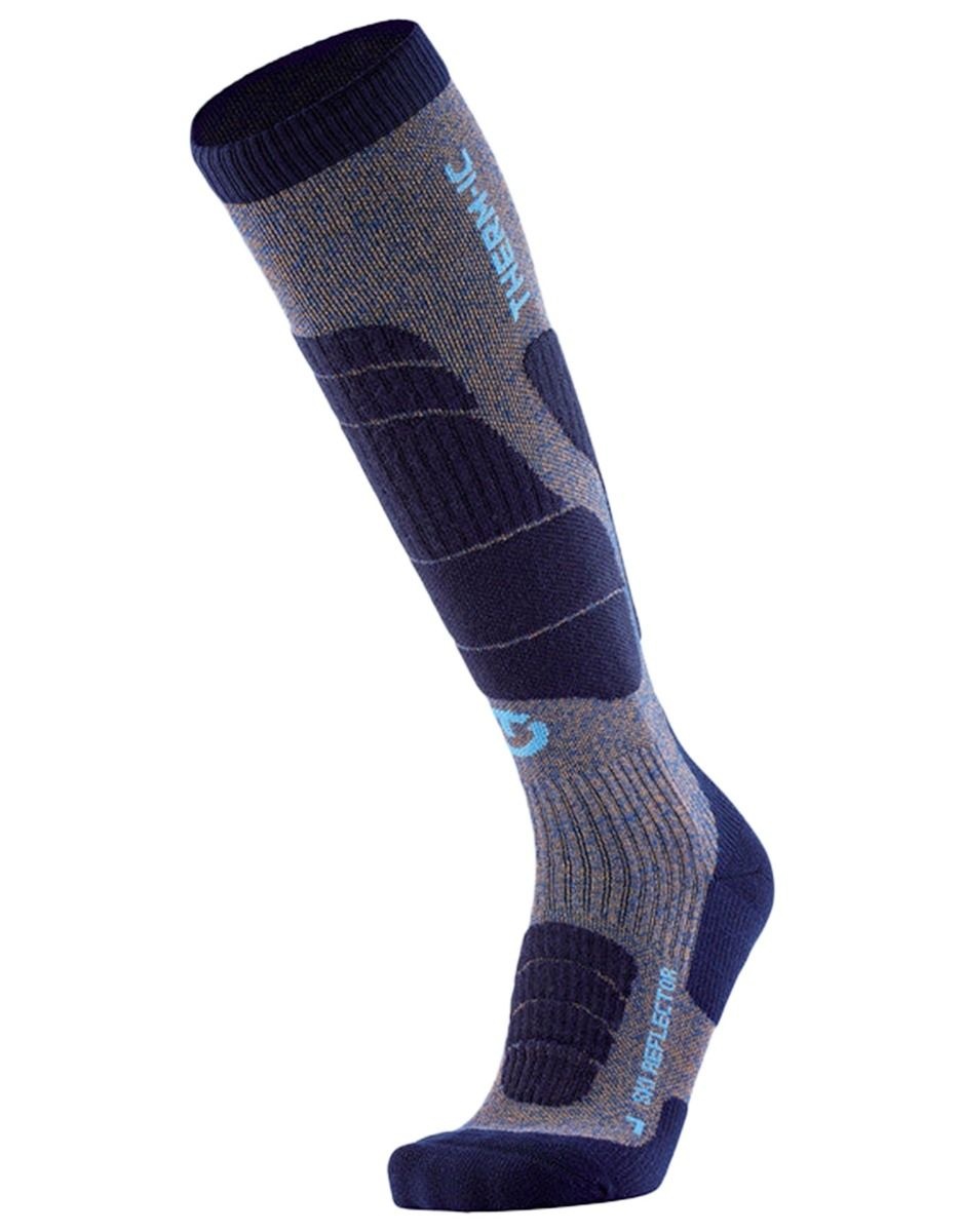 Chaussettes de ski Therm-ic Ski Merino Reflector homme, mélange laine mérinos et Warm Reflector pour isolation thermique et évacuation rapide de l’humidité. Anti-odeurs, anatomiques, renforts talon-orteils et protections tibia-mollet pour un confort ciblé.