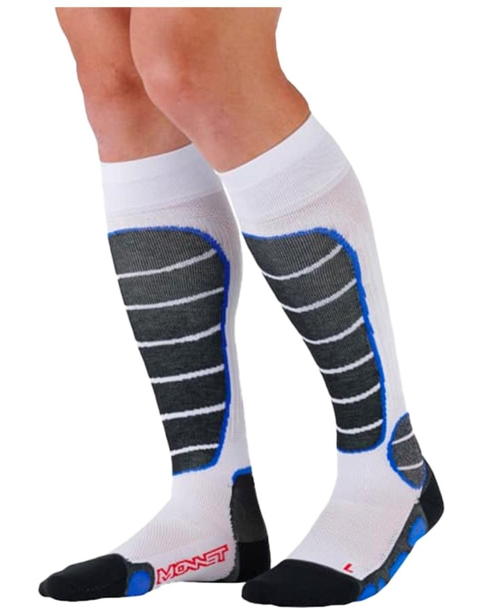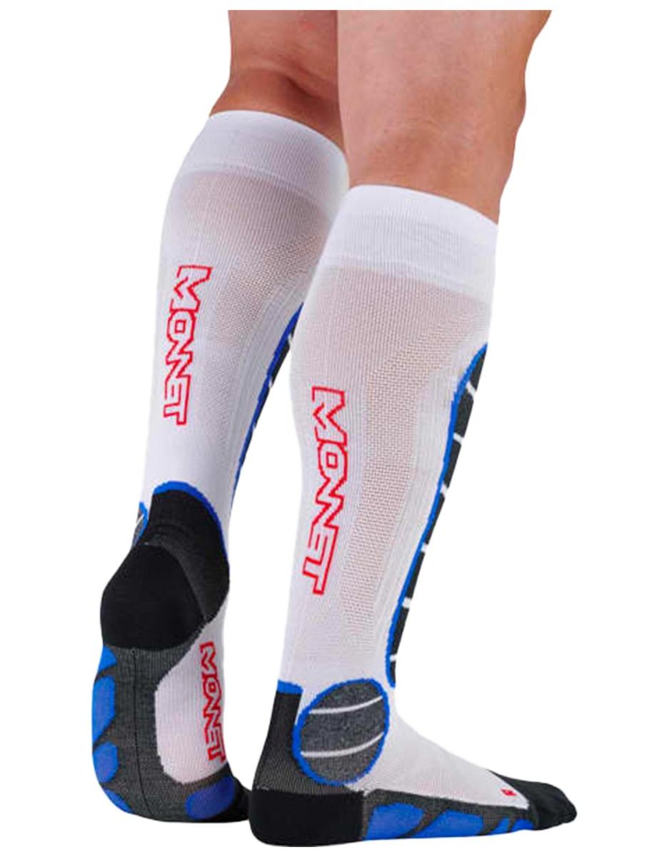 Chaussettes de ski compétition unisexes Monnet Ski Racing, matières synthétiques séchage rapide, renforts talons orteils Friction-Free®, bandes Skin Tech®, ventilation active.