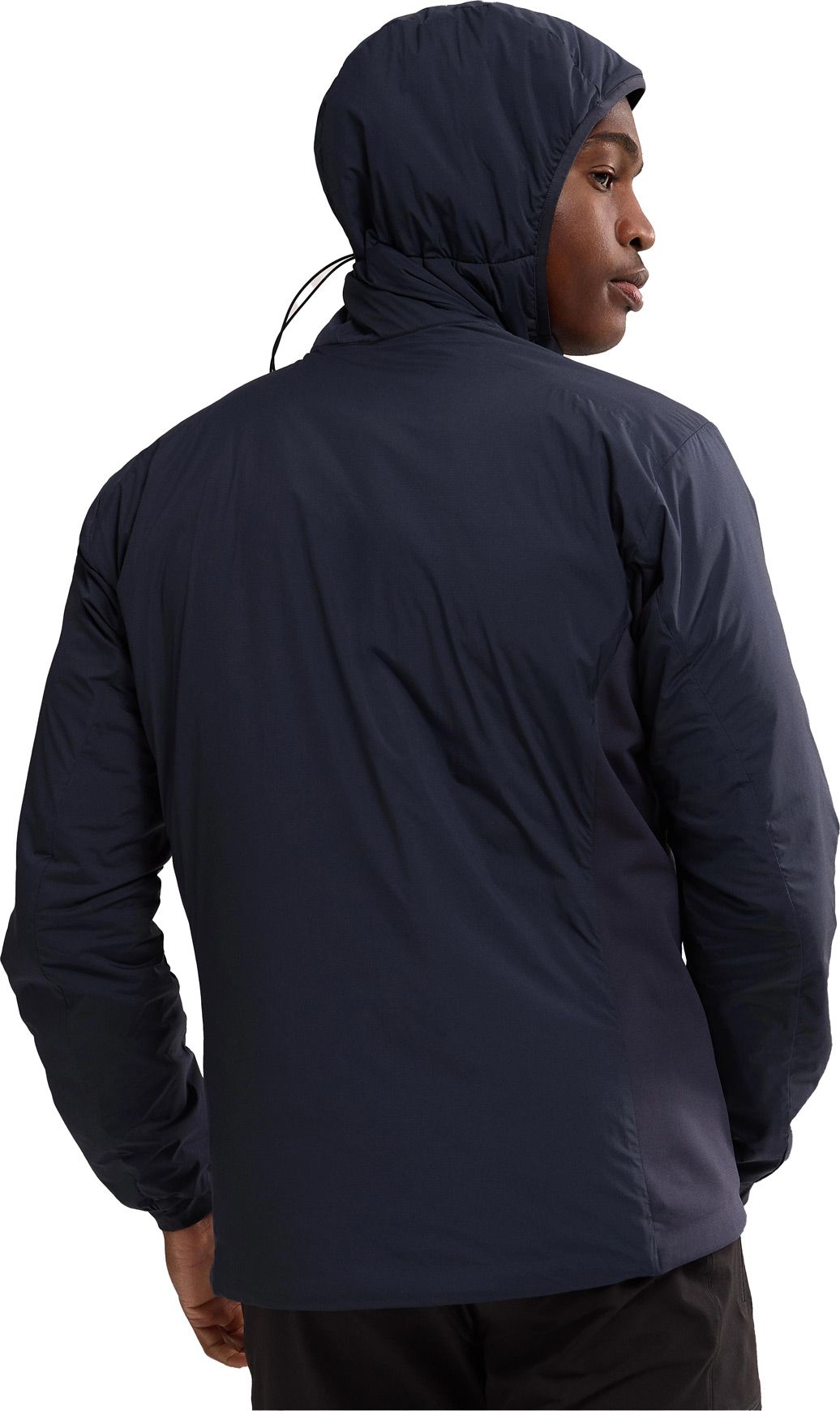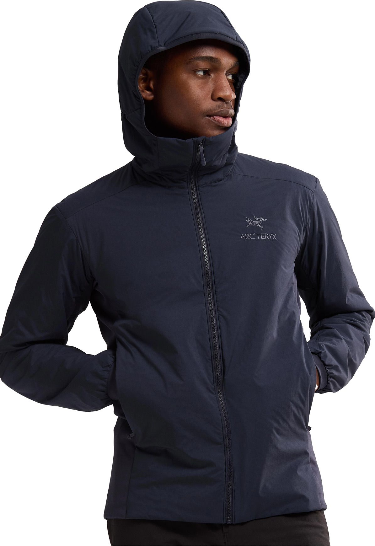 Veste d’isolation Atom Hoody Black Sapphire Arc’teryx homme, en Coreloft™ Compact et Tyono™ 20 respirant, coupe ajustée, capuche StormHood™ compatible casque, poches sécurisées, idéale seule ou sous hardshell.