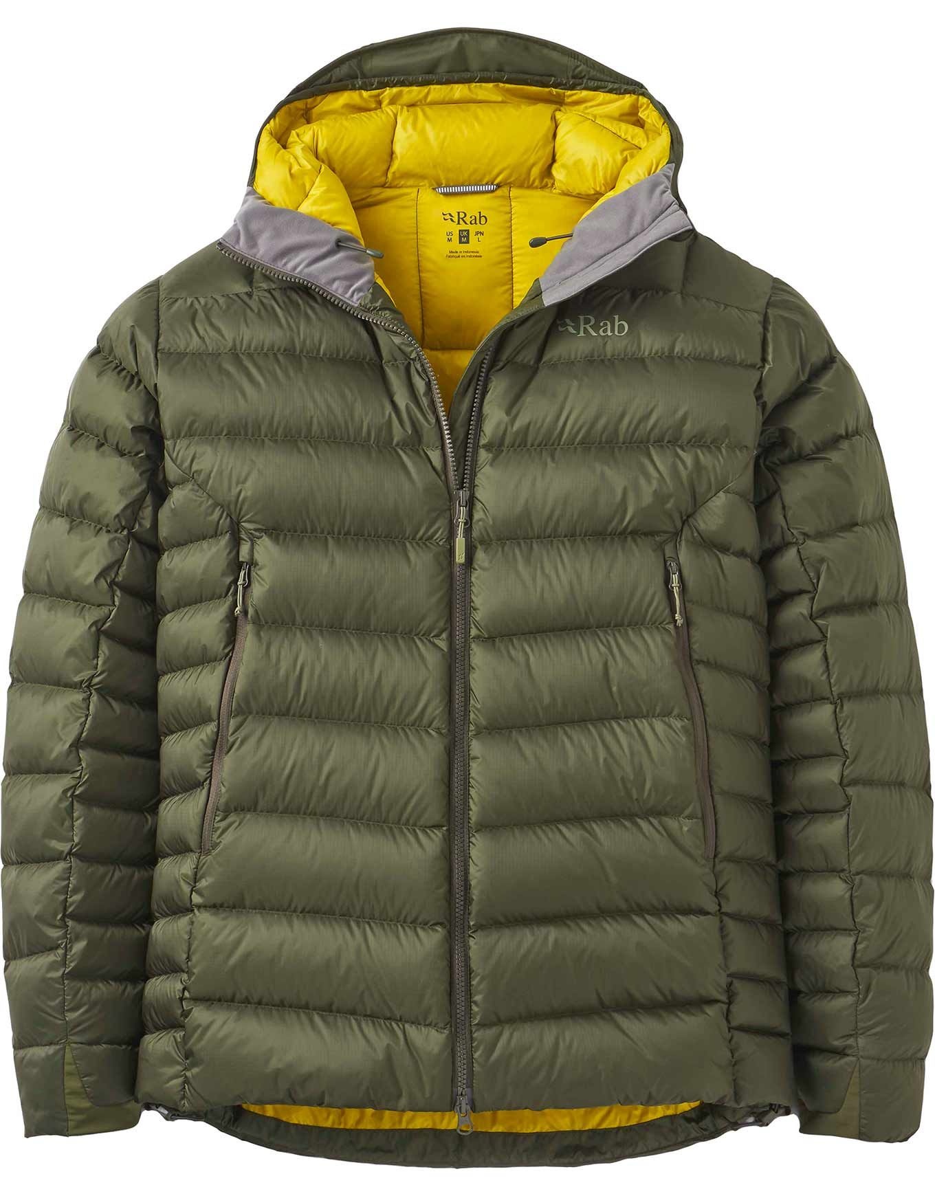 Doudoune Electron Pro Hoody Army Rab homme : isolation 800 FP, tissu Pertex® Quantum Pro recyclé, capuche casque-compatible, poche rangement intégrée.