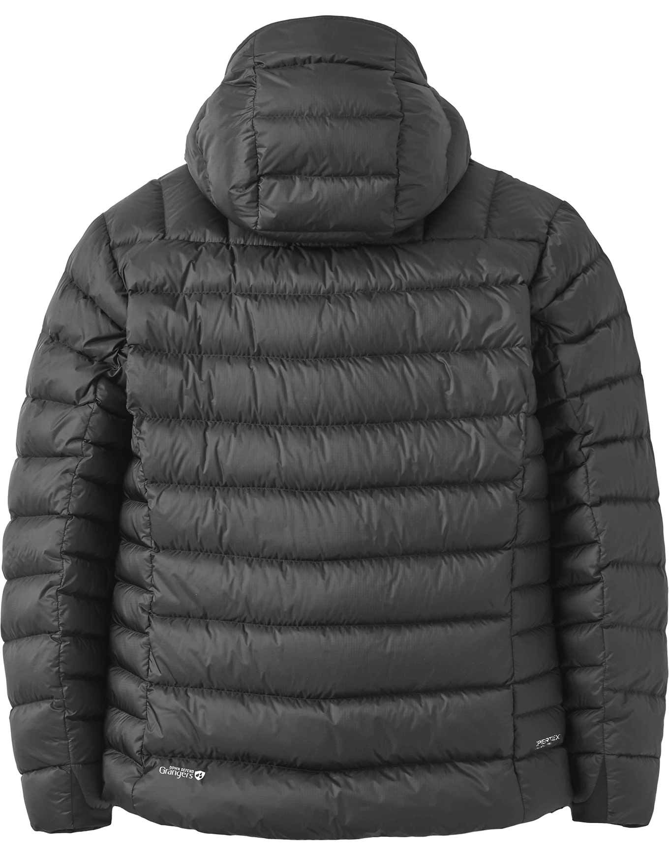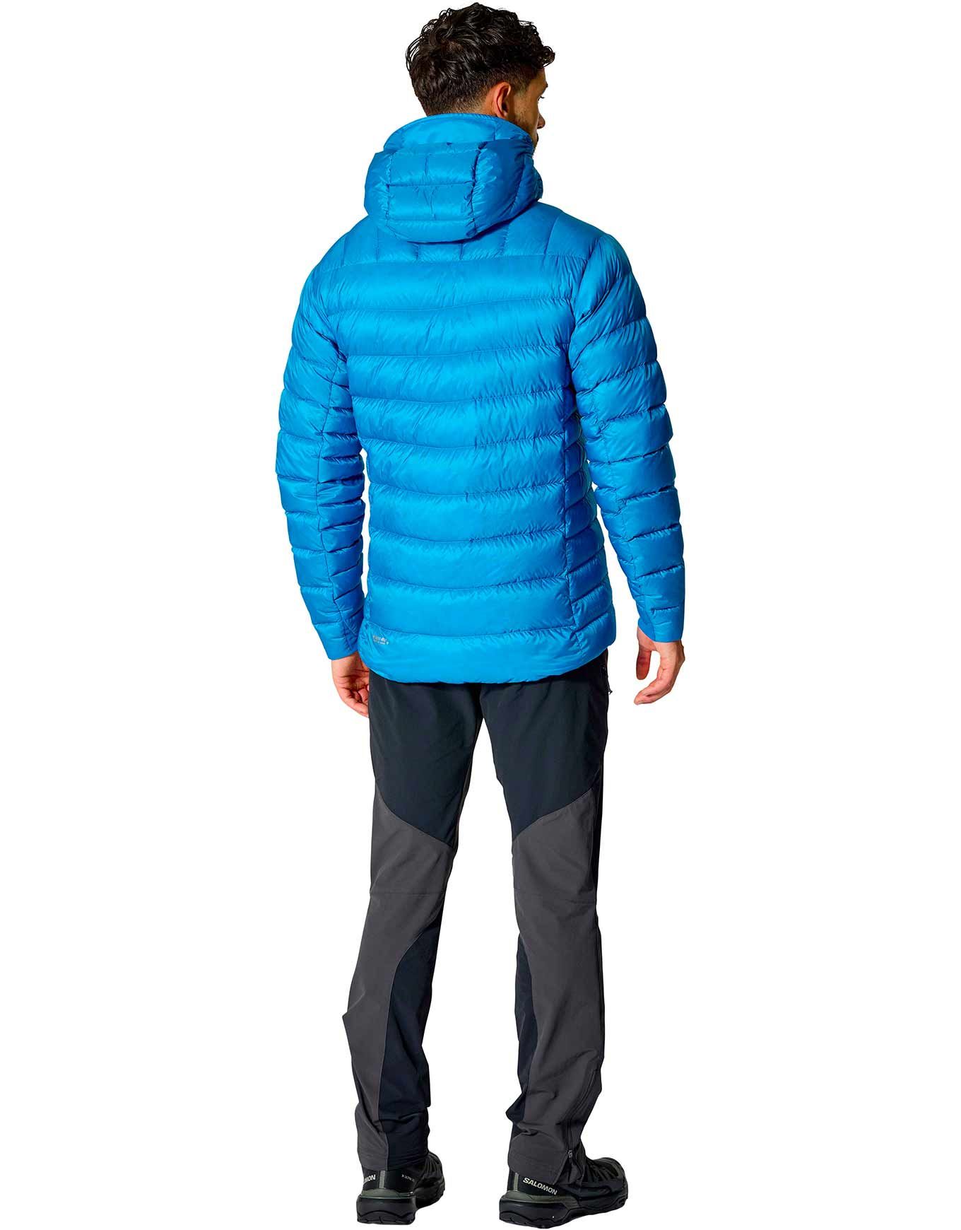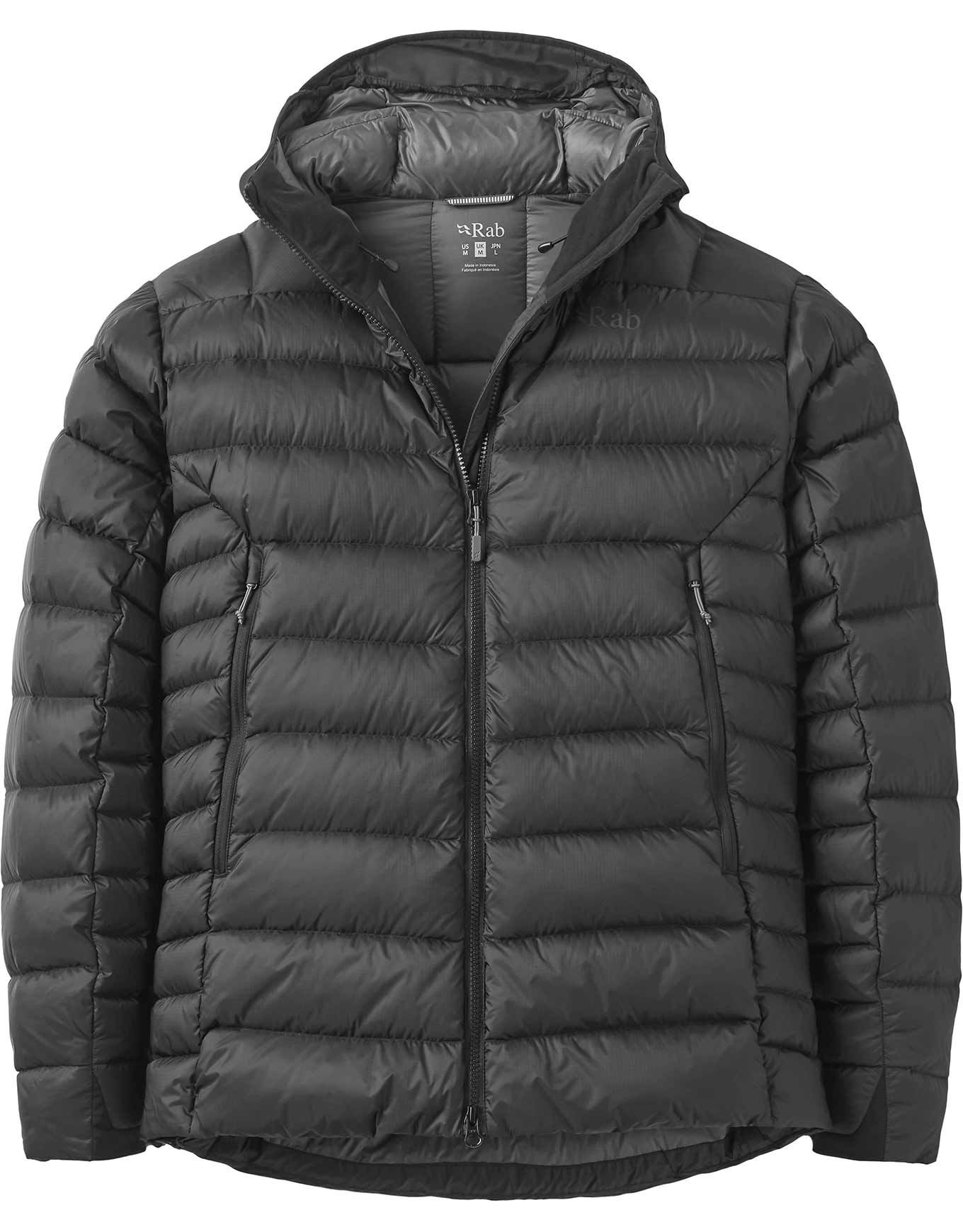 Doudoune Rab Electron Pro Hoody Black pour homme, conçue pour l’alpinisme hivernal et l’escalade, allie légèreté et chaleur avec son duvet d’oie 800 FP hydro-résistant et son tissu Pertex® Quantum Pro recyclé.