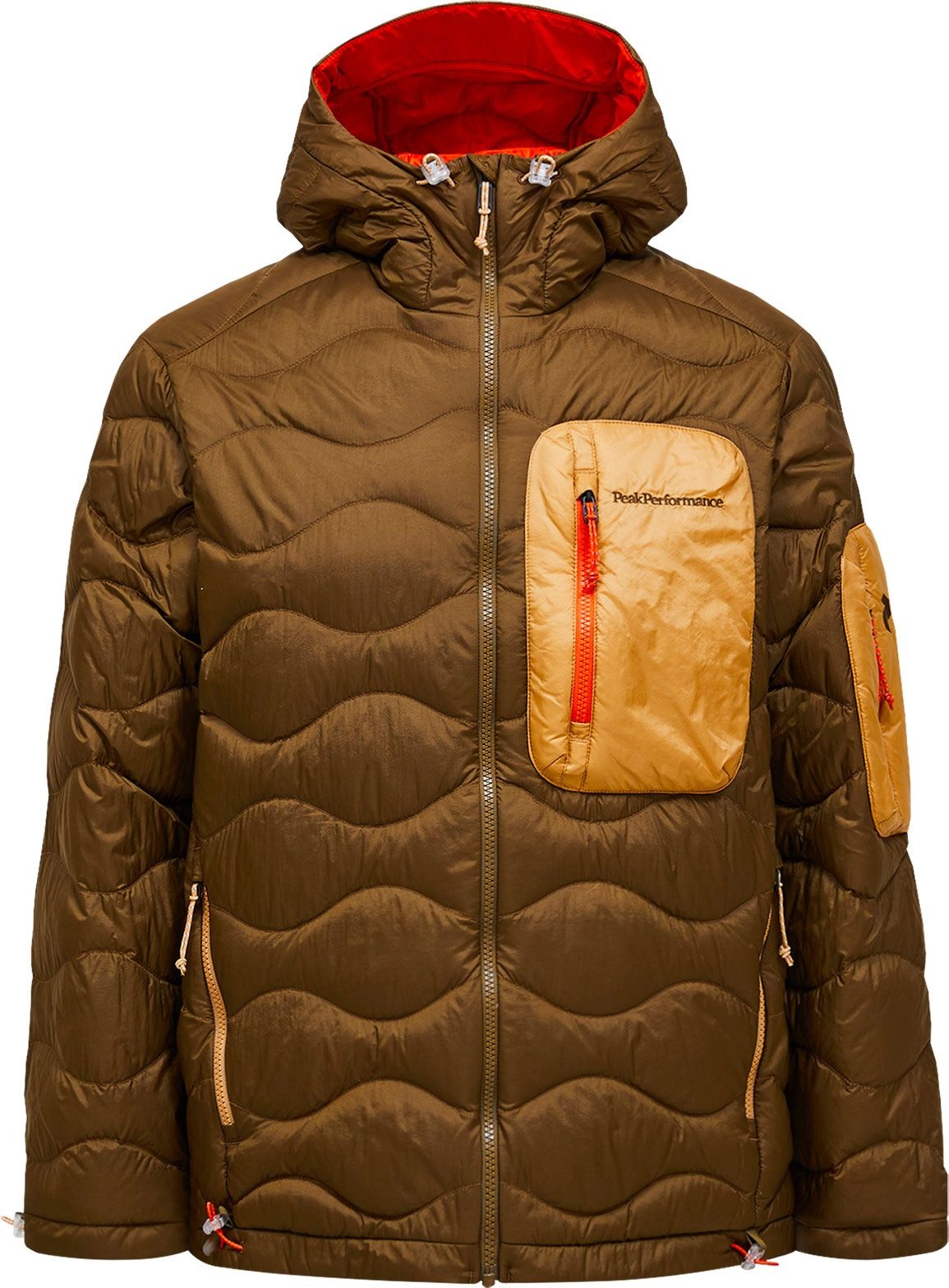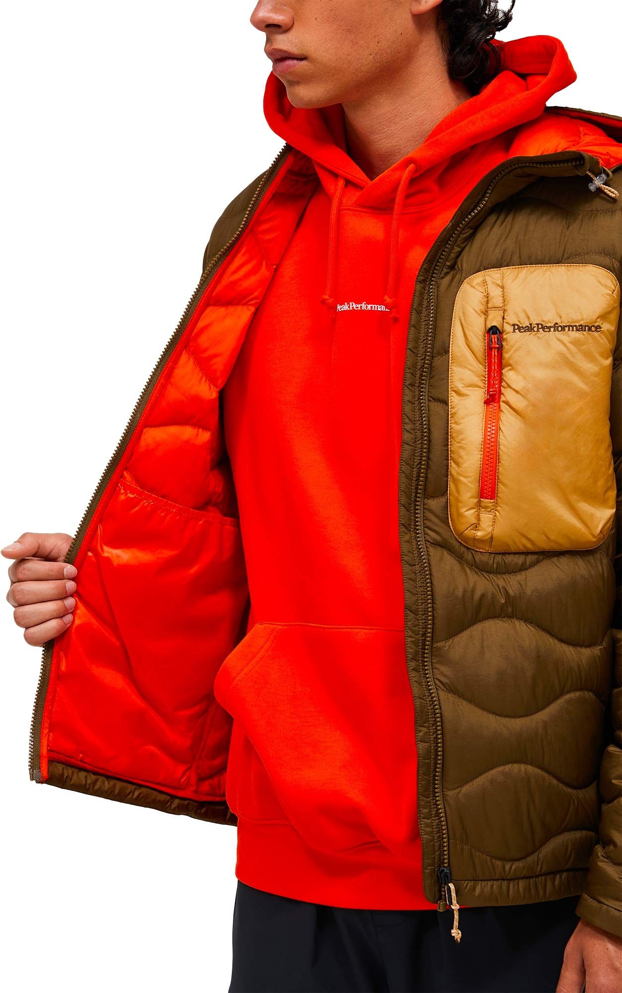Doudoune Helium Utility Down Hood Jacket Peak Performance homme Meadow Moss/Sierra Sand, isolante duvet canard 90/10 RDS, polyamide recyclé, capuche ajustable, poches zippées, compressible dans poche gauche.