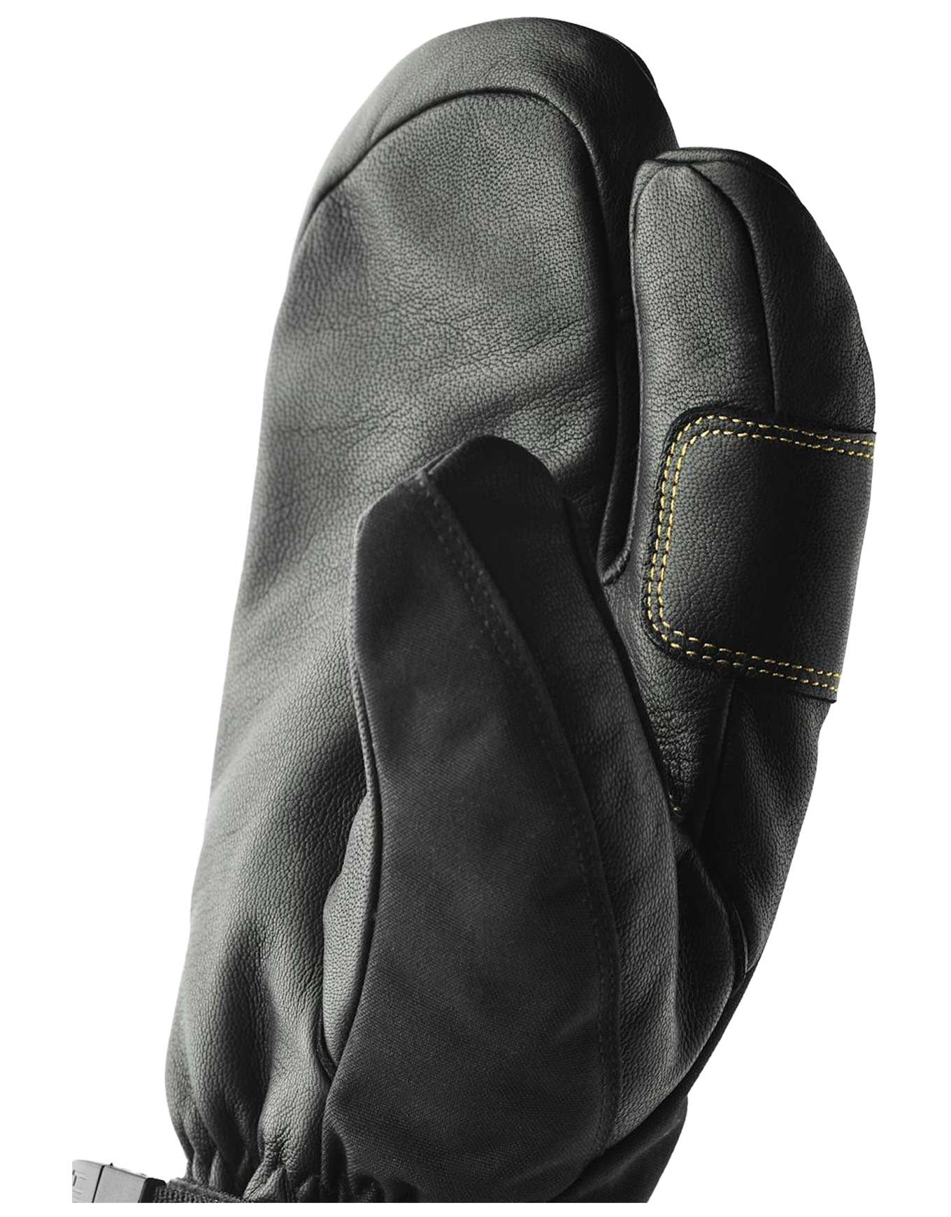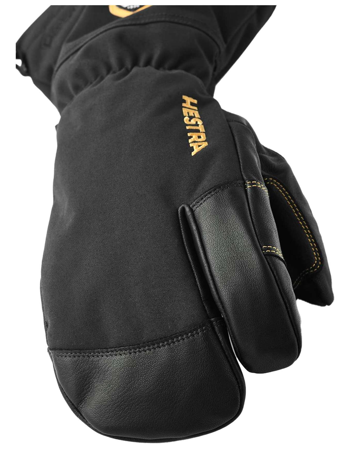Gants de ski 3 doigts Hestra Army Leather Gore-Tex imperméables coupe-vent, cuir chèvre et polyamide recyclé, isolation G-Loft, doublure Bemberg, manchette haute et dragonnes.
