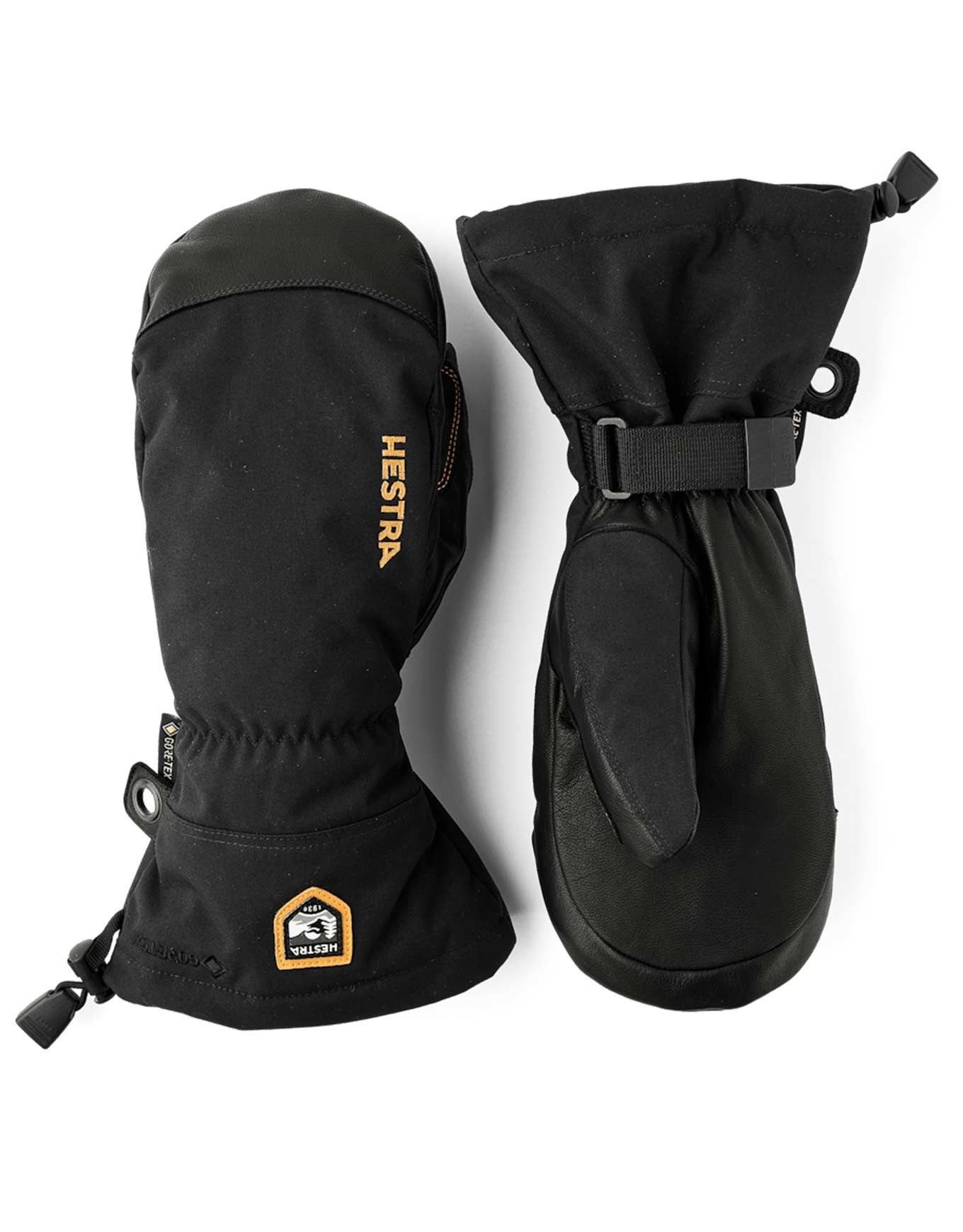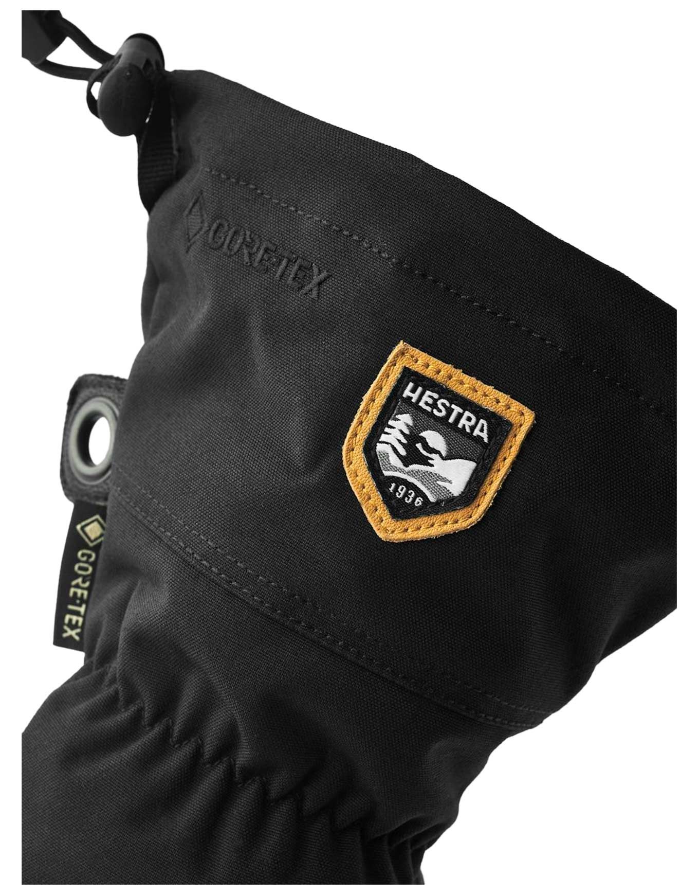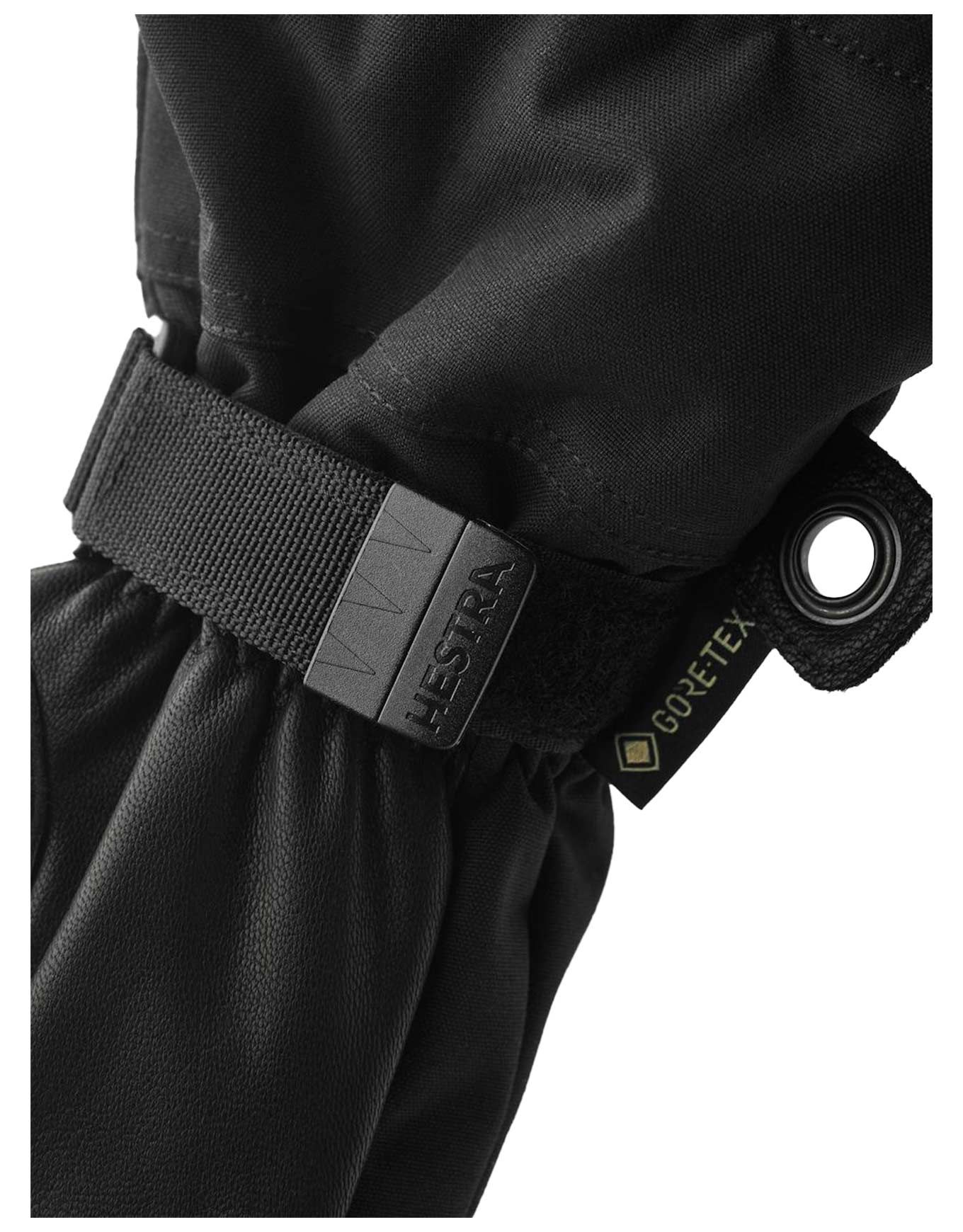 Moufles de ski Hestra Army Leather Gore-Tex Black/Black, coupe-vent et imperméables sans PFAS, en polyamide recyclé et cuir de chèvre traité. Isolation G-Loft, doublure Bemberg, manchette haute et réglage velcro pour chaleur et ajustement sécurisés.