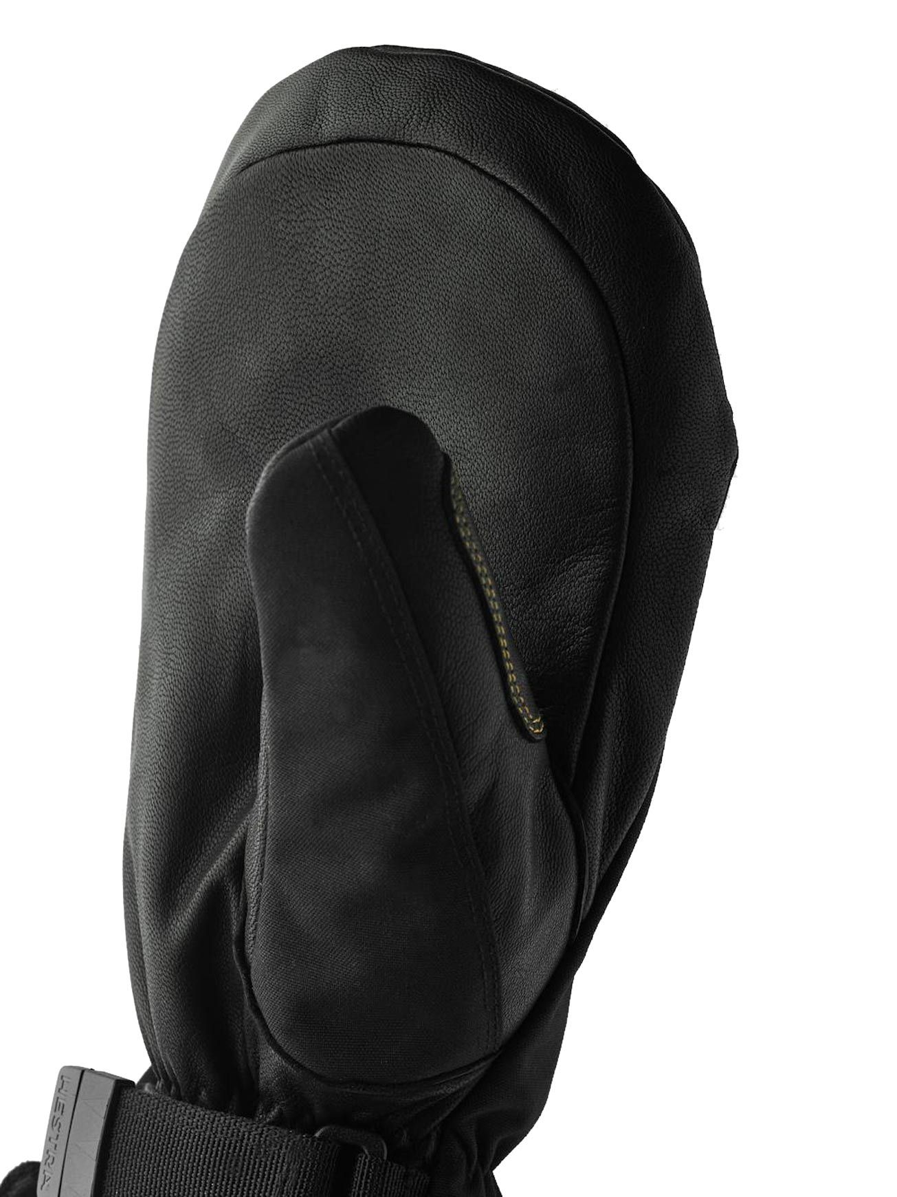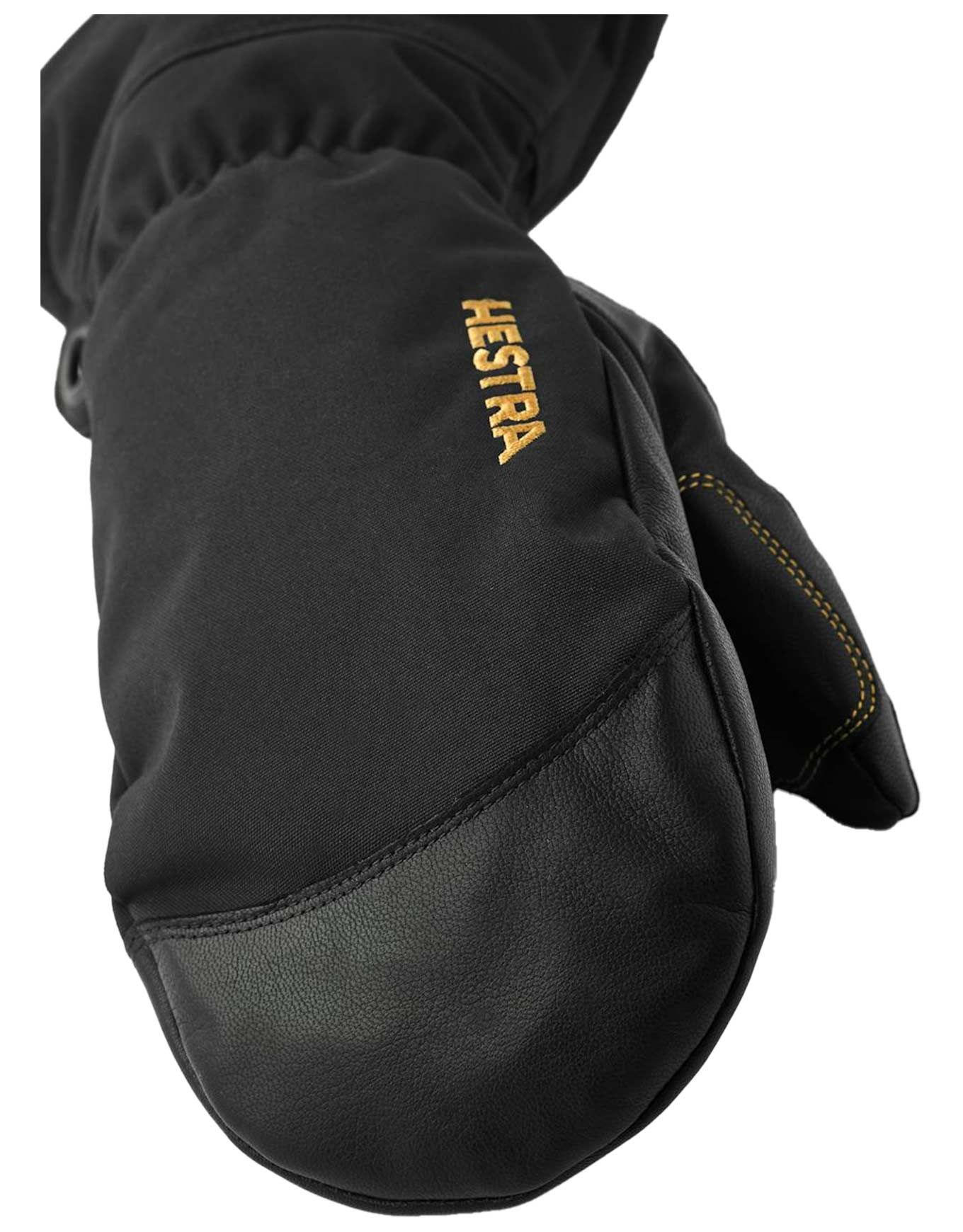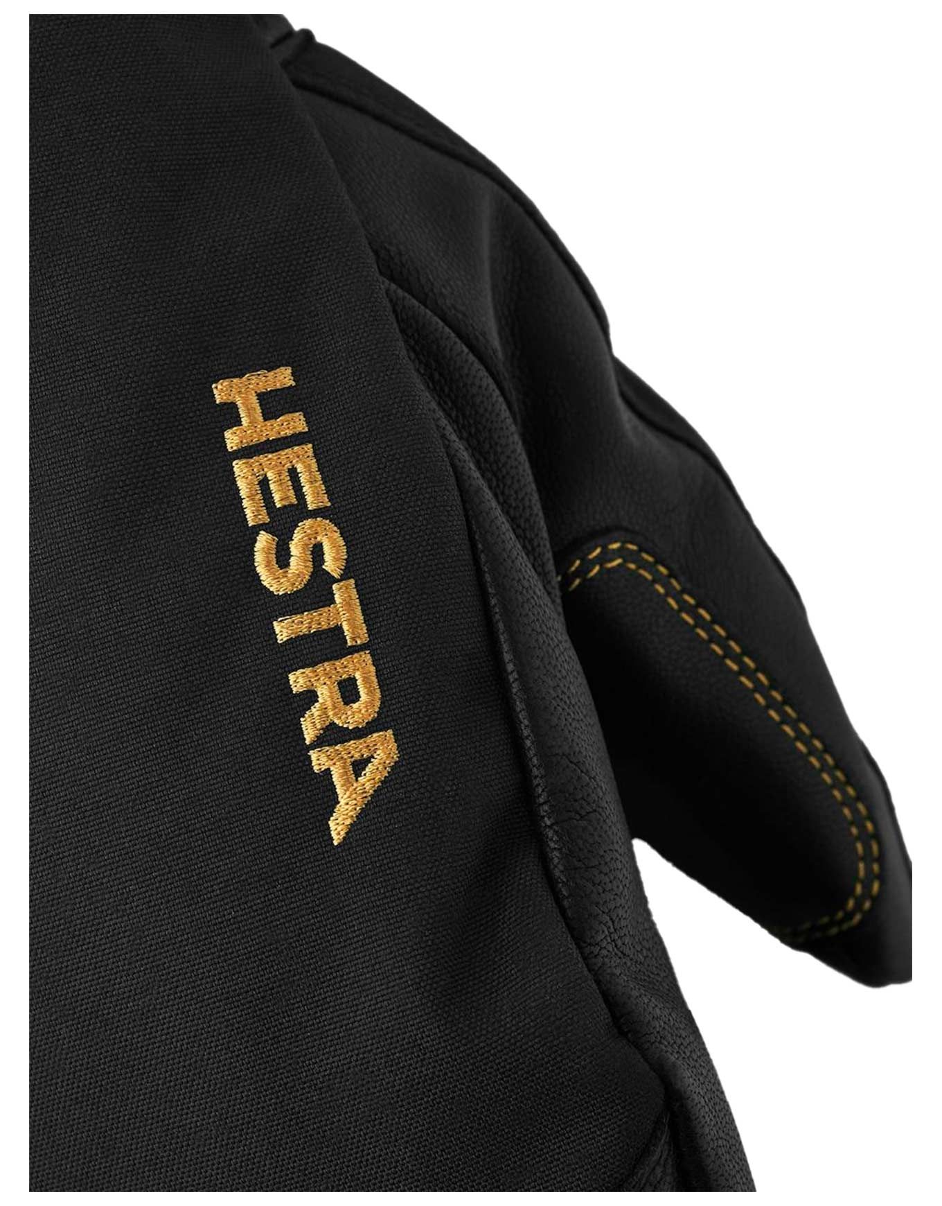 Moufles de ski Hestra Army Leather Gore-Tex Black/Black, coupe-vent et imperméables sans PFAS, en polyamide recyclé et cuir de chèvre traité. Isolation G-Loft, doublure Bemberg, manchette haute et réglage velcro pour chaleur et ajustement sécurisés.